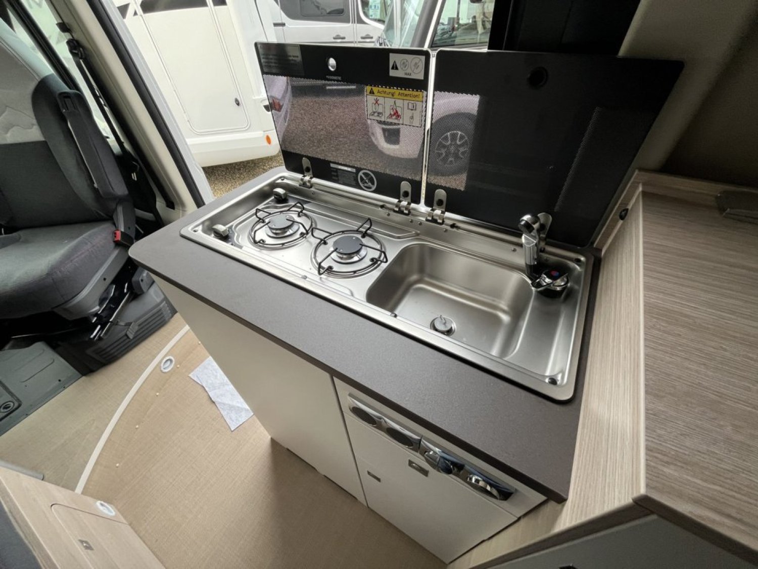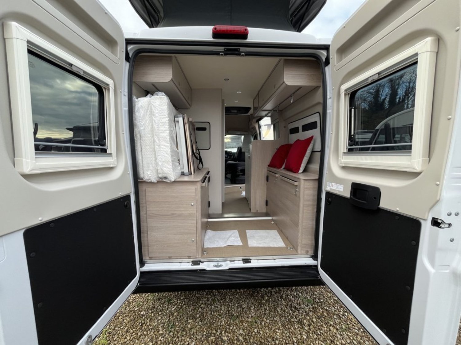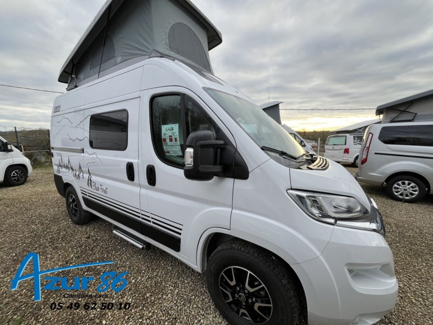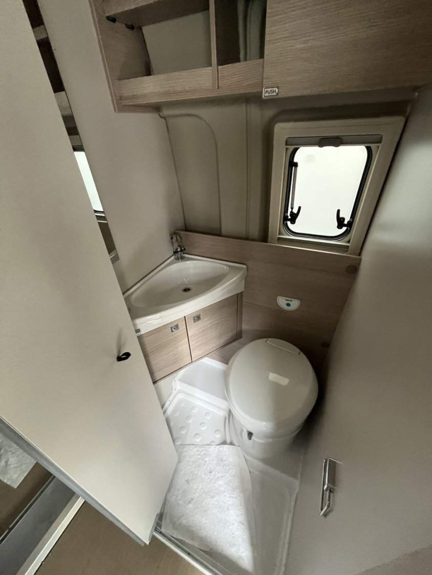 Bac de douche, Cuisine en long, Lit central transversal, Lit toit relevable, Salon avant sièges pivotants, WC Cassette.