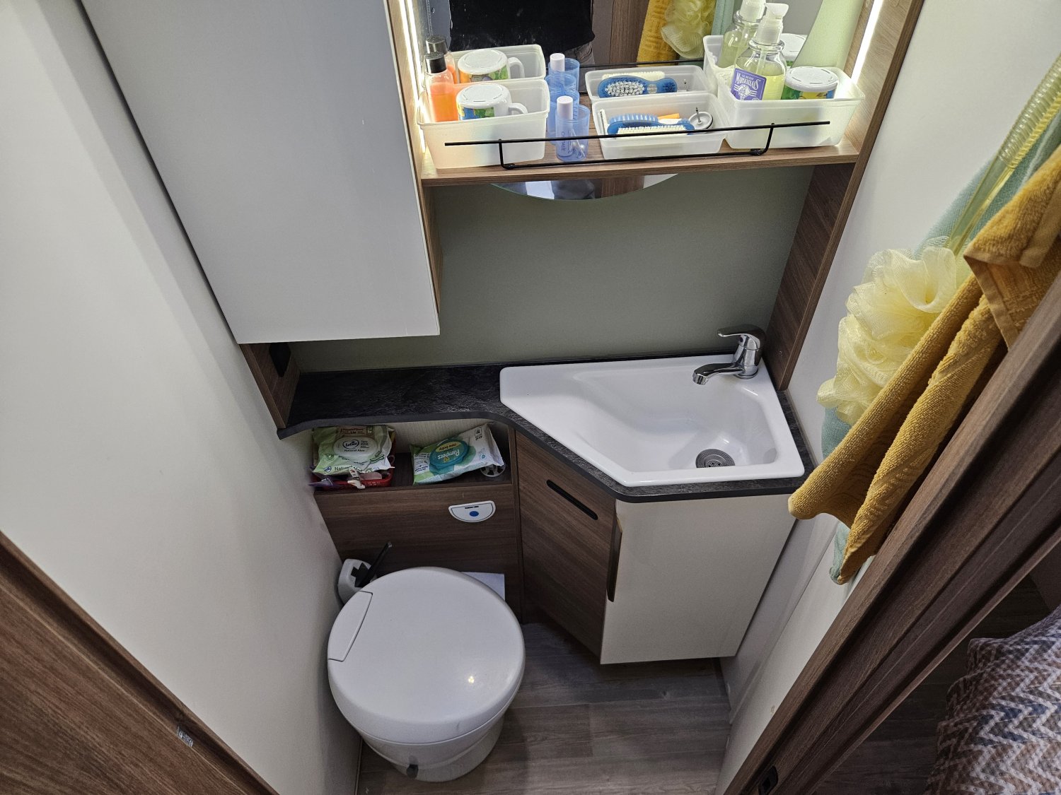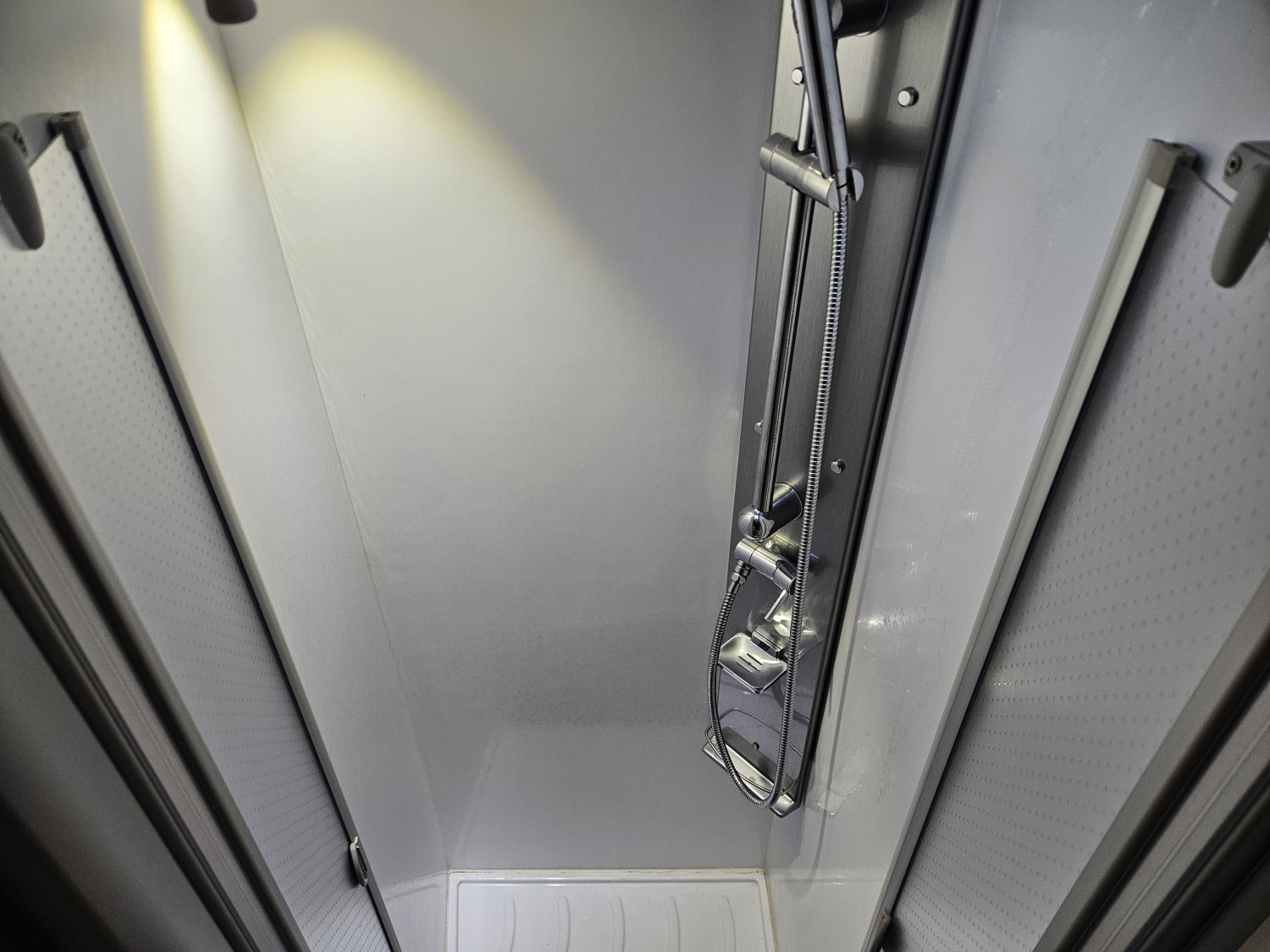 Une salle de bain avec douche et wc séparés sur une double cloison de séparation et un chauffage TRUMA Combi 4.