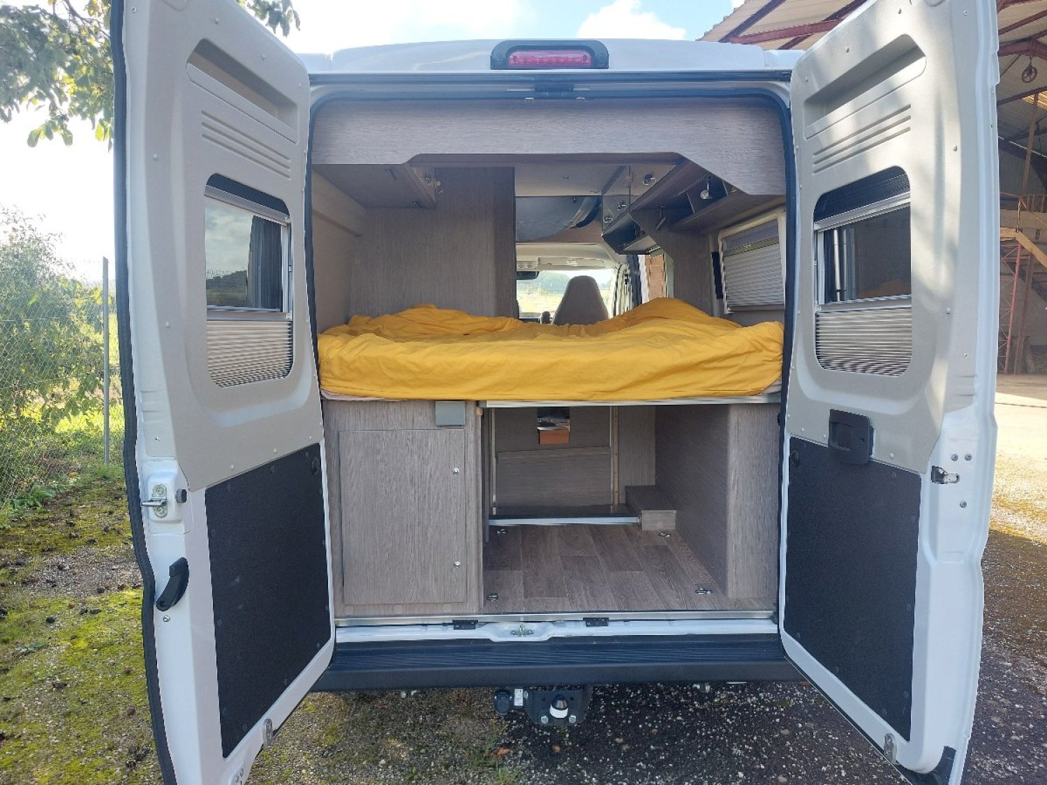 Fourgon aménagé avec toit relevable, 4 places carte grise et 4 couchages.