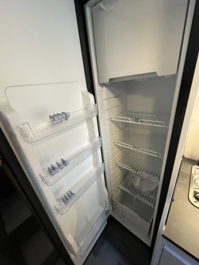 La cuisine est fonctionnelle et bien pensée, équipée d’un réfrigérateur à compression de 135 L.