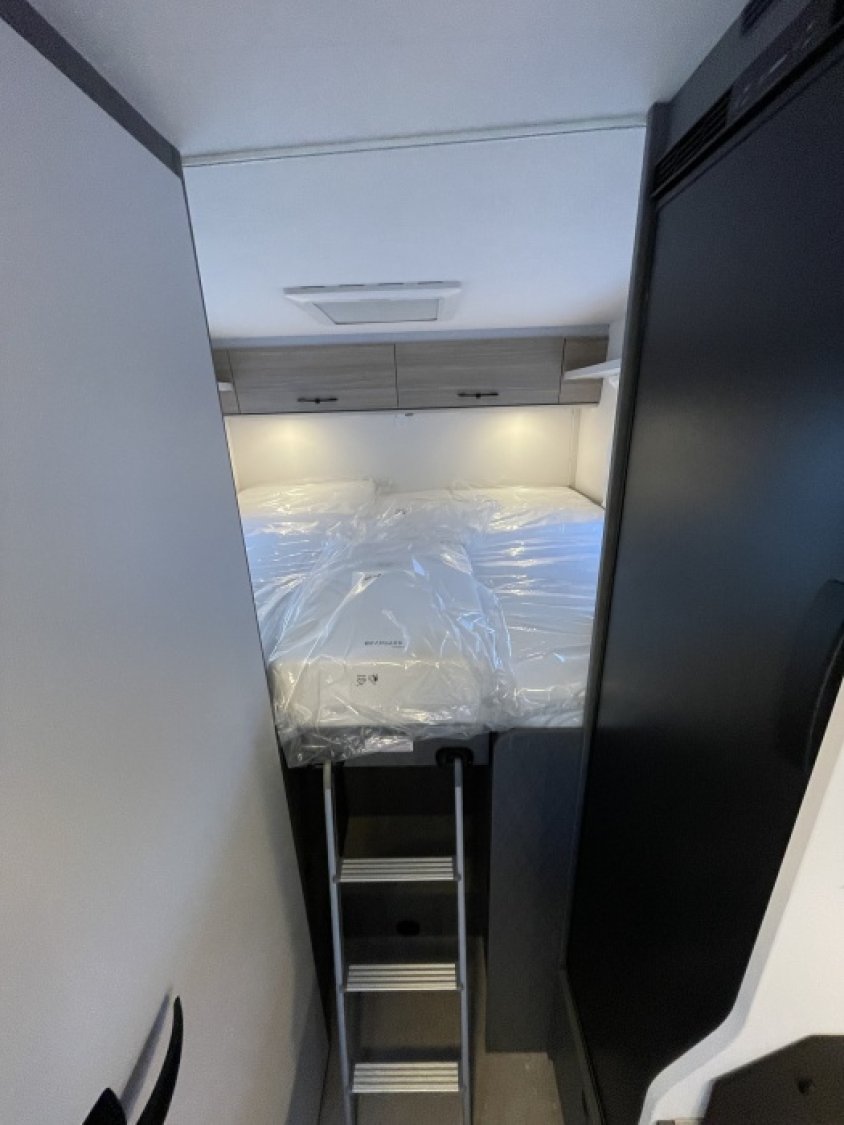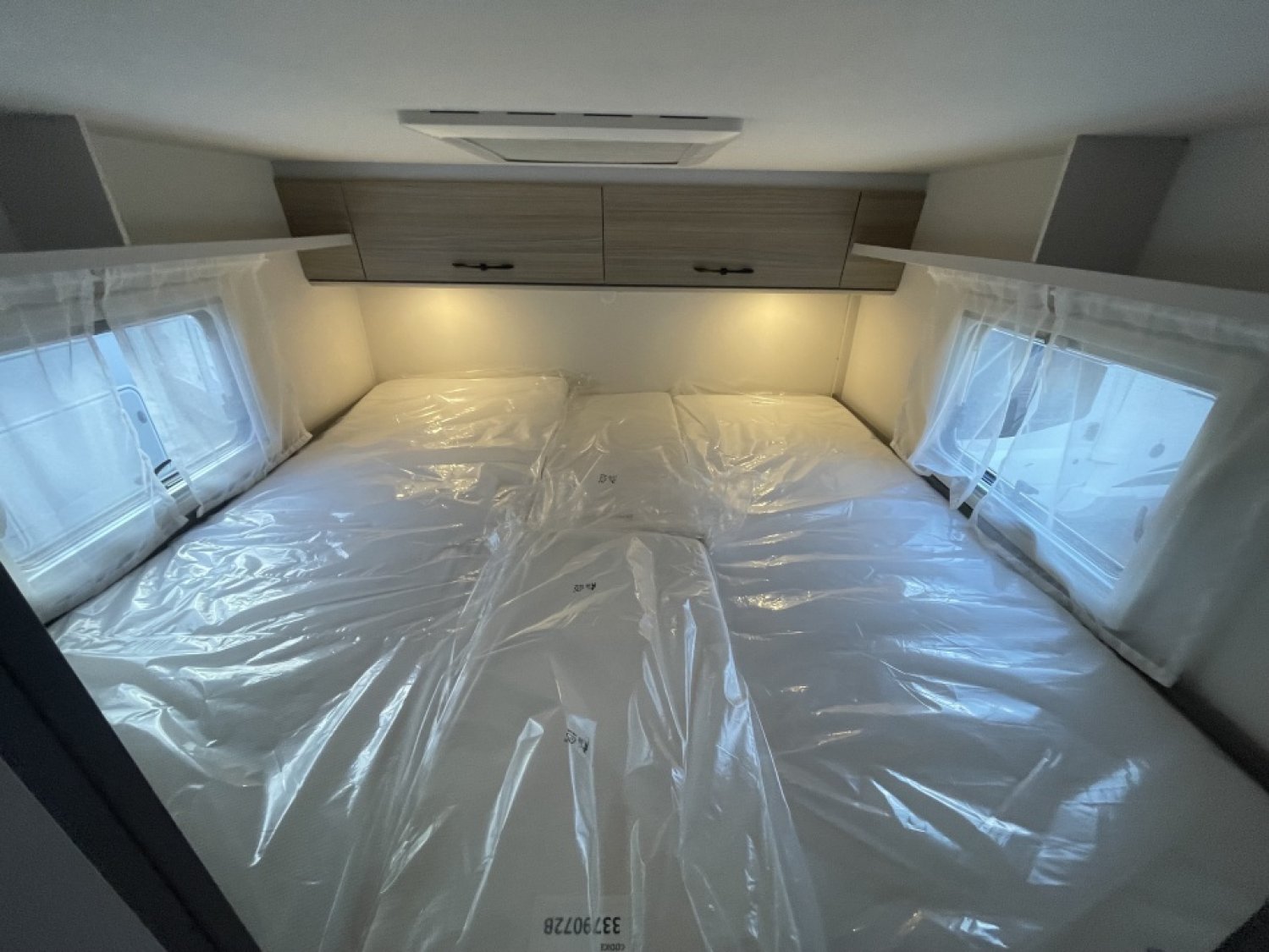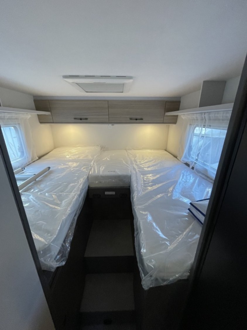 À l’arrière, il dispose de deux lits jumeaux modulables en un grand lit transversal offrant un couchage confortable de 195 x 191 cm. À l’avant, un lit simple.
