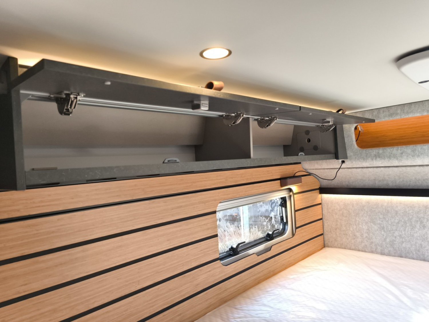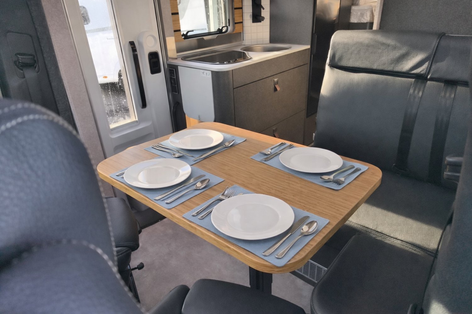 Transformation dînette en L en couchage (table au pied télescopique + coussin supplémentaire + utilisation du siège conducteur)