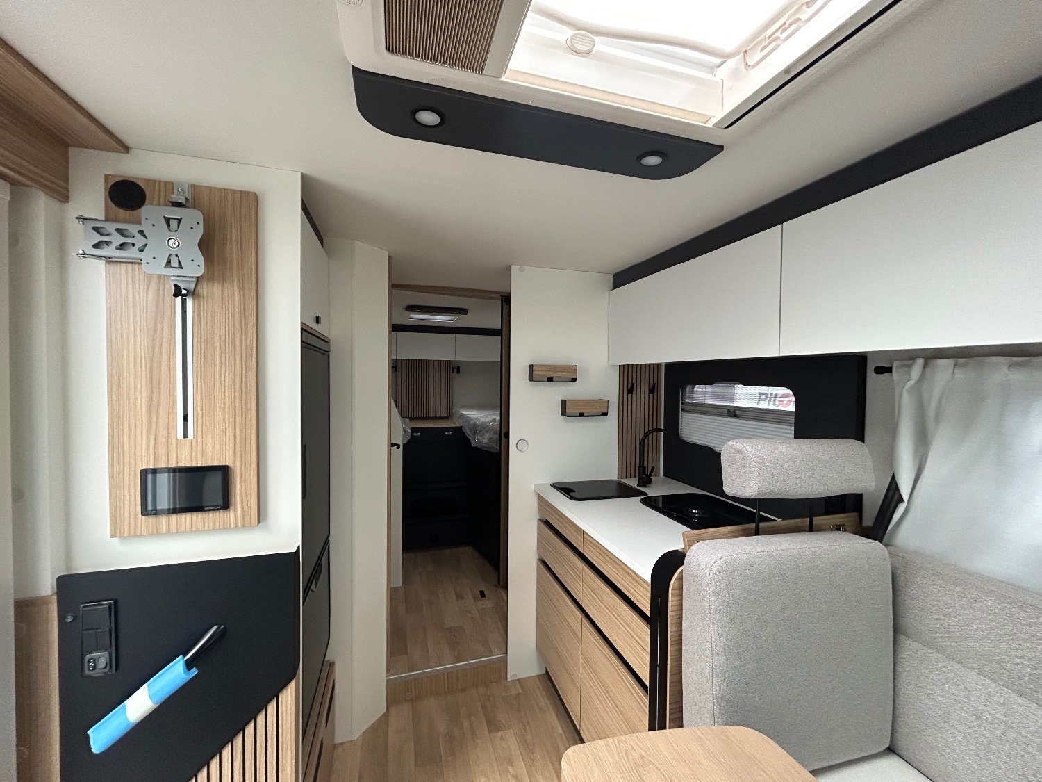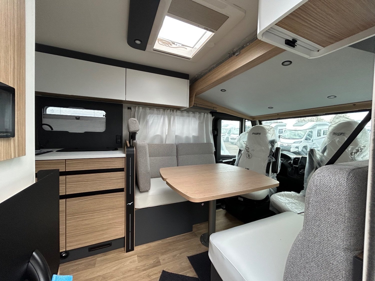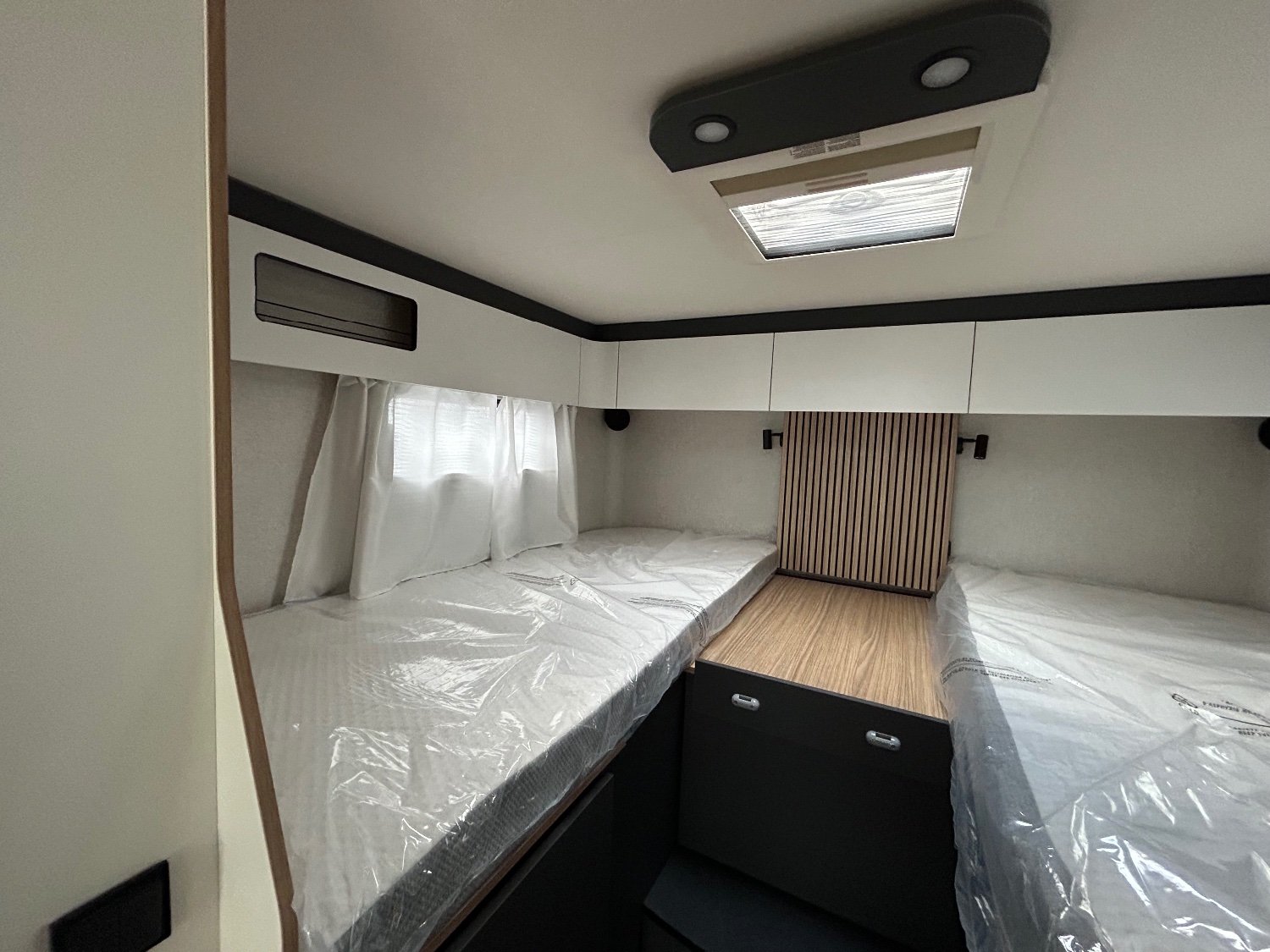 A l'arrière vous disposez de 2 lits jumeaux en hauteur dégageant une très grande soute de rangement , idéale pour le vélos électriques couteux , puis un espace sanitaire composé d'une grande douche et WC séparés , une cuisine équipée avec très grand réfrigérateur à compression, à l'avant un grand salon conviviale avec un lit de pavillon escamotable offrant un deuxième grand couchage 2 places.