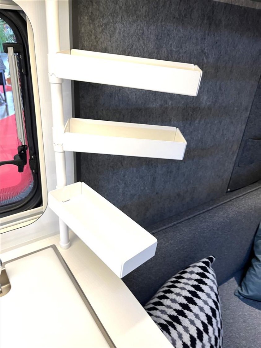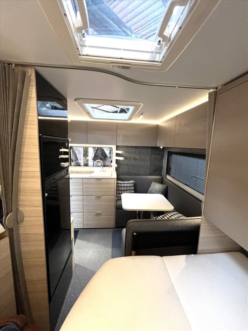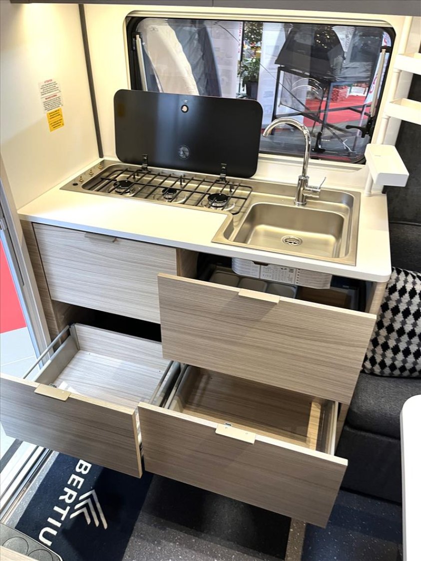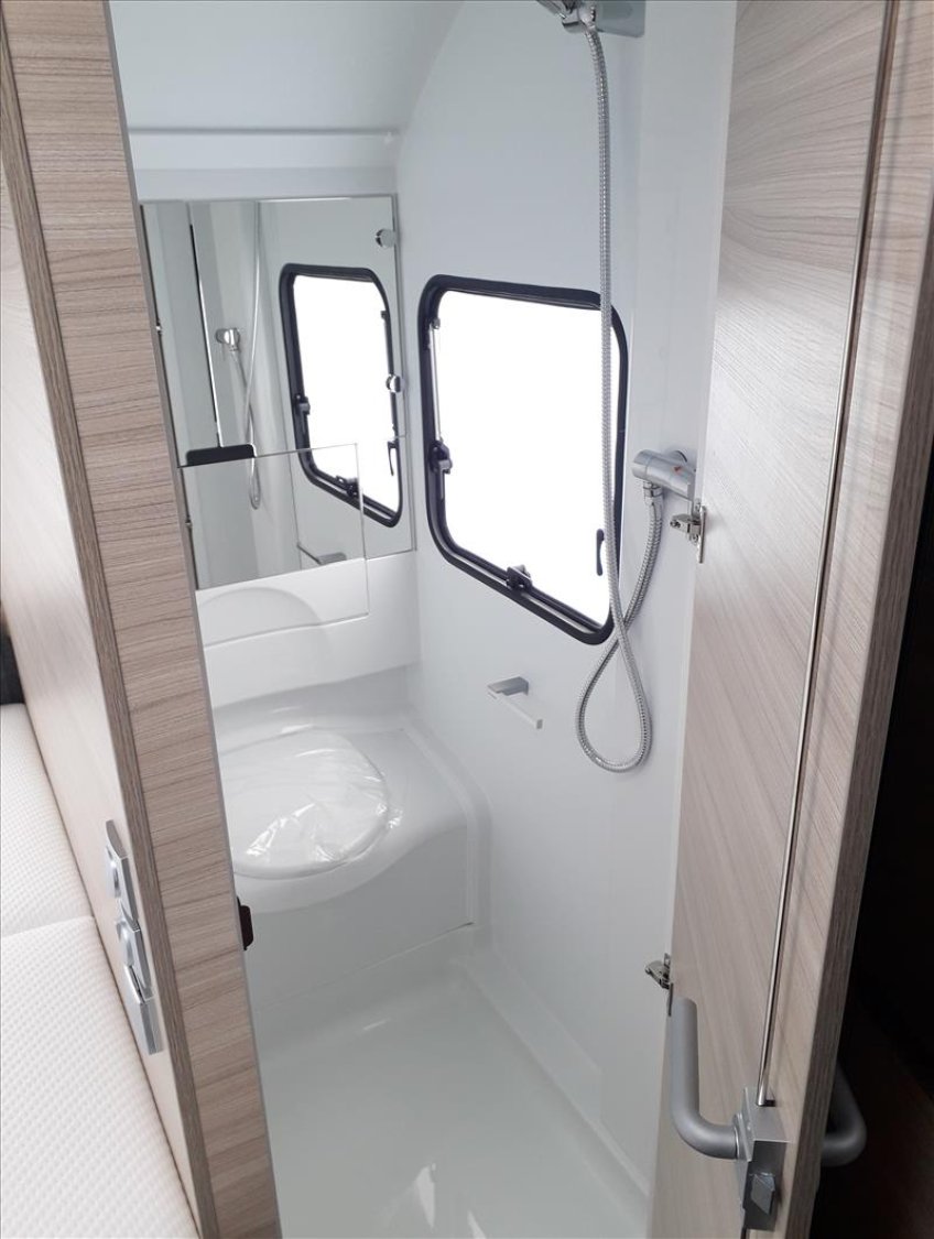 Vérins stabilisateurs standard, Vidange centrale d'eaux usées, Prise de courant 230V, Réchaud 3 feux avec allumage électrique, Réfrigérateur 167L, Jantes an acier, Lanterneau mini heki 400*400, Moustiquaires et stores obscurants sauf toilette, Table relevable avec pied télescopique, 4 coussins décoratifs, Boiler 5L truma terme, Chauffage à gaz Truma S3004, Porte d'entrée 2 pièce sans fenêtre