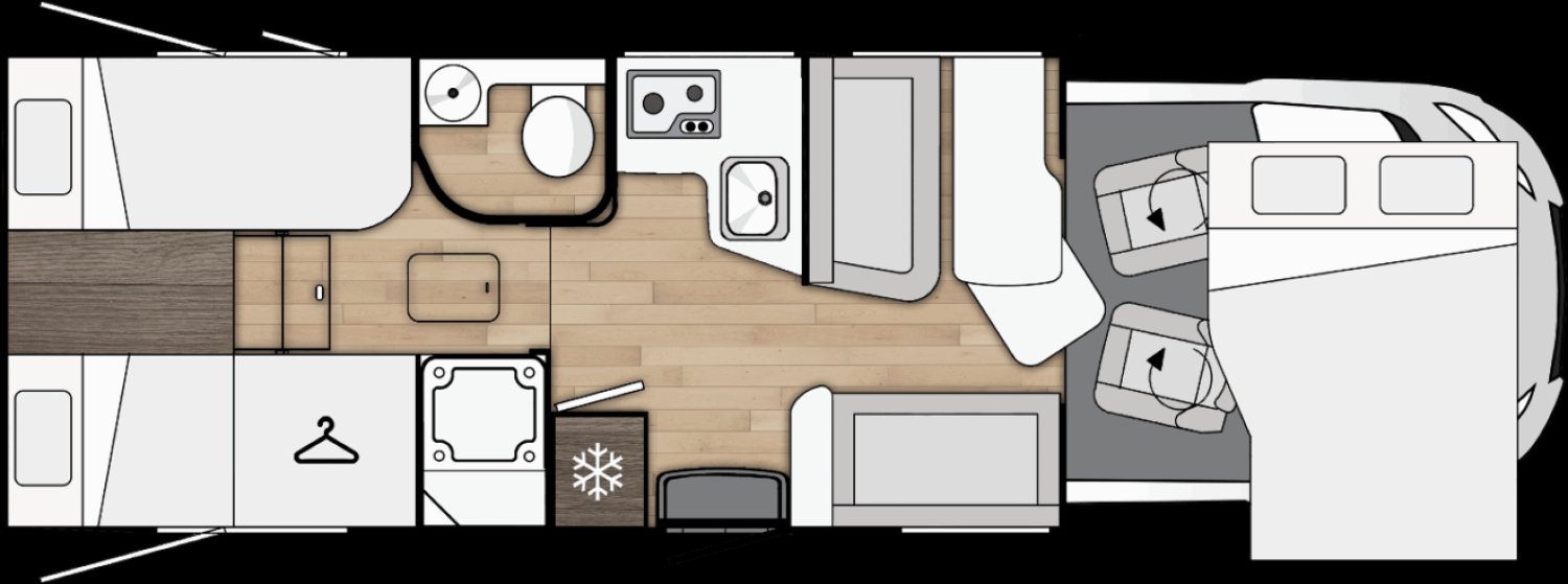 Assistance au démarrage en côte (HSA), Adaptation intelligente de la vitesse, Flancs et plafond imputrescibles (sans bois), Casquette de profile 100% polyester renforcé, Fenêtres double vitrage Dometic D-Lux Extra plates, Frein électrique, Régulateur de vitesse avec limiteur, Alerte anticollision et aide au stationnement avant, Porte cellule avec fenêtre, store et poubelle, Porte cellule XL, Rideaux occultation vitres cabine, Climatisation cabine automatique, Radio DAB avec écran tactile 12" + Caméra recul, Commandes au volant de la radio, Carrosserie et dessous plancher polyester, Lits jumeaux transformables en lit de 170x210 cm, Lit de pavillon électrique 2 places, Porte d'accessibilité au garage par l'intérieur cellule, Lumière extérieure LED, Reconnaissance des panneaux de limitation de vitesse, Alerte de circulation à contresens, Assistance au centrage sur la voie, Phares antibrouillard avant, Phares automatiques et détecteur de pluie, Rétroviseurs électriques et dégivrants, Radars de recul, Vitres électriques, Prises 230 et 12 V dans le garage, Supports porte-vélos, Panneau solaire 200 W avec régulateur MPPT, Roues 16", Grille de calandre noire et chromé, Store 4 m, Téléviseur 20' avec antenne omnidirectionnelle, Pré-installation 2ième batterie, Chargeur de batterie 22A avec option lithium, Prise USB dans la zone de couchage