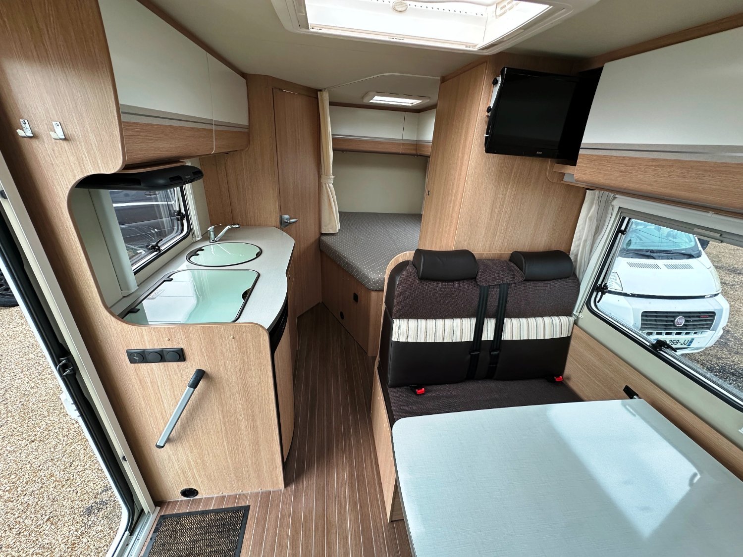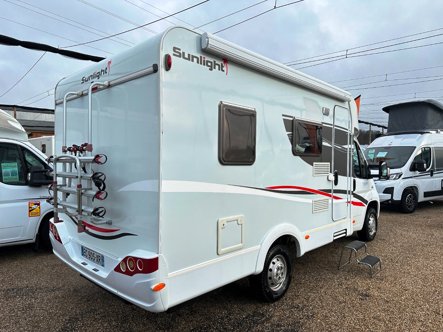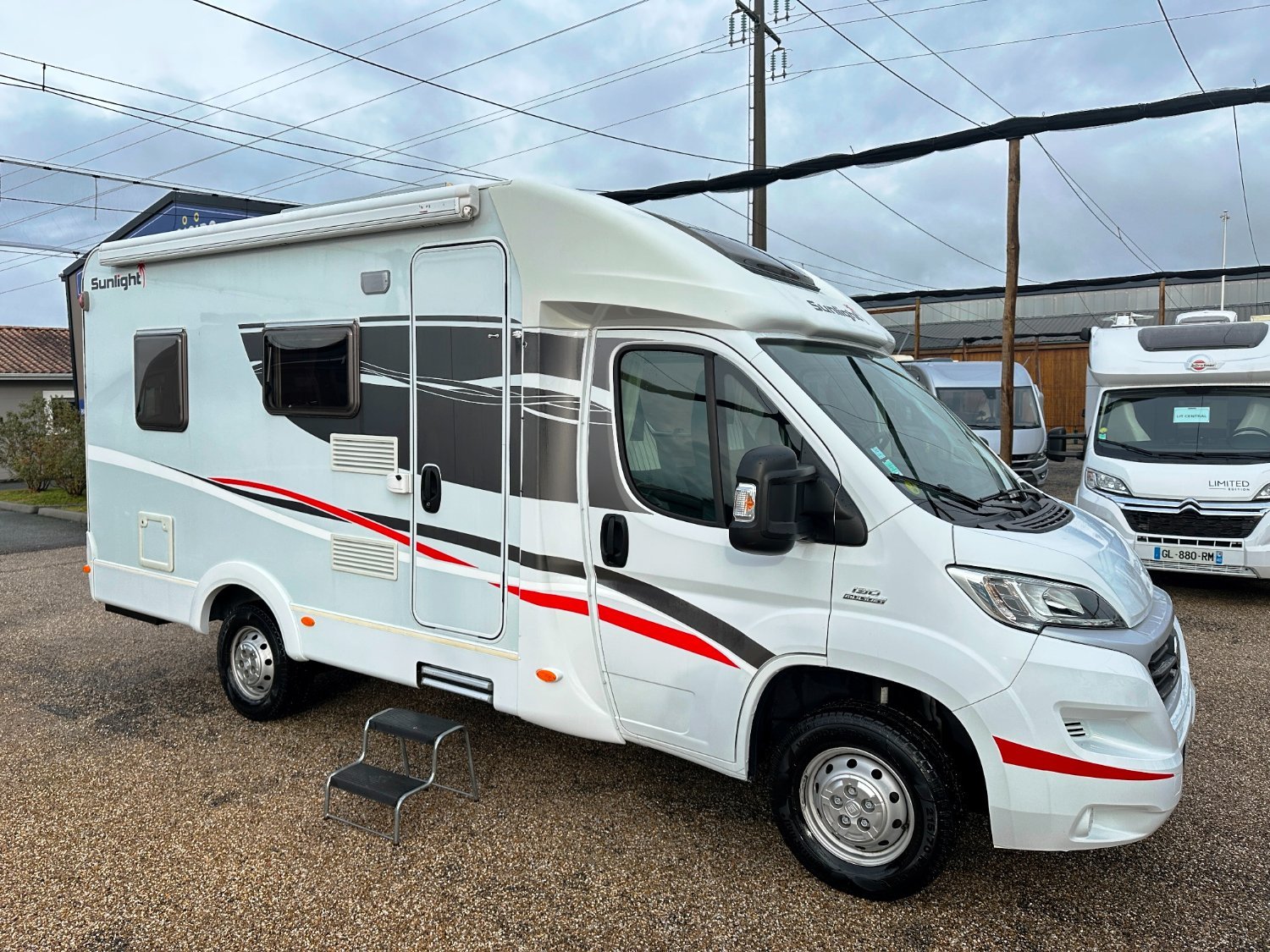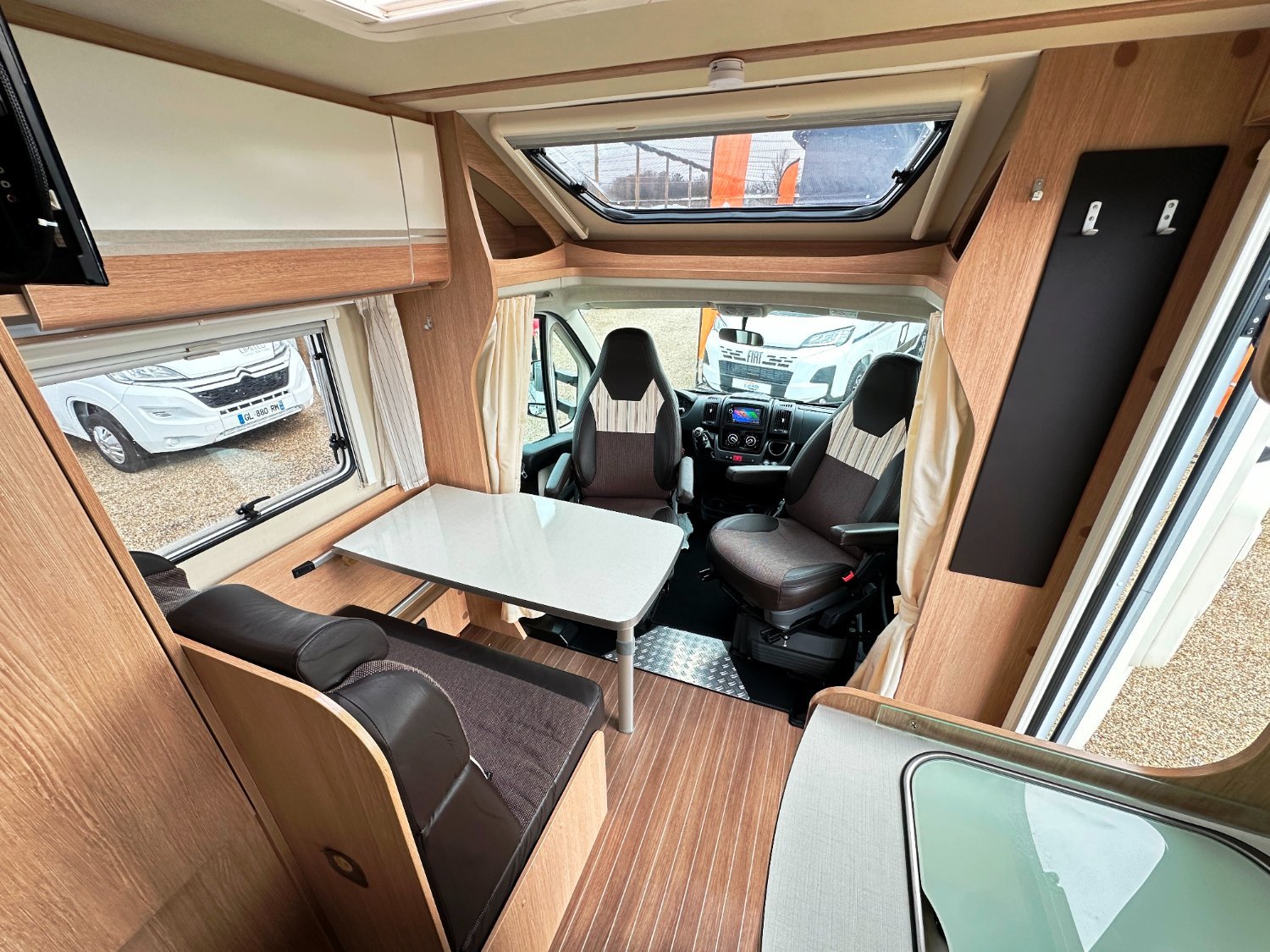 Profilé Sunlight, 3 couchages, lit à la Française, salle de bain avec grande douche entièrement séparée, cuisine spacieuse et toute équipée, vaste salon avant avec sièges pivotant et table centrale convertible en un couchage d’appoint.