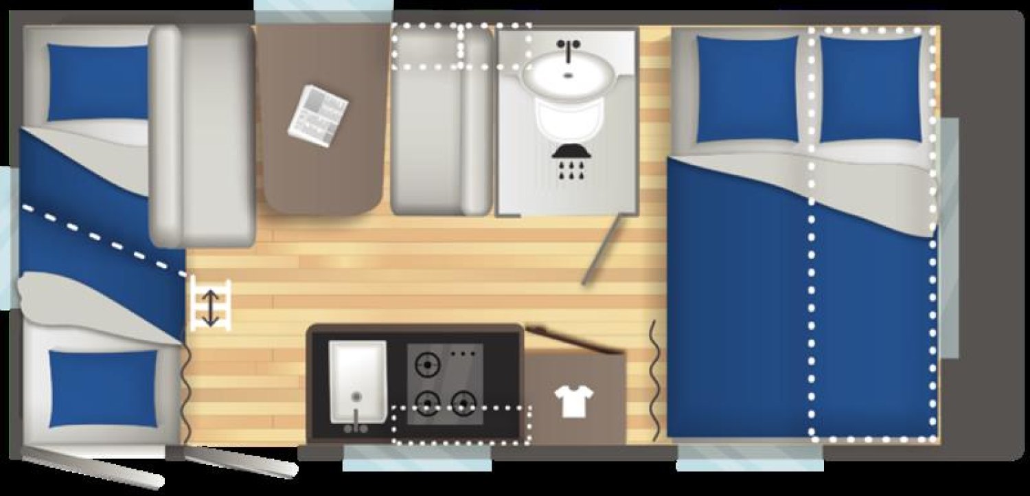 Soute à vélos (cm) : 100x65, Store combi occultant + moustiquaire, Toit polyester, Rail auvent, Roue jockey, 3ème feu stop, Bac à douche, Baie arrière, Baies ouvrantes double vitrage, Combiné réchaud 3 feux et cuve évier inox avec couvercle ver, Compartiment bouteille à gaz, Dimensions couchage arrière (cm) : (61x212)x2, Dimensions couchage avant (cm) : 137x205, Dimensions couchage central (cm) : 11096x168, Eclairage intérieur LED, Eclaireur d'auvent LED, Parois latérales polyester, Prises 230V : 3, Prises USB, Vérins rallongés à l'avant, Transformateur 23012V avec disjoncteur, WC à cassette pivotant manuel, Pré-équipement Climatiseur, Pré-équipement TV: prises antenne et 230V, Réfrigérateur à compression XL FREEZE : 150L