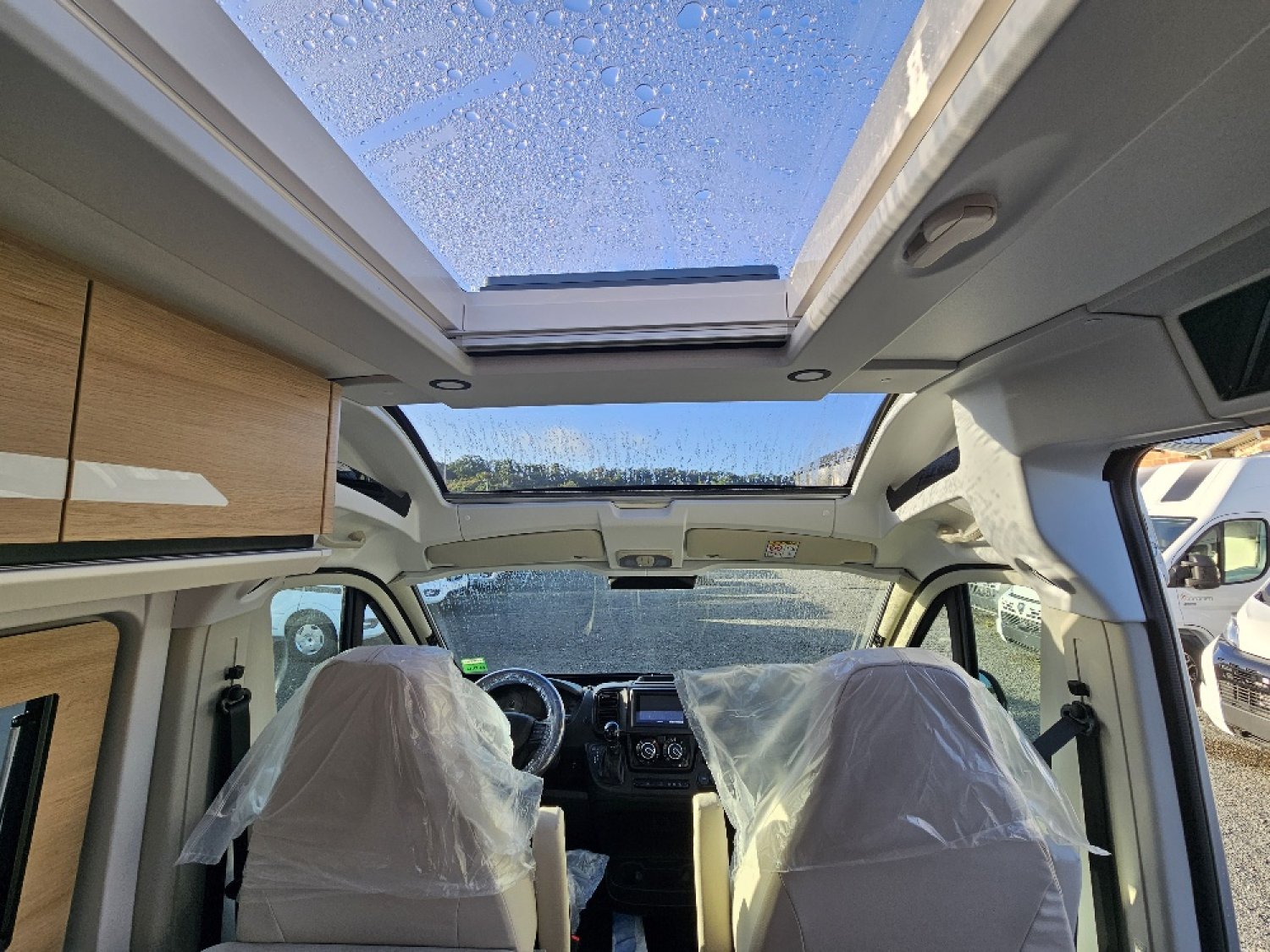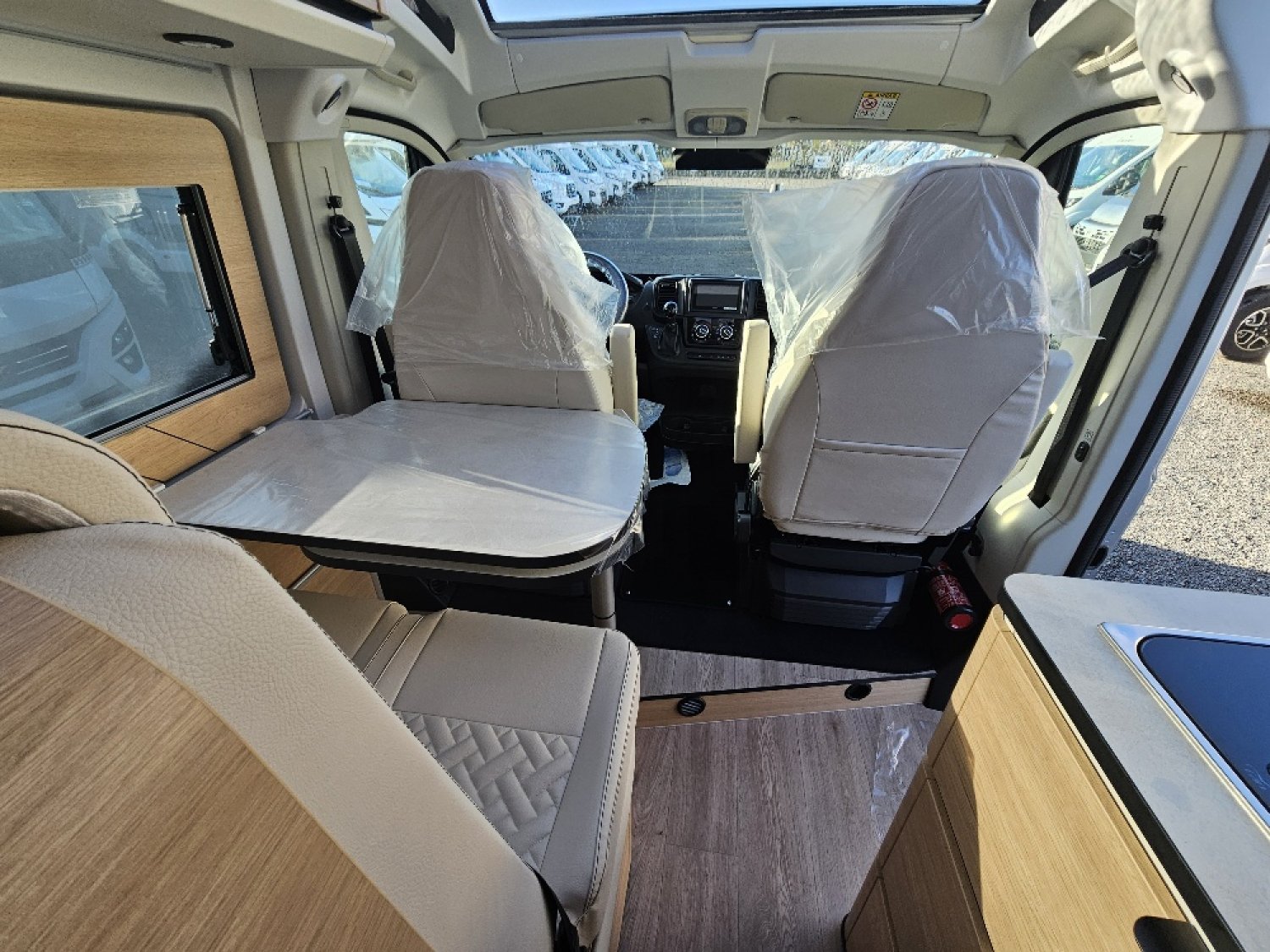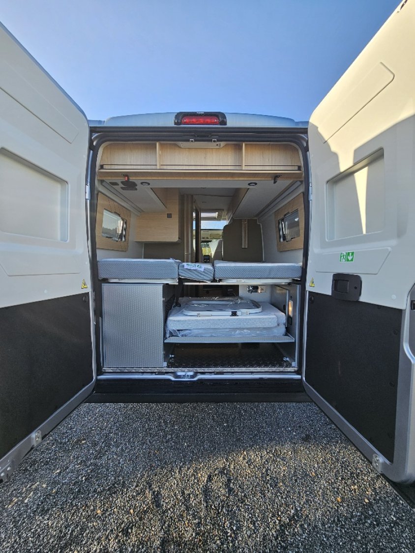 (Ambiance mobilier au choix, Sellerie au choix, Truma Combi 4 DIESEL avec kit altitude et commande de chauffage CP PLUS, 2ème batterie cellule AGM, Jantes 16 pouces en alliage léger, Volant cuir, Habillage gris sur aérateurs, TPMS, Feux avant 100 % LED, Allumage automatique des feux et des essuie-glaces, Frein de stationnement électrique, Pare-chocs avant couleur carrosserie, Skid plate noire, Feux anti-brouillard, Peinture métallisée Gris Artense, Toit panoramique SKYVIEW, Renfort pneumatiques suspension essieu arrière, Couchage dinette, Panneau solaire 150 W, Déco Saphir, Prise gaz extérieure)