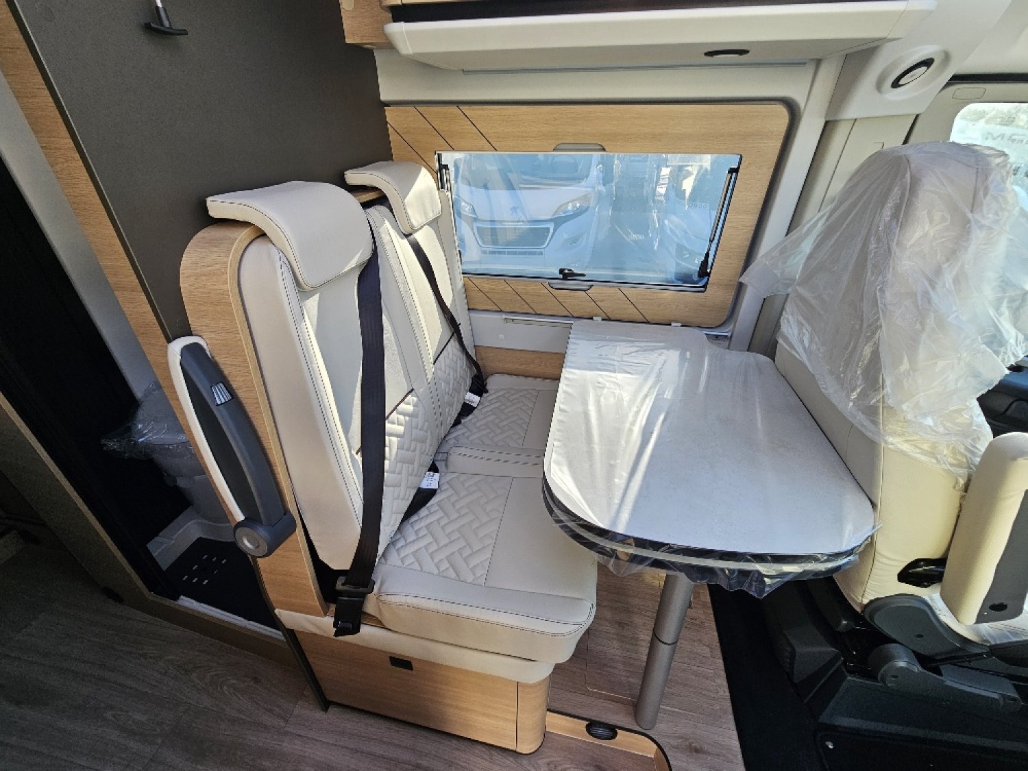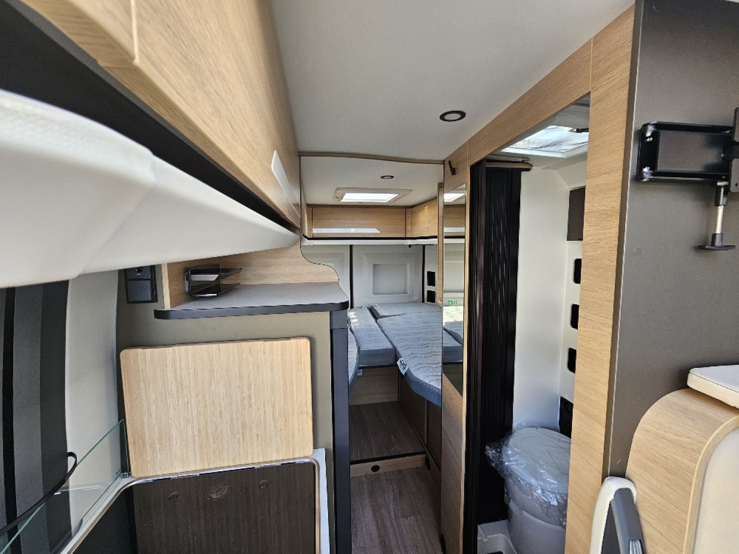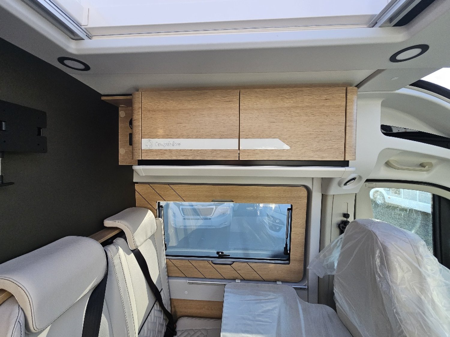 Magnifique fourgon aménagé comprenant un salon avant panoramique, un grand réfrigérateur, une salle d’eau DUO’SPACE avec paroi pivotante et des lits jumeaux.