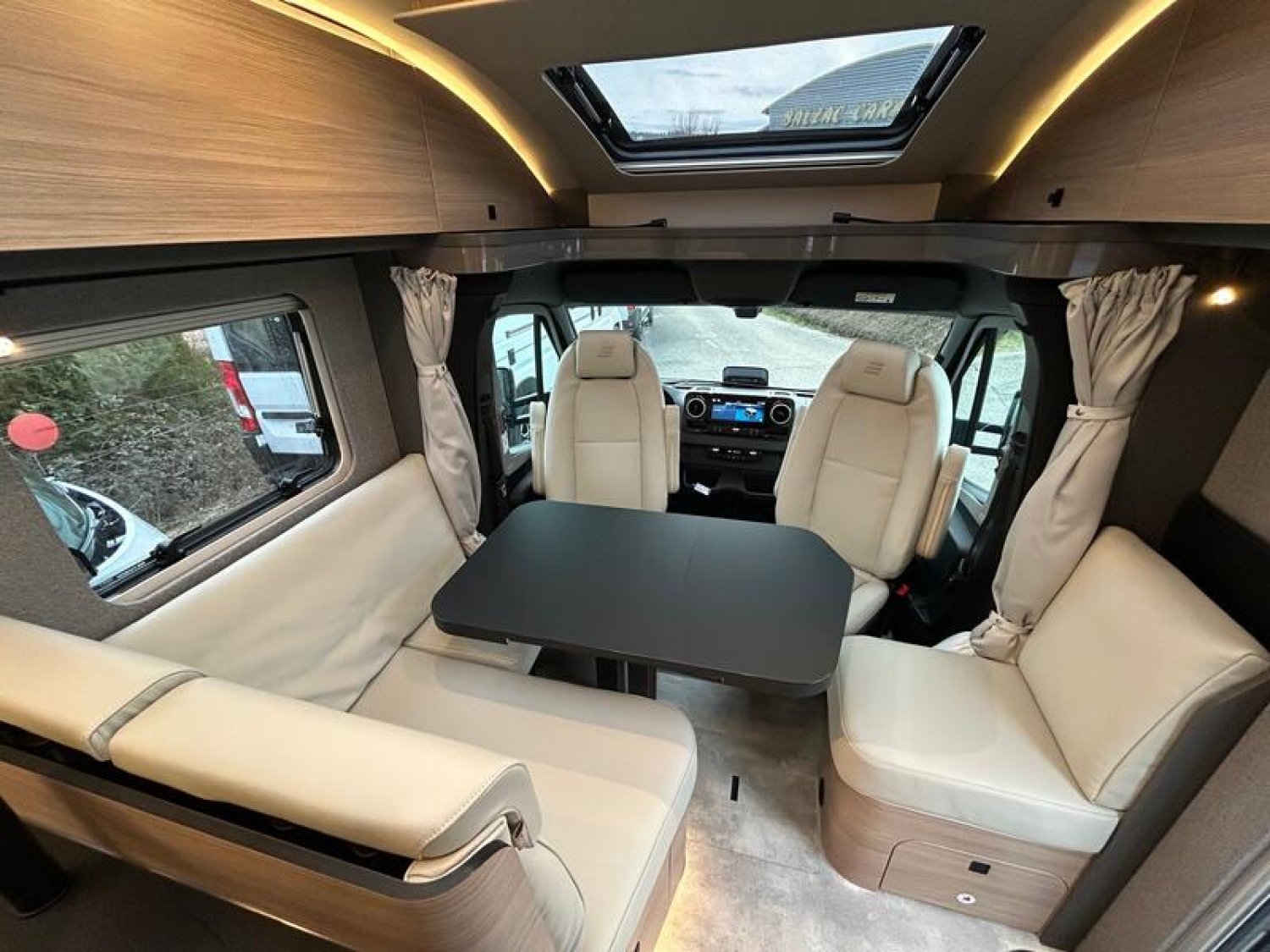 serrure de sécurité porte cellule (305) / fermeture centralisée (500) / capteur pression des pneus (495) / éléments avants couleur carrosserie (895) + sommier à assiette lit arrière (495) / tiroir rangement dans dinette (295) / dinette en L confort (500) / 2ème module lithium avec total de 160Ah (1805) + table avec rallonge (600) / douchette en soute (290) / inverseur de gaz auto avec filtre (195) / ventilateur en cuisine (455) / porte cellule confort (400) + précâblage panneau solaire (200) / sièges chauffants (725) / wet wiper (100) / chauffage gaz 6Kw avec résitance électrique (595) + smart TV 32'' + support (2180) / filtre eau potable (250) / routeur 5G (2005) / coussin supplémentaires lits jumeaux (455) / transformation dinette en couchage (455) / rideau de séparation cabine doublé et surpiqué (355) : 14550 €