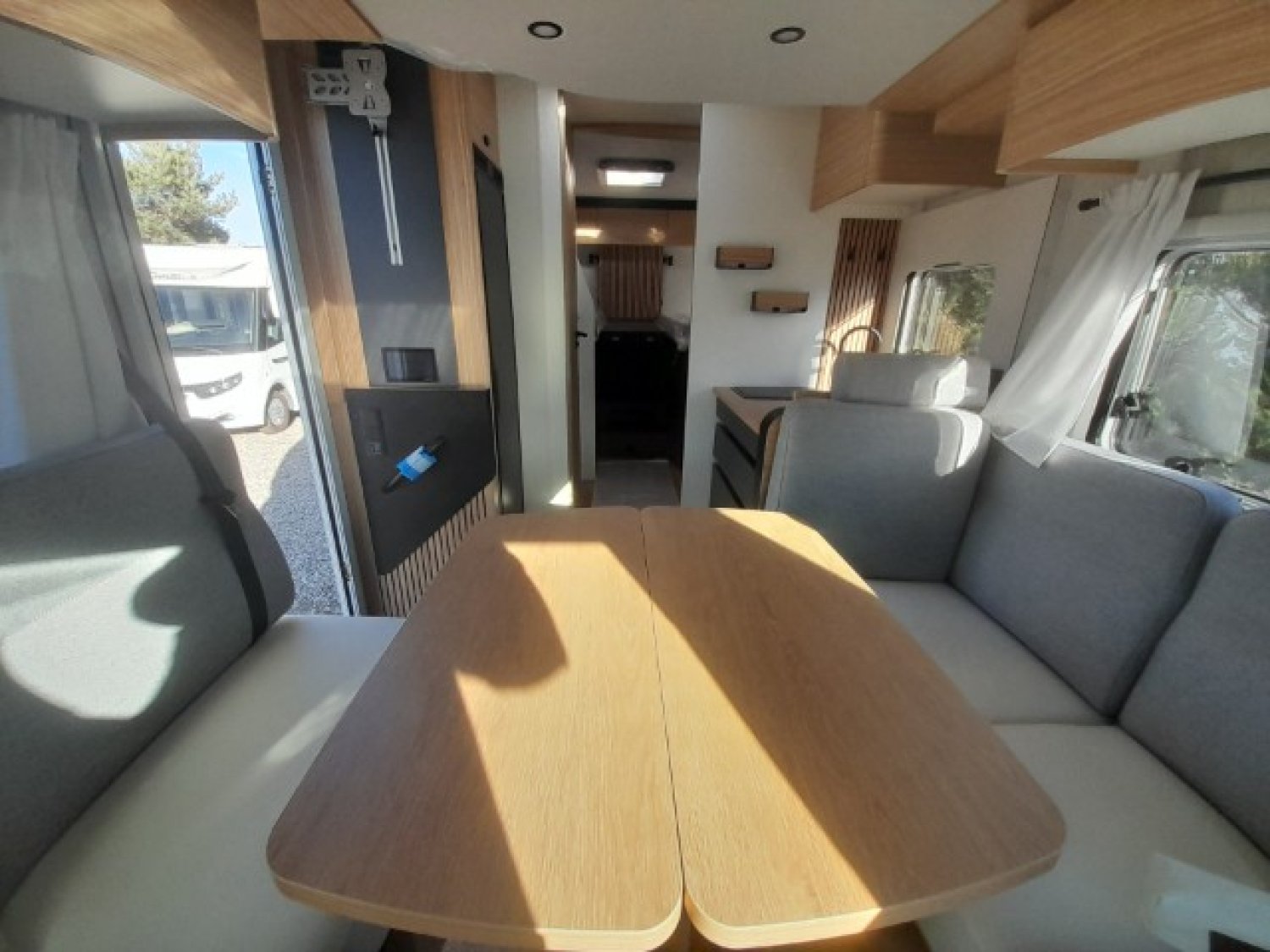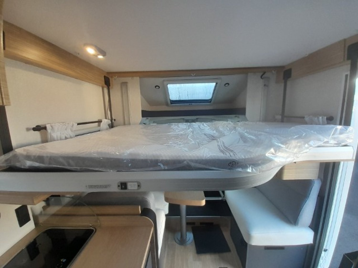 AMBIANCE PYLA, BATTERIE LITHIUM 200AH ET 2 PANNEAUX SOLAIRES 100 W MONOCRIS, BOOSTER POUR UNE CHARGE RAPIDE DE LA BATTERIE, CABINE NOIRE, CHAUFFAGE HYBRIDE TRUMA D 6E (DIESEL/230V), DOUCHETTE EAU FROIDE/ CHAUDE DANS LA SOUTE ARRERE, LIT CENTRAL REGLABLE EN HAUTEUR ELECTRIQUEMENT, LIT PAVILLON ELECTRIQUE AVEC SOMMIER A LATTES, PACK JANTES (JANTES ALLIAGE 16'' + VOLANT SIMILI + AERATEUR, PACK MEDIA 7" : AUTORADIO 7" PIONEER, DAB, APPLECAR/ANDROID, REFRIGERATEUR A COMPRESSION THEDFORD 150 OU 158L SELON MODEL, SELLERIE BI-TON ET BI-MATIERE SIMILI ET TISSU "SAND", STORE BANNE, TIROIR BAS DE CAISSE