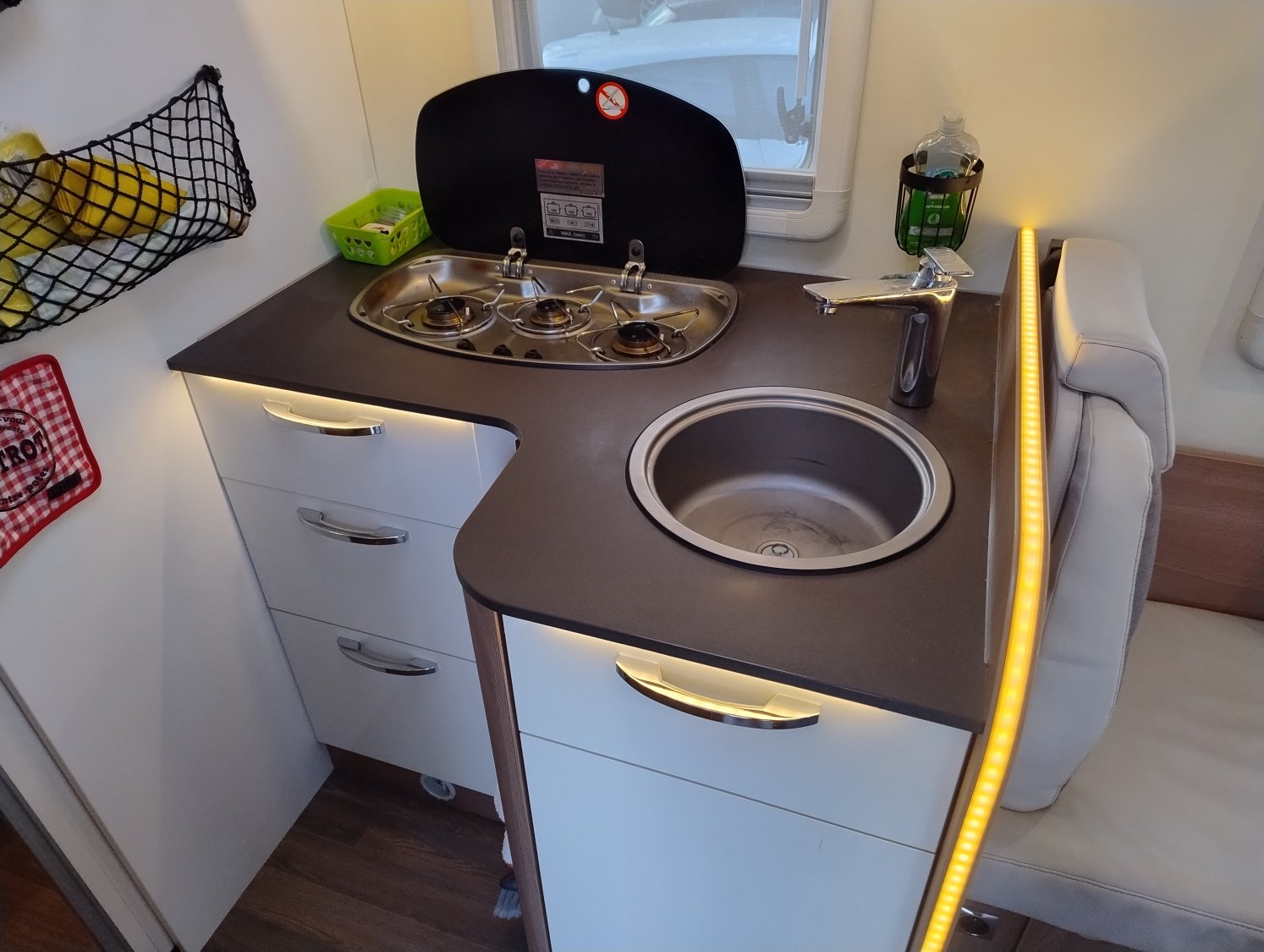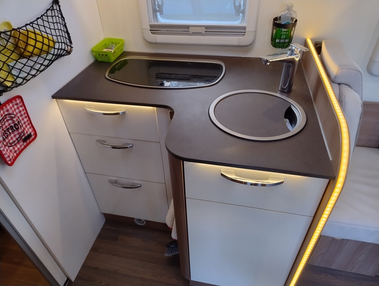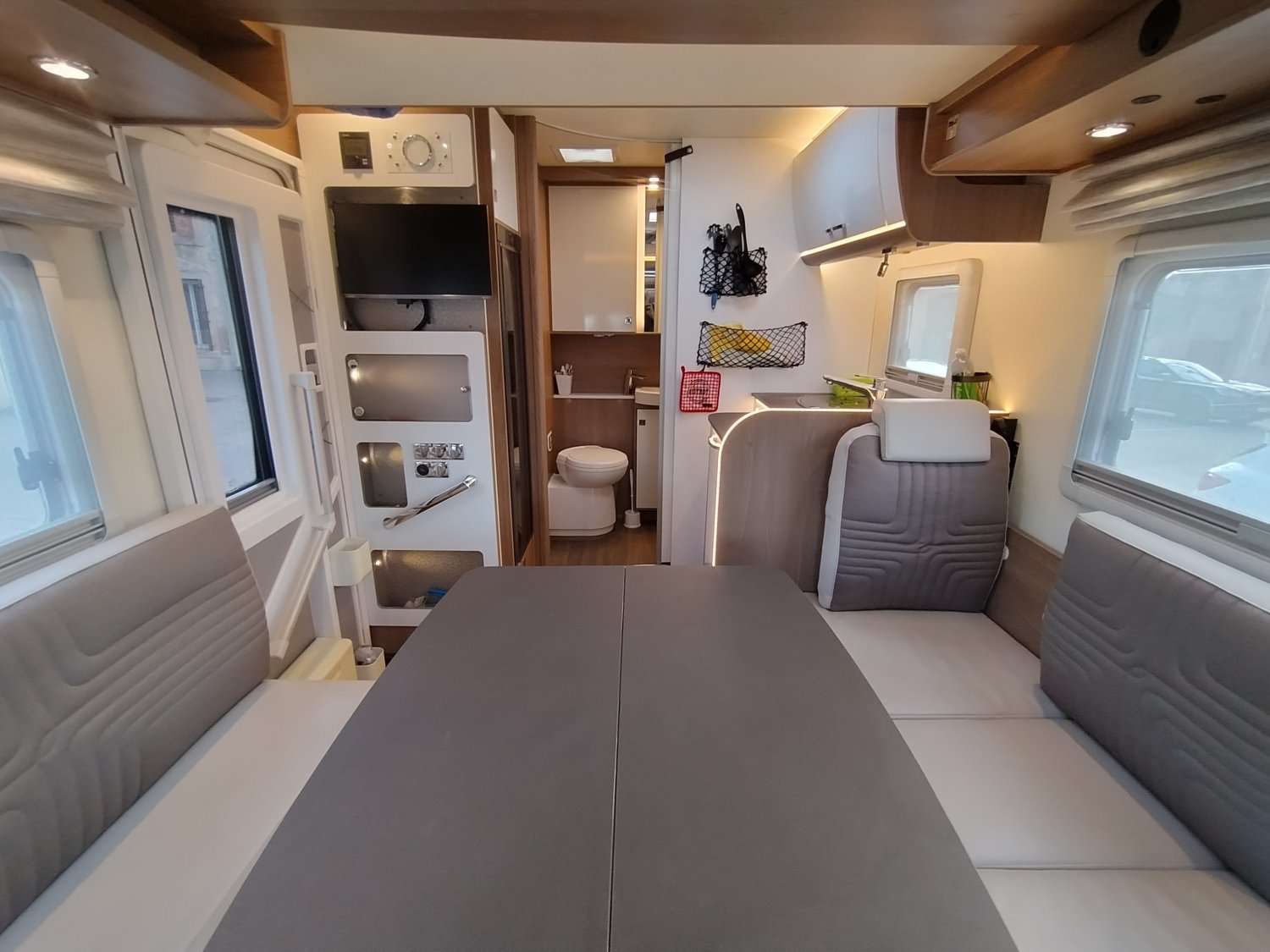 Ce modèle ultra compact de moins de 6m saura se faufiler partout sans difficulté ! Une implantation idéale pour un couple avec son lit pavillon laissant place à grand salon face à face de 4 personnes. Ce dernier pouvant lui aussi se transformer en 2 couchages supplémentaires ! Un espace douche et WC séparées, un coin cuisine avec grand frigo de 133l et de très nombreux rangements pour ce gabarit. Une belle alternative aux fourgons aménagés !