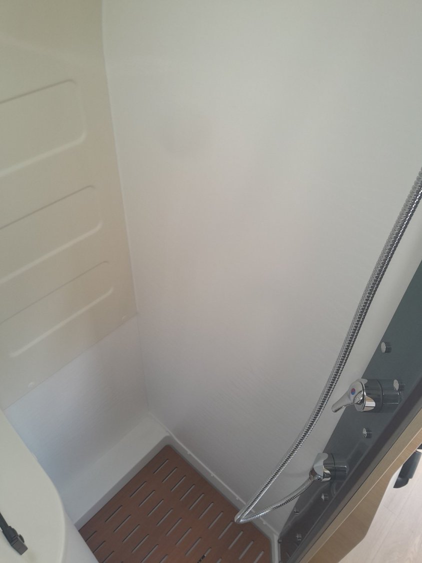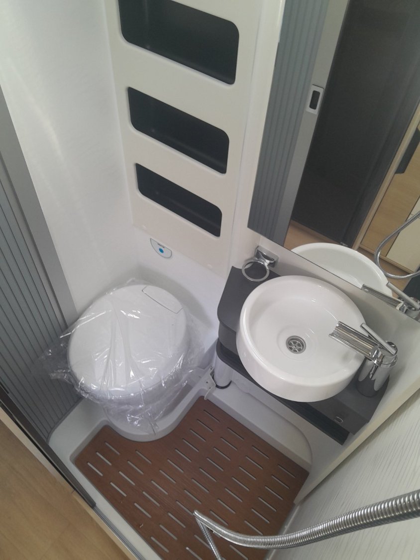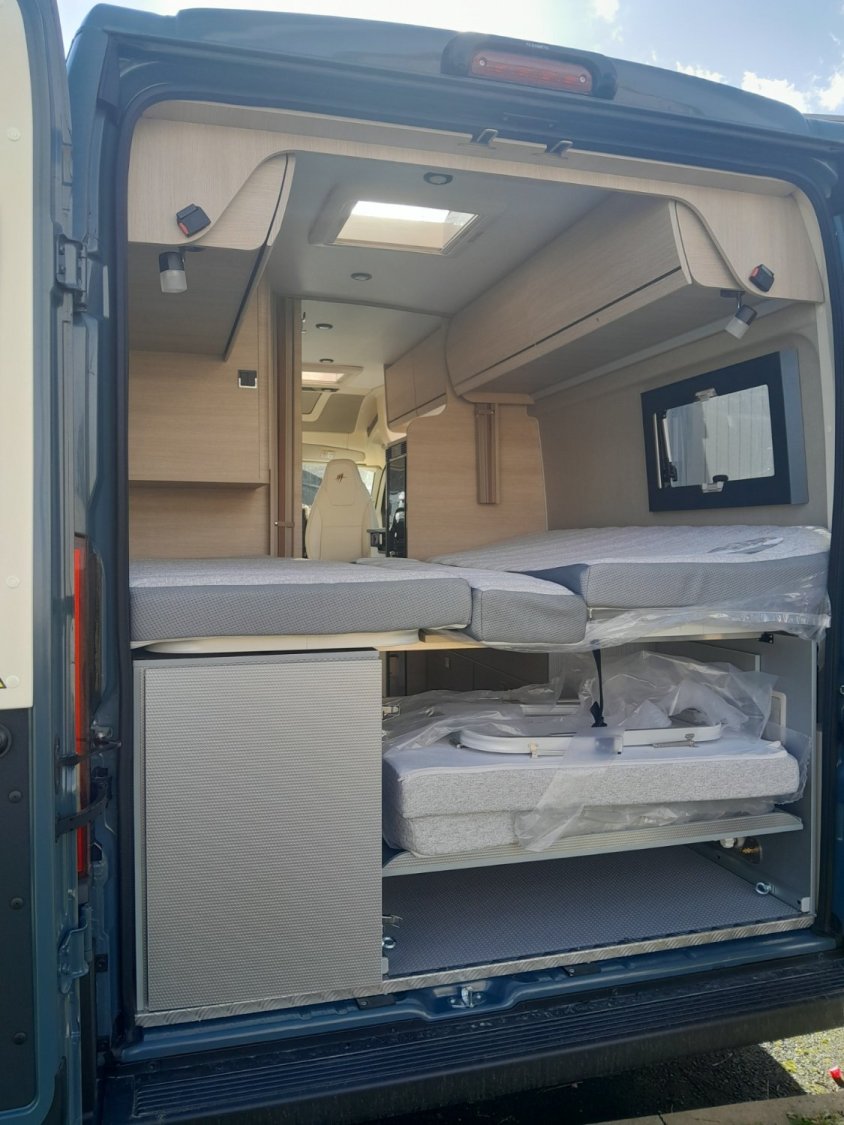 Boîte automatique, frigo à compression 146L, occultants et moustiquaires, support TV, double DIN Pioneer, commandes au volant et volant cuir, salle d'eau Duo'Space, LED extérieure, douchette extérieure, caméra de recul, peinture Lanzarote Grey, jantes alu 16", Traction+, pneus 4 saisons, chauffage gaz, freins de tiroirs, caillebotis salle d'eau, tissu Milan.