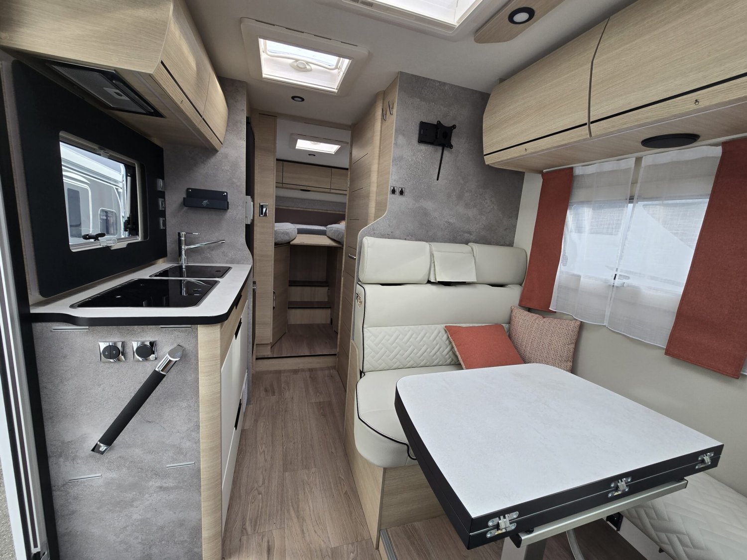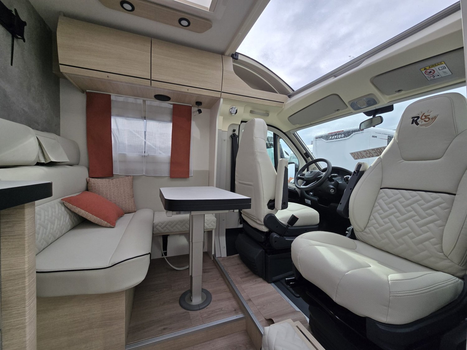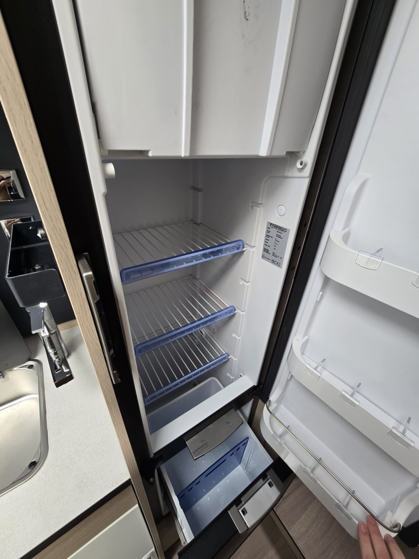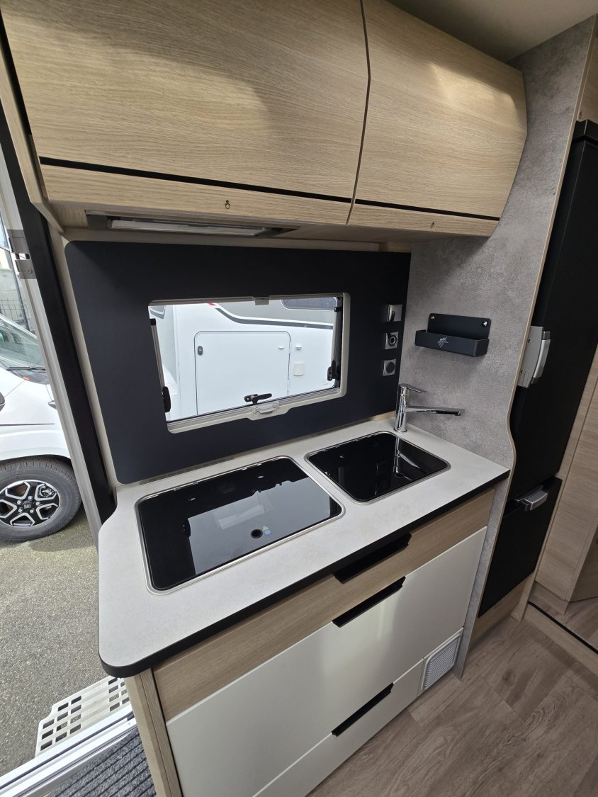Frein de stationnement électrique – Batterie cellule LITHIUM 100 Ah – Habillage gris aluminium sur bouche d’aération – Commandes au volant pour radio-Volant et pommeau de levier de vitesses cuir- Réservoir d’eaux usées chauffé –  TRUMA Combi 4 DIESEL avec kit altitude et commande de chauffage CP PLUS