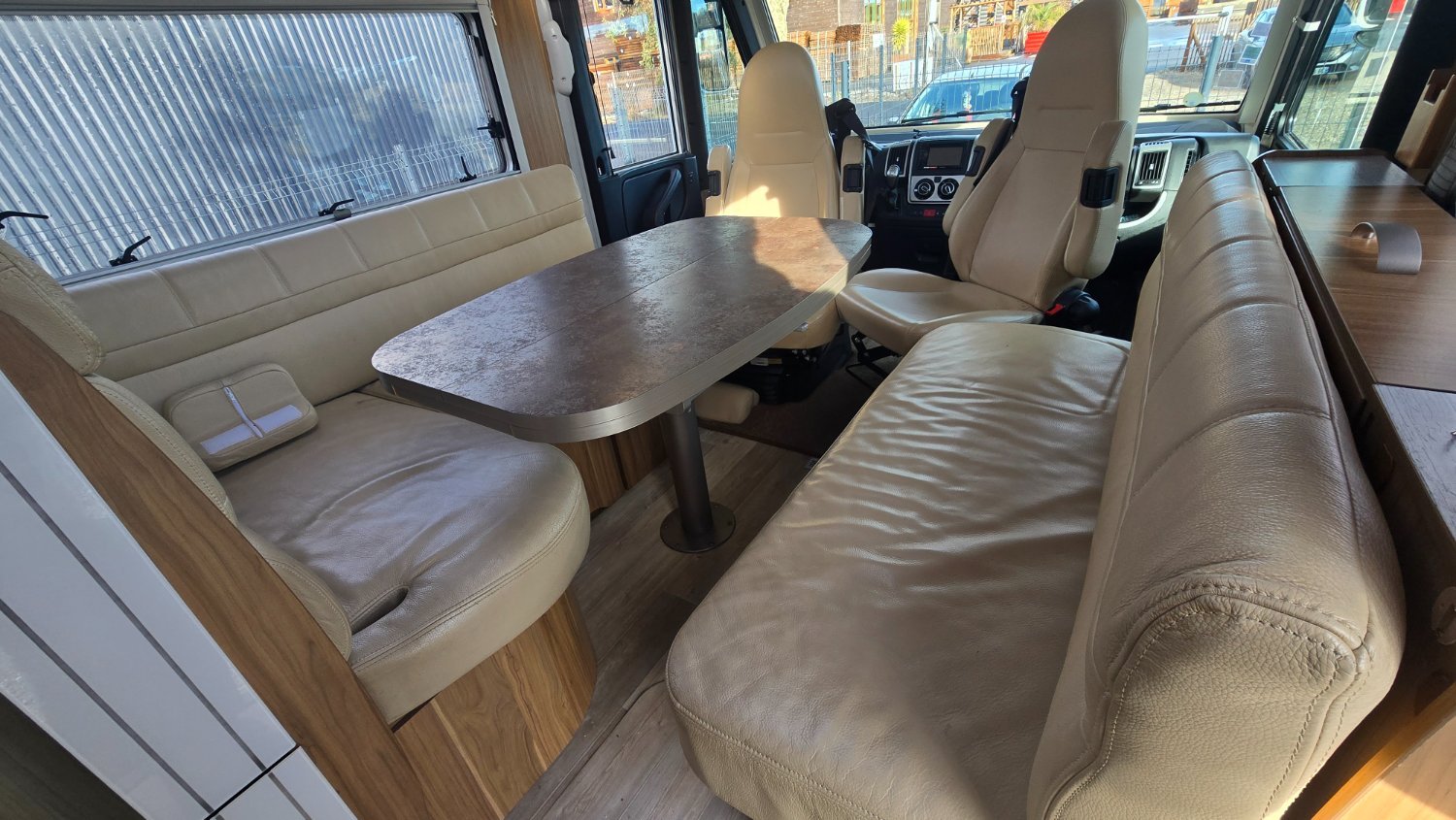 Superbe camping-car intégral PILOTE Explorateur G832, avec lit central + lit pavillon, douche et WC séparés, et un joli salon face à face très convivial.