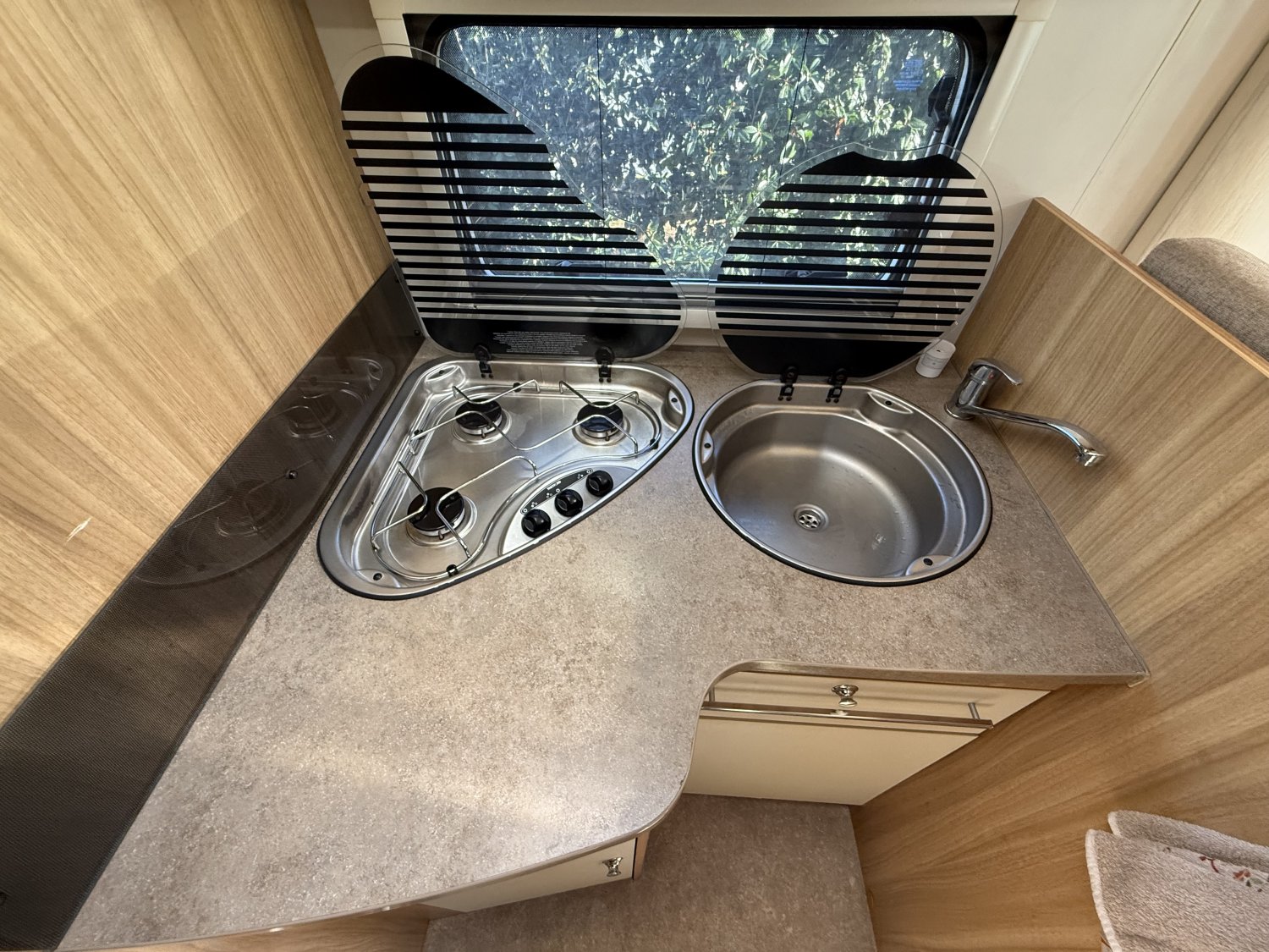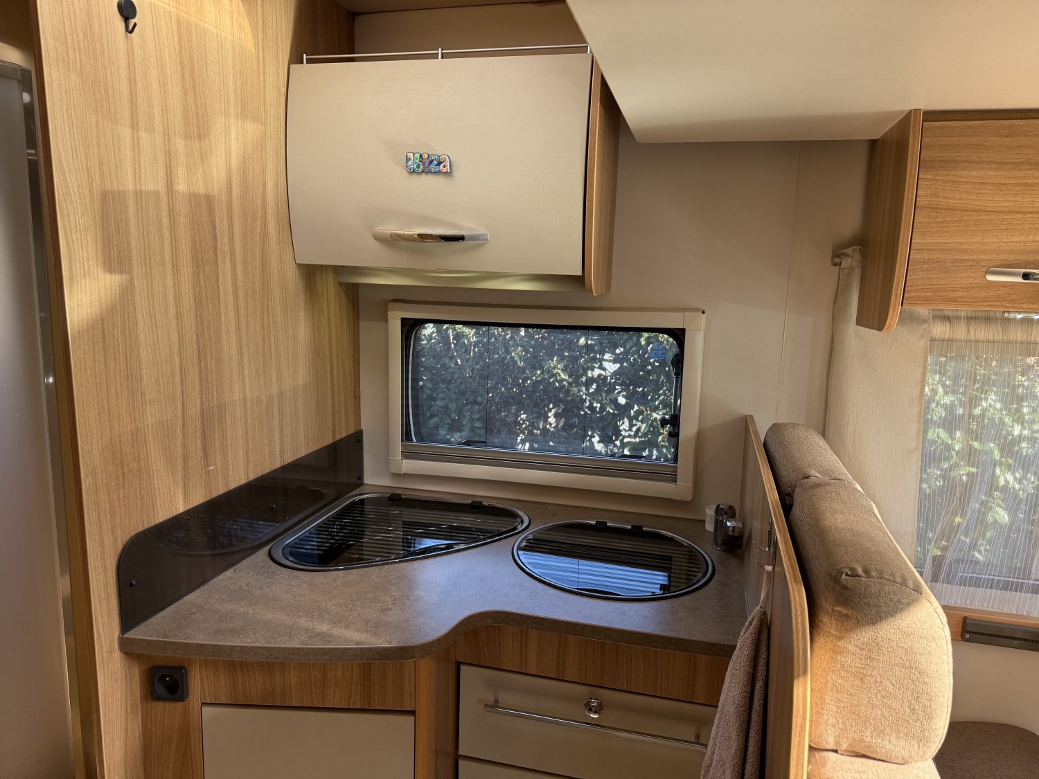 L’ambiance intérieure est typique de Chausson, à la fois lumineuse, pratique et bien pensée. Le salon accueille confortablement cinq personnes, avec un lit pavillon de deux personnes au-dessus et la possibilité de convertir la table en cinquième couchage. La cuisine et spacieuse, avec un réchaud 3 feux et le réfrigérateur automatique gère l’énergie pour garder le froid en toutes circonstances.