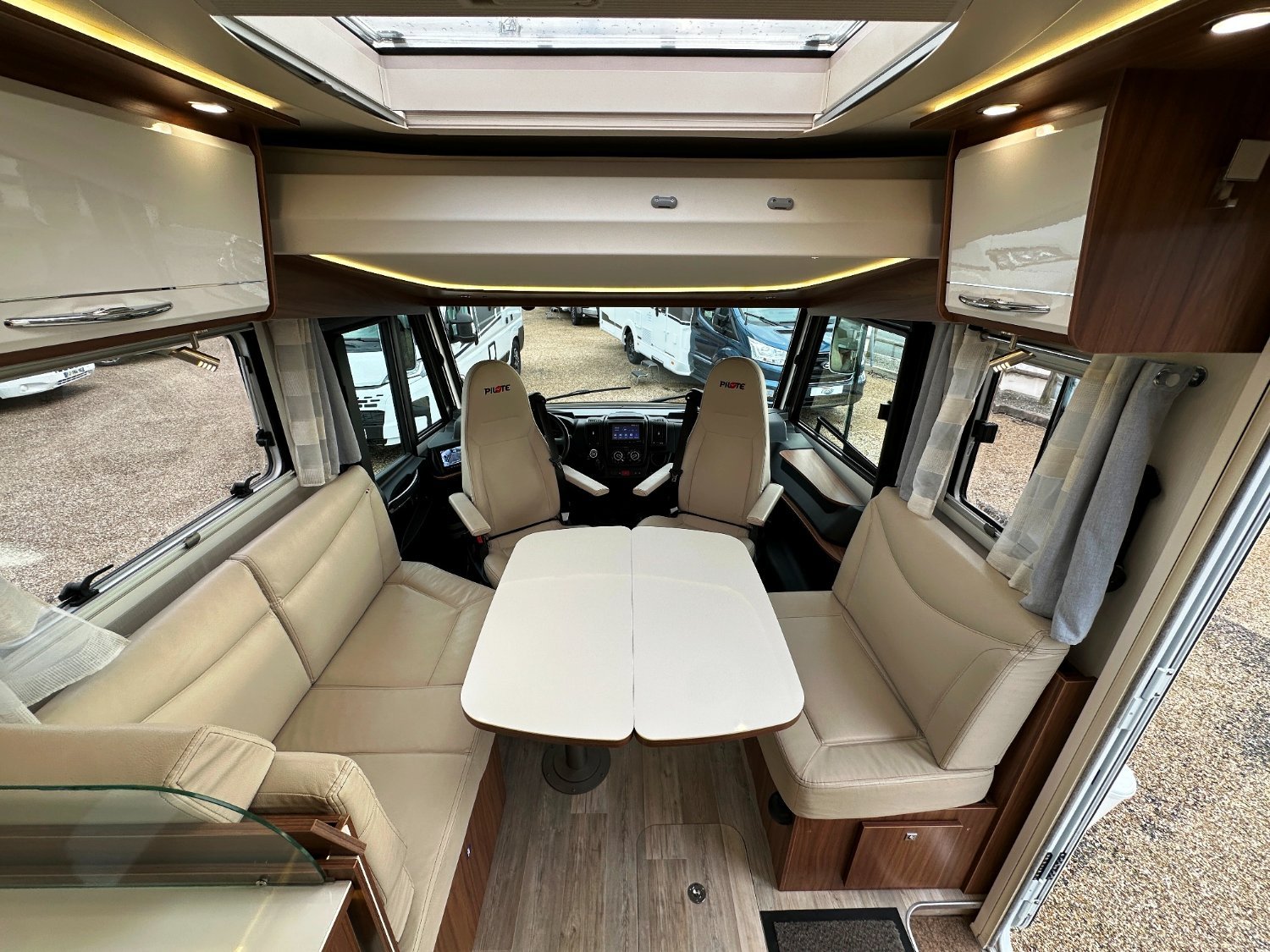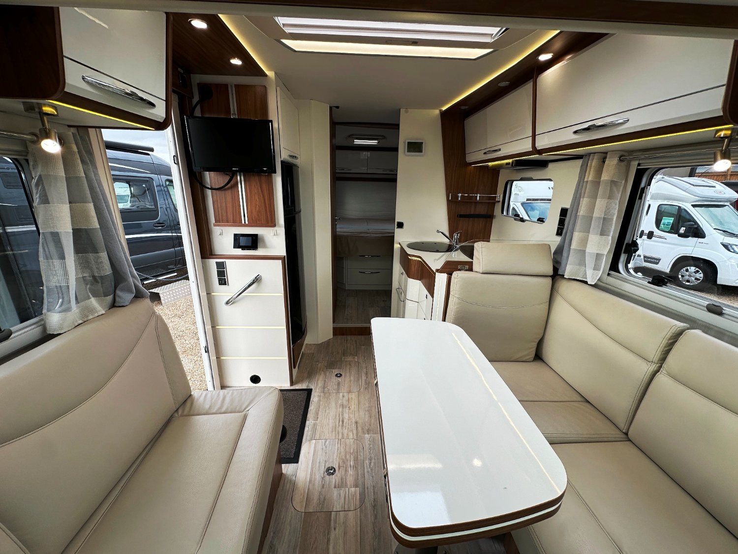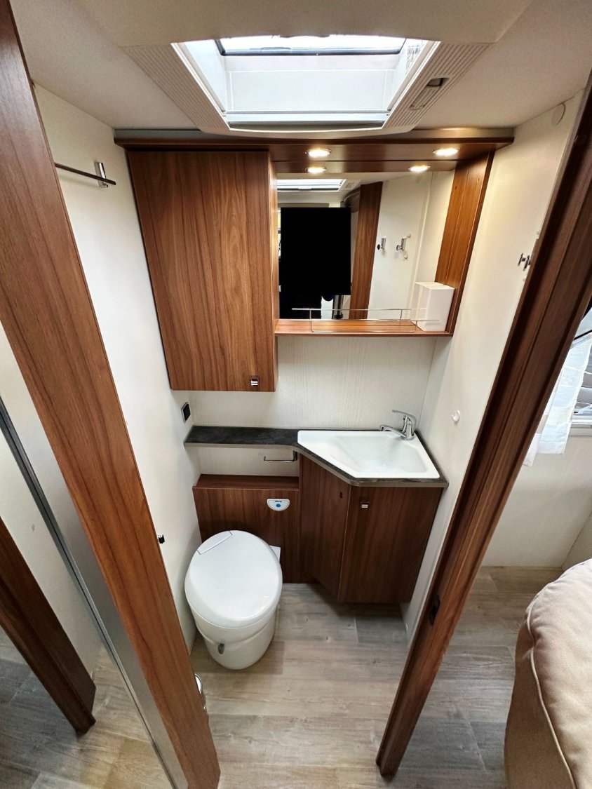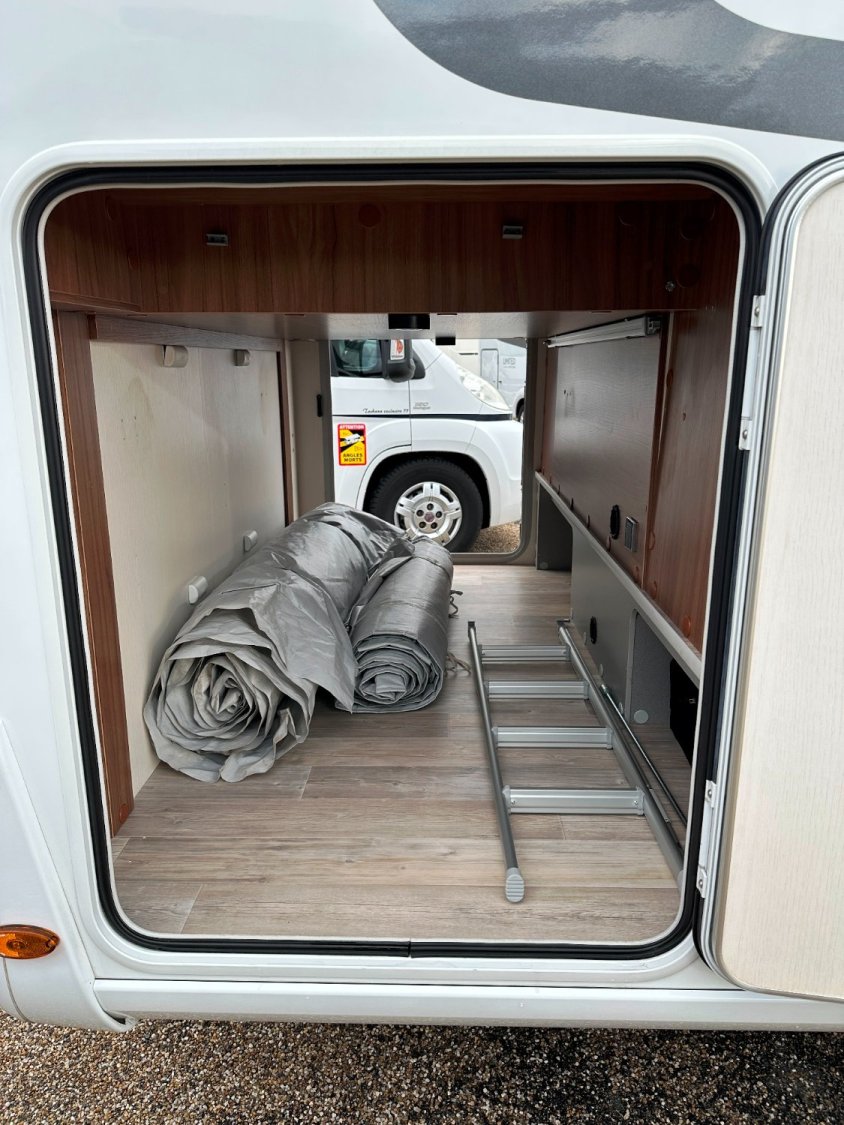 Intégral Pilote, lit central, vaste soute garage (plusieurs vélos adultes), 4 couchages, salle de bain avec grande douche entièrement séparée, double fermeture chambre arrière, cuisine spacieuse et toute équipée, vaste salon avant avec sièges pivotant et table centrale convertible en un couchage d’appoint + lit pavillon en cabine pour deux adultes.