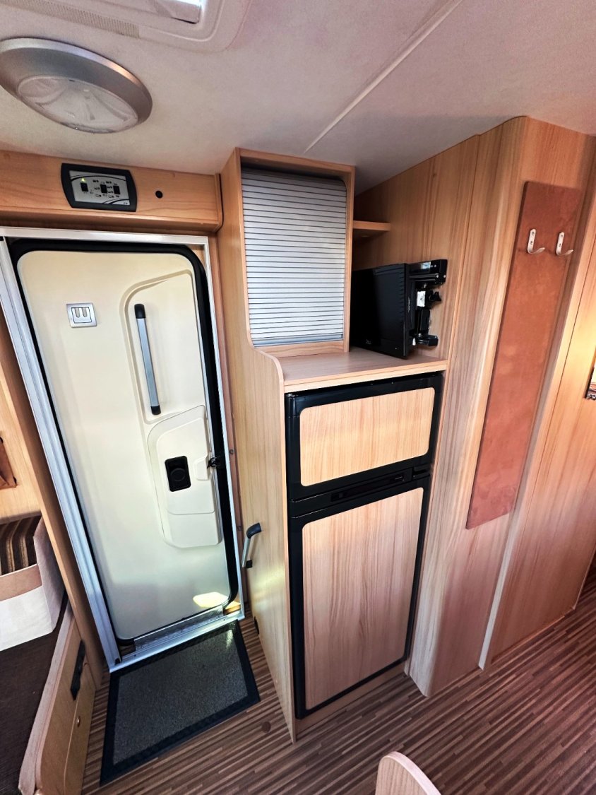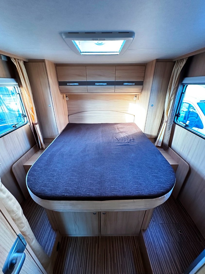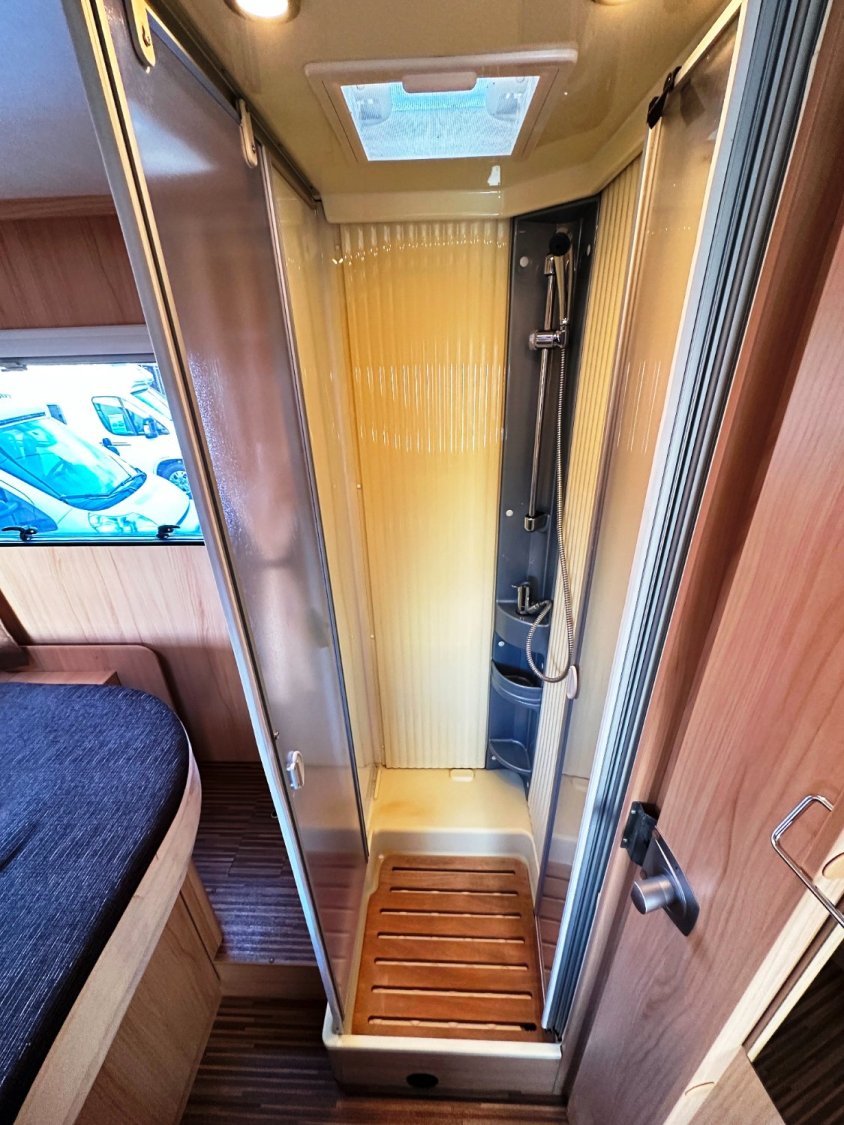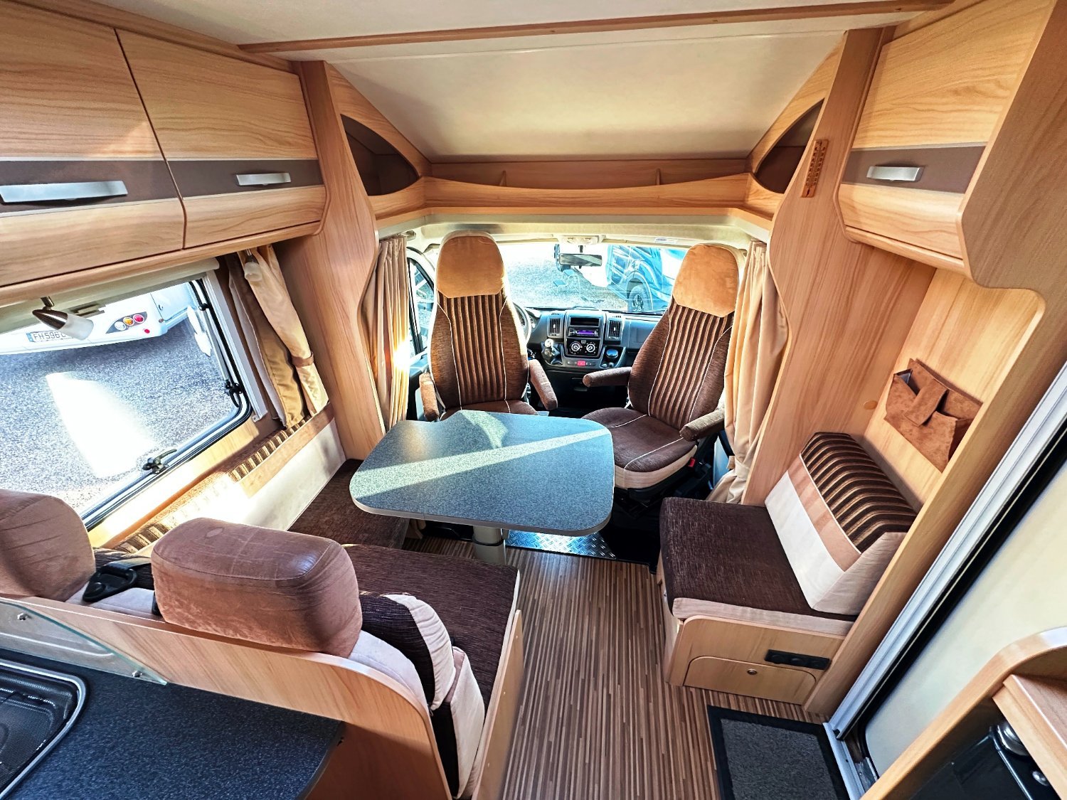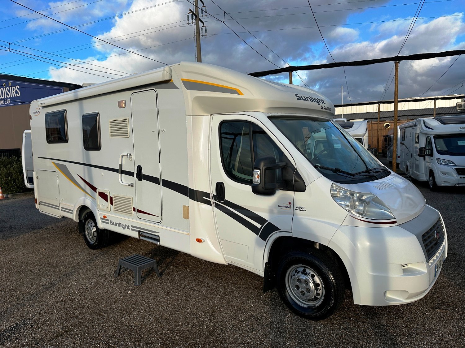 Profilé Sunlight, 3 couchages, lit central sur soute garage (plusieurs vélos), salle de bain avec grande douche entièrement séparée, fermeture chambre arrière, cuisine spacieuse et toute équipée, vaste salon avant avec sièges pivotant et table centrale convertible en un couchage d’appoint.