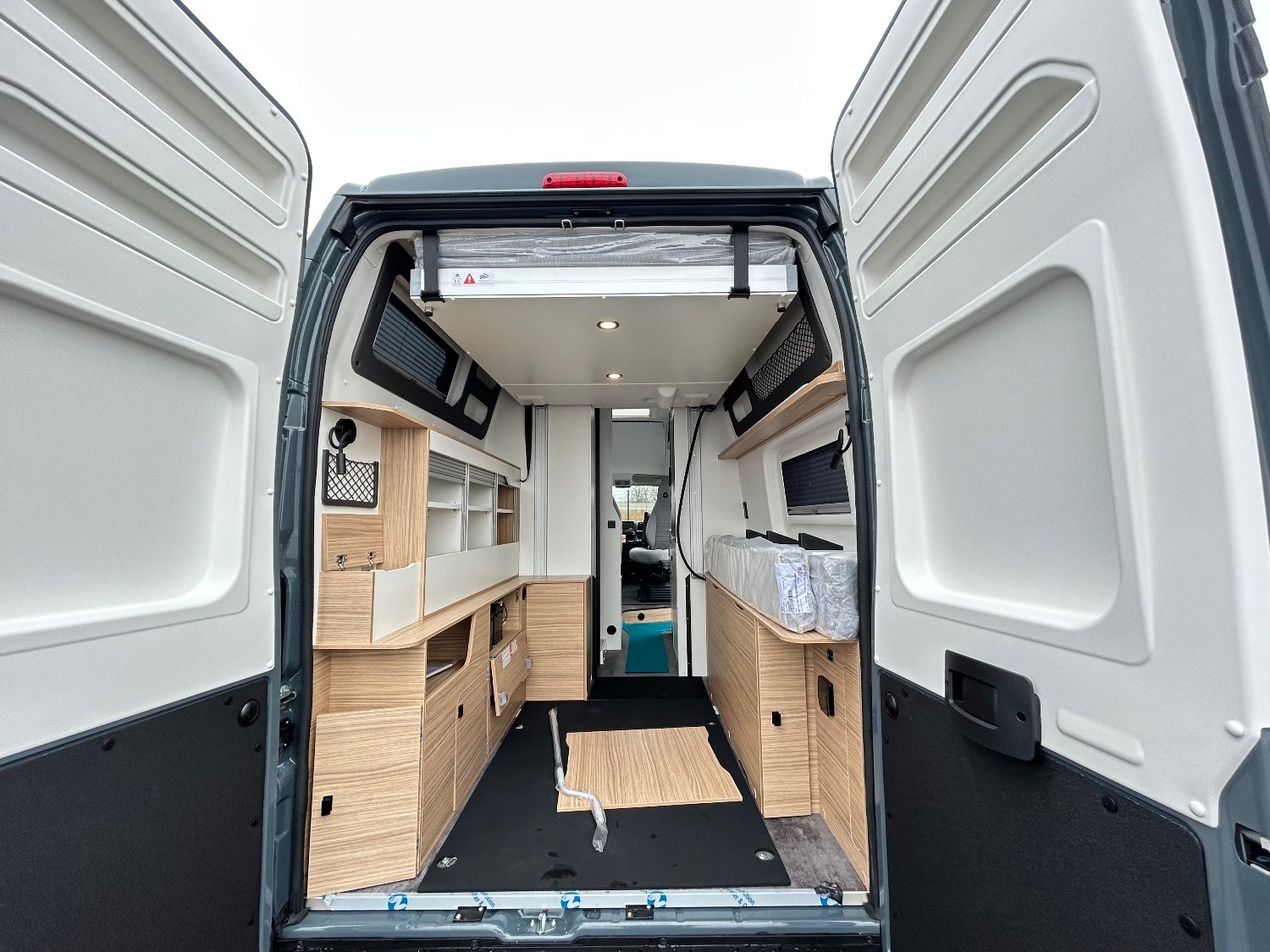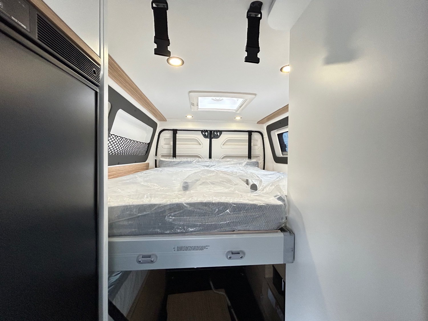 un lit arrière escamotable électriquement, réglable en hauteur. Il permet d’adapter l’espace selon vos besoins :