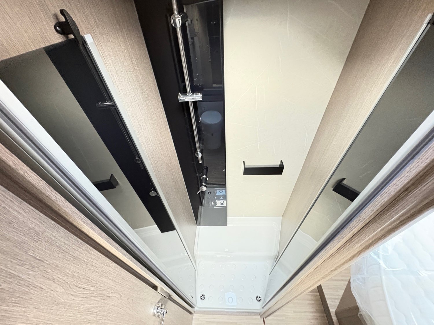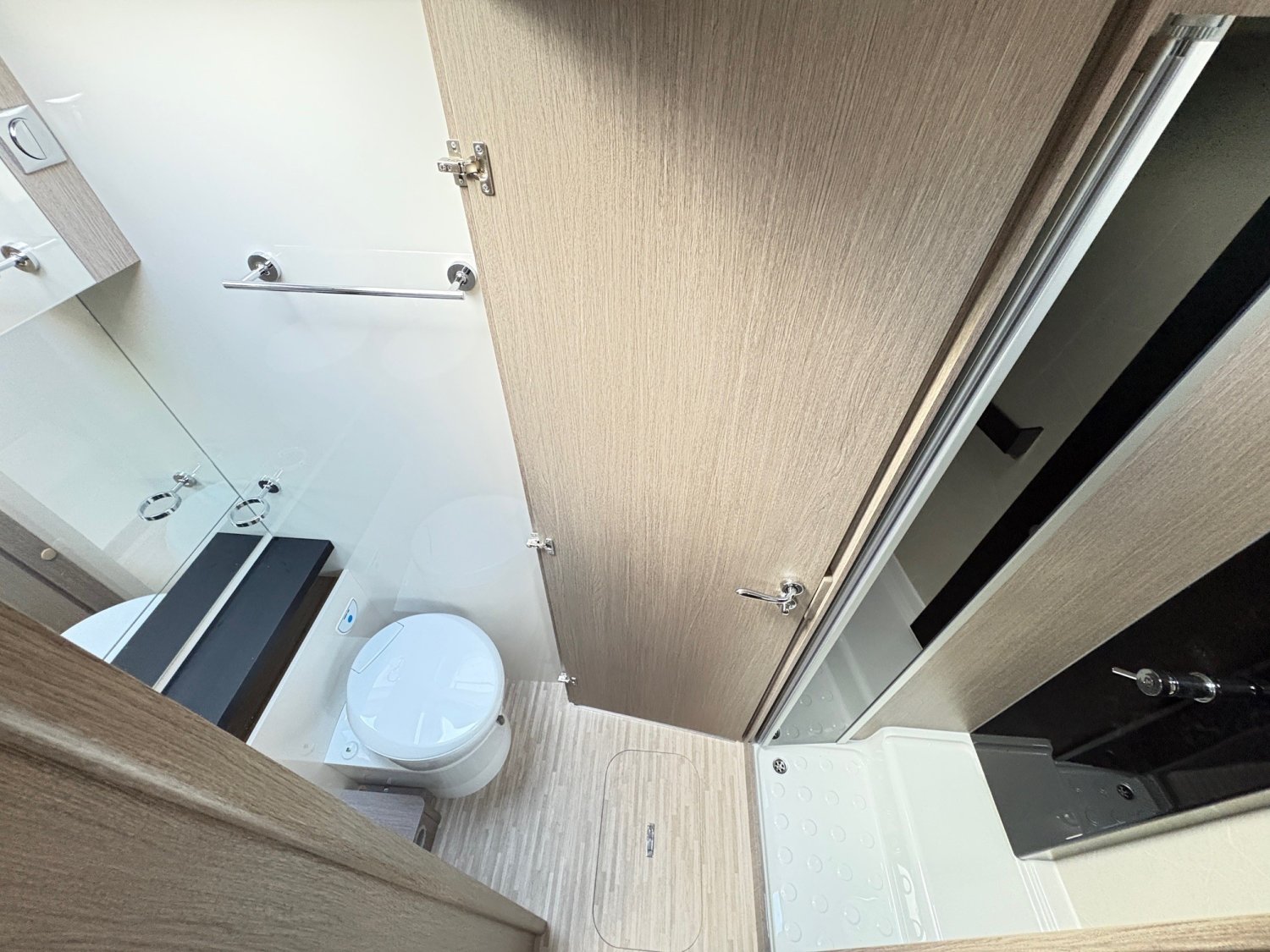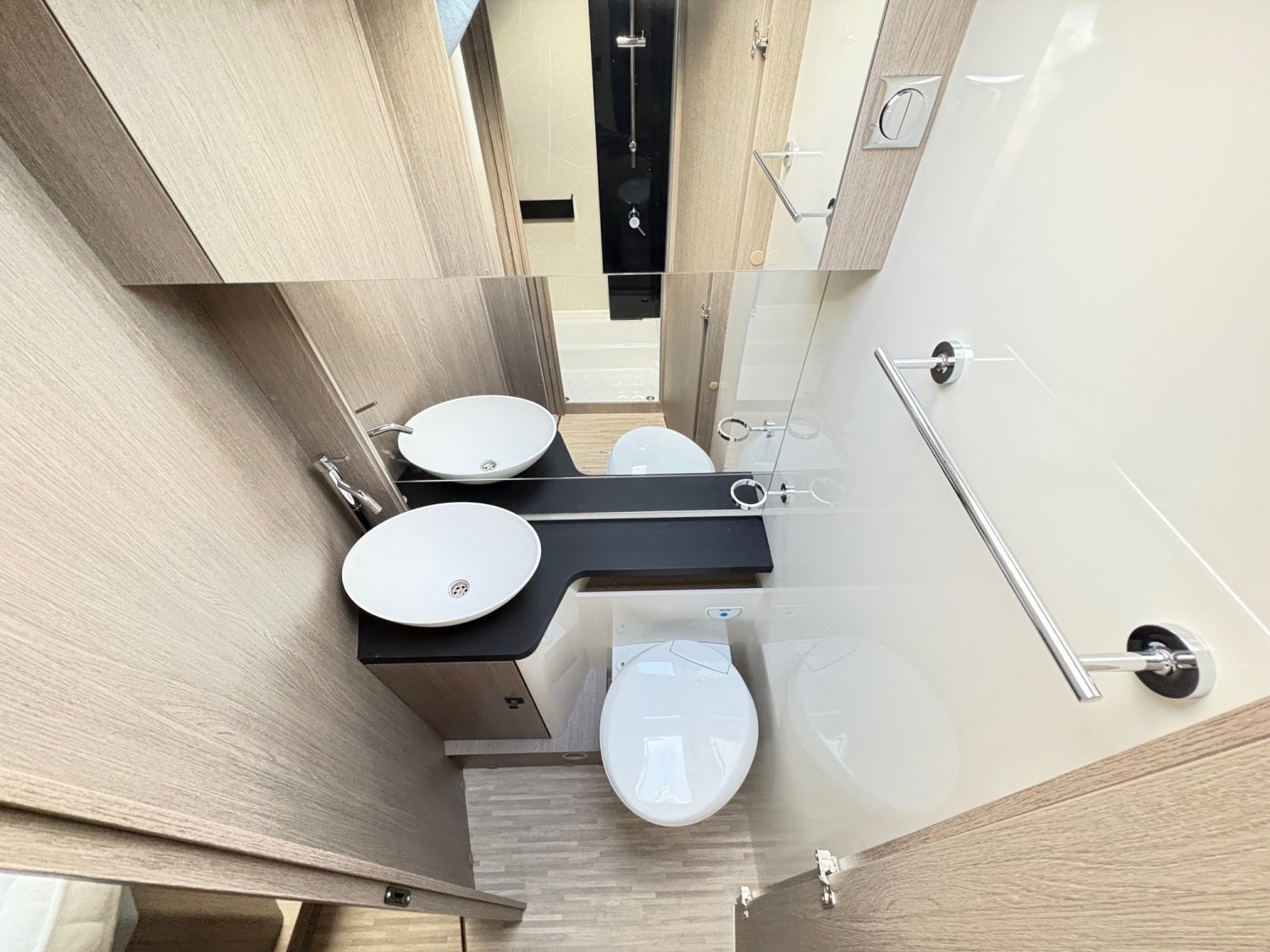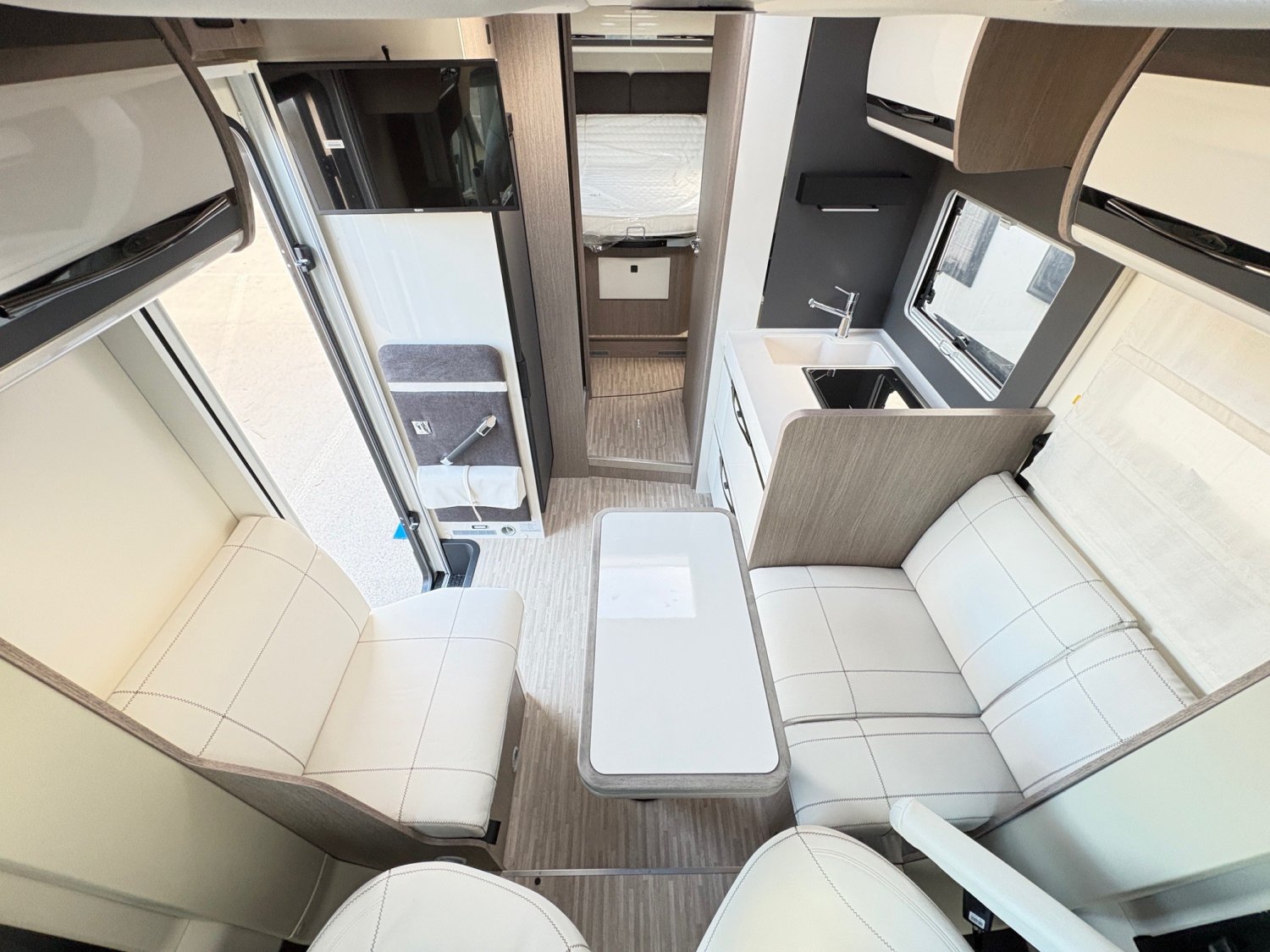 Profilé compact, avec lit centrale, salon face à face, toilettes et douche séparées, garage pour vélos.