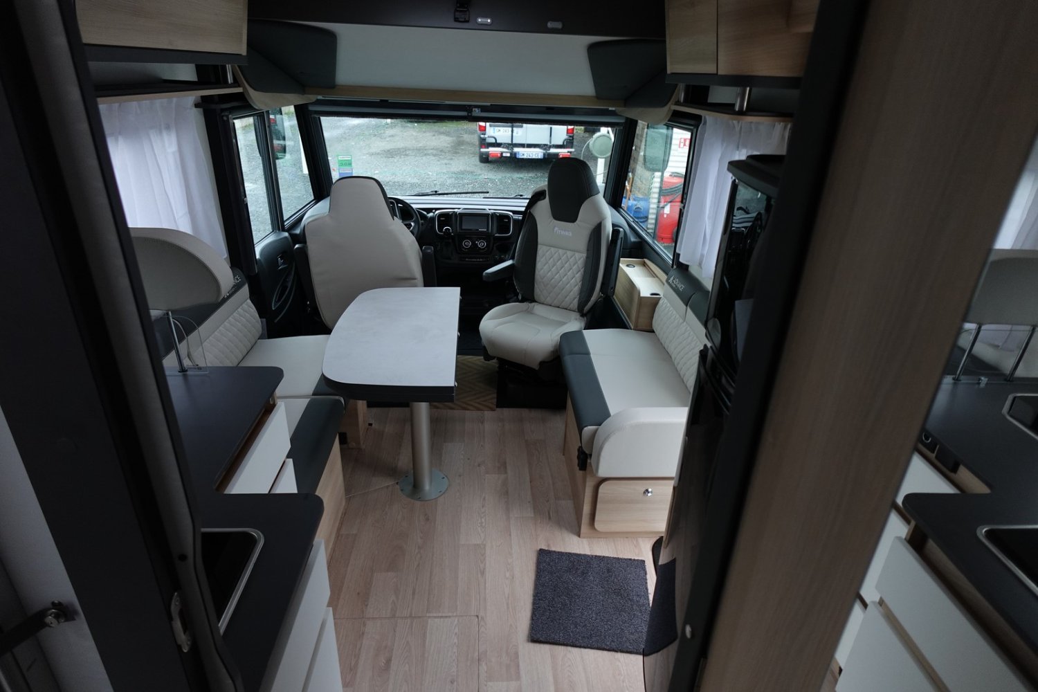 Intégral comprenant un salon avant panoramique avec banquettes face/face, une douche indépendante de l’espace WC / lavabo, un lit central réglable en hauteur, un lit de pavillon 2 places et une cuisine en L avec de nombreux rangements.
