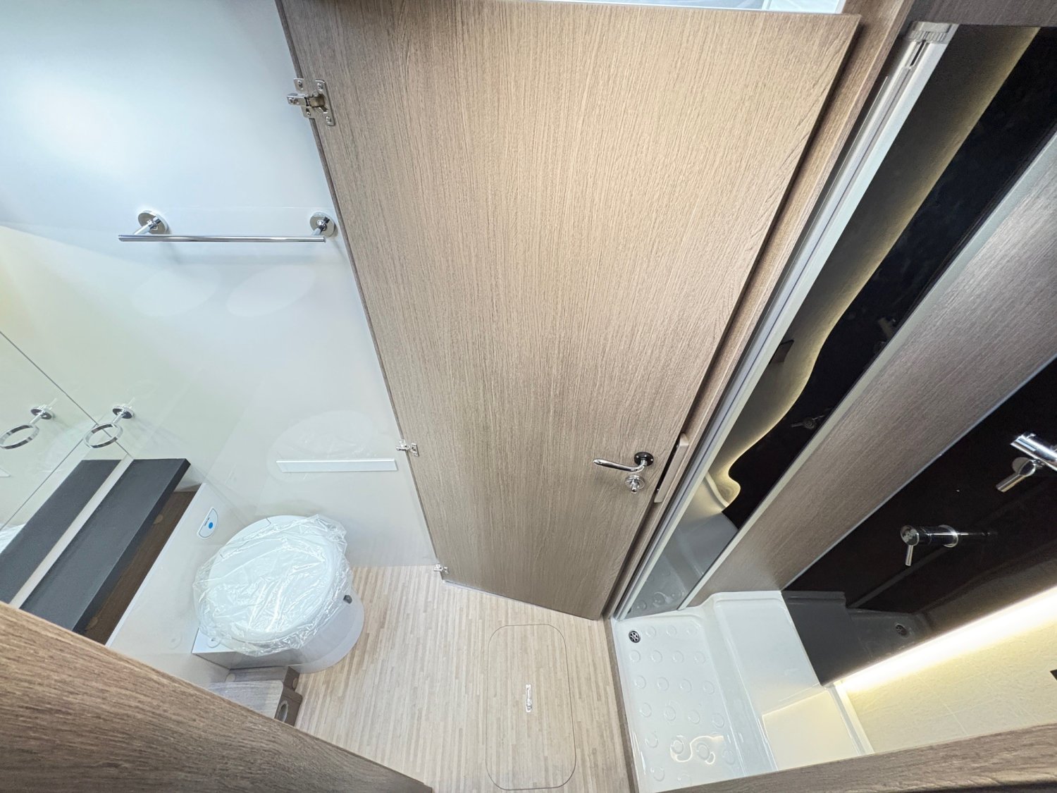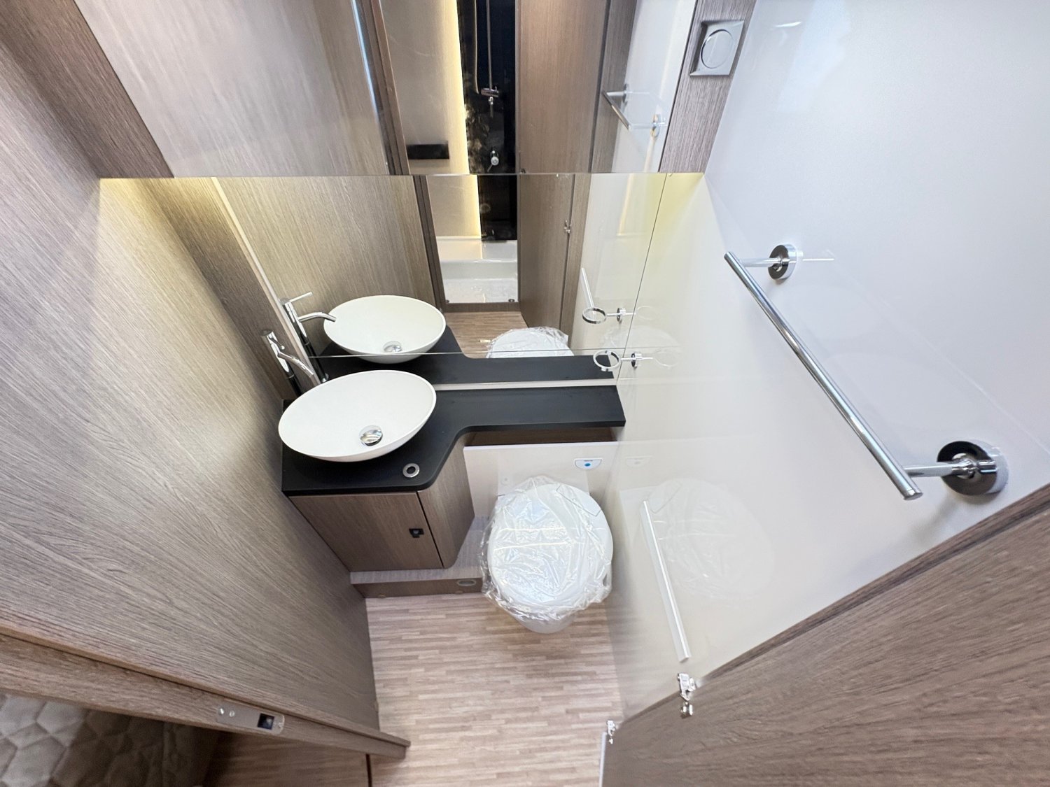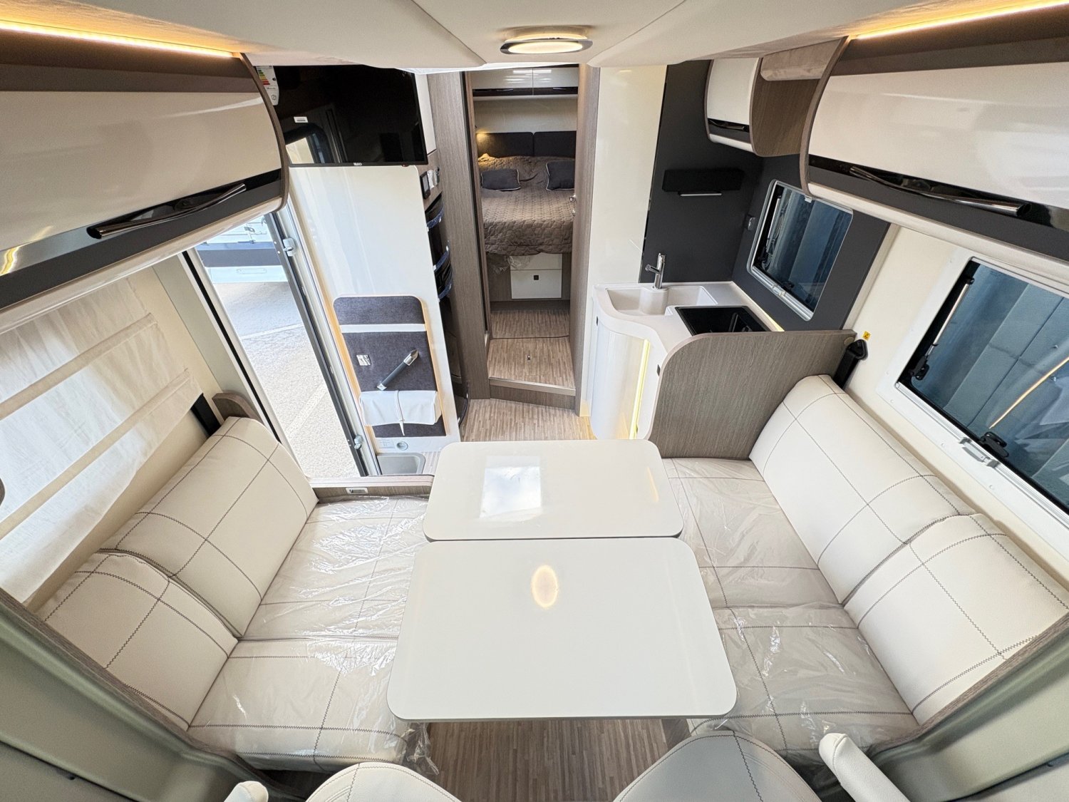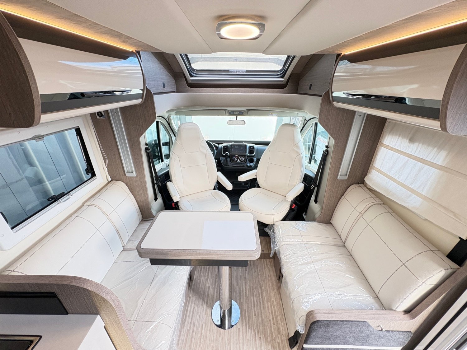 Profilé lit central, 7,47 mètres, avec grand salon face à face. Espace élégant et spacieux : les sièges de la cabine pivotent pour s’intégrer au salon constitué de deux banquettes latérales en vis-à-vis.