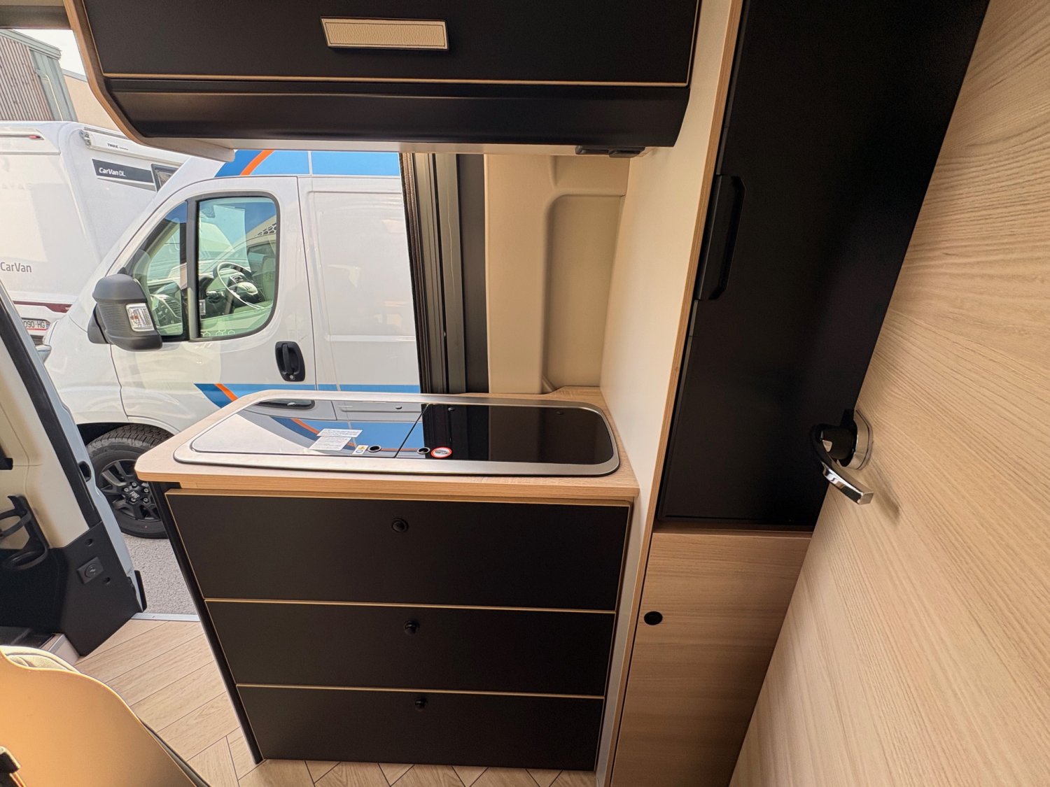 C’est le grand frère du V594S, décliné ici en 5.99 mètres offrant ainsi plus d’espace et la possibilité d’un couchage d’appoint pour un enfant. Astucieuse salle de bains (avec douche, lavabo et WC) et lit arrière de grande dimension, relevable si besoin d’espace. Assurément l’un des plans les plus éprouvés (et appréciés) sur le marché du fourgon aménagé.