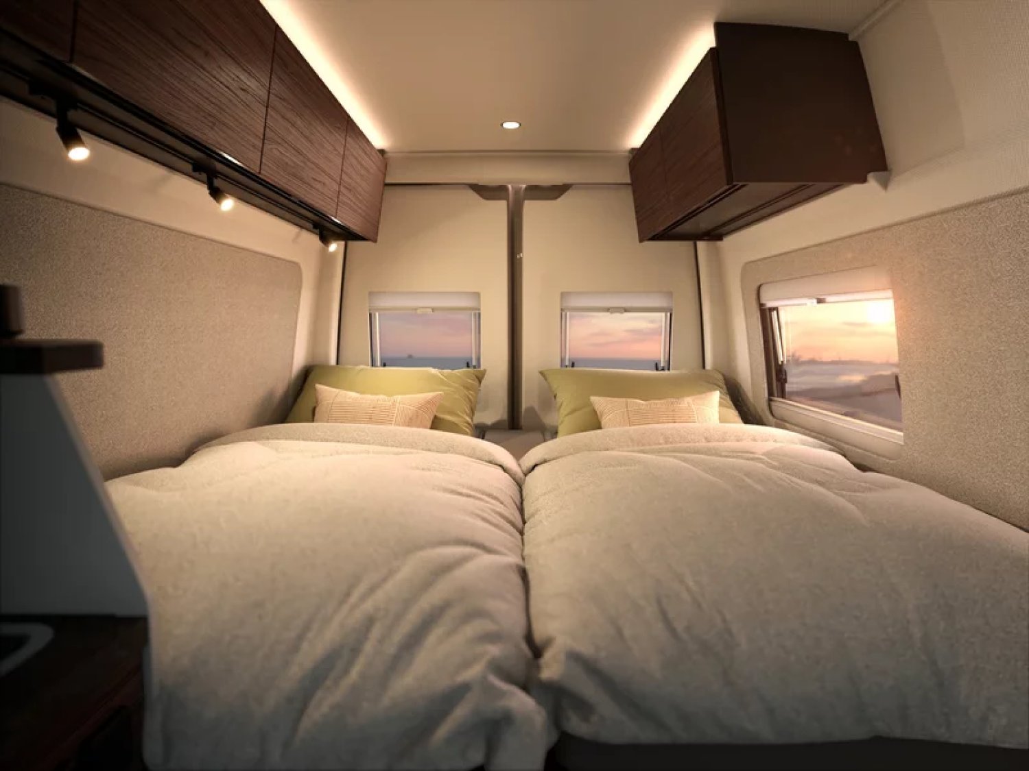 Pack confort cellule : Habillage des parois intérieur en tissu, store plissée cabine, Moustiquaire de porte, extension de plan de travail cuisine, baie à encadrement, batterie Lithium 100 ah, éclairage indirect led : 3 015 €