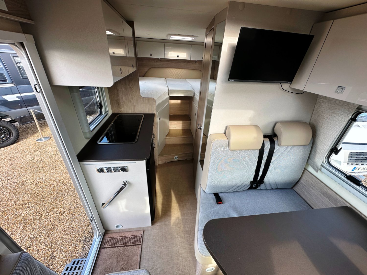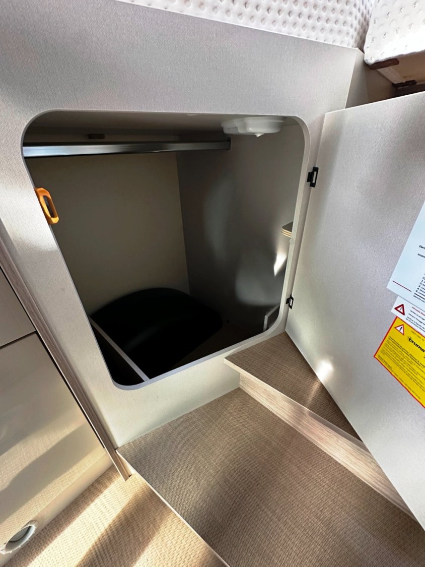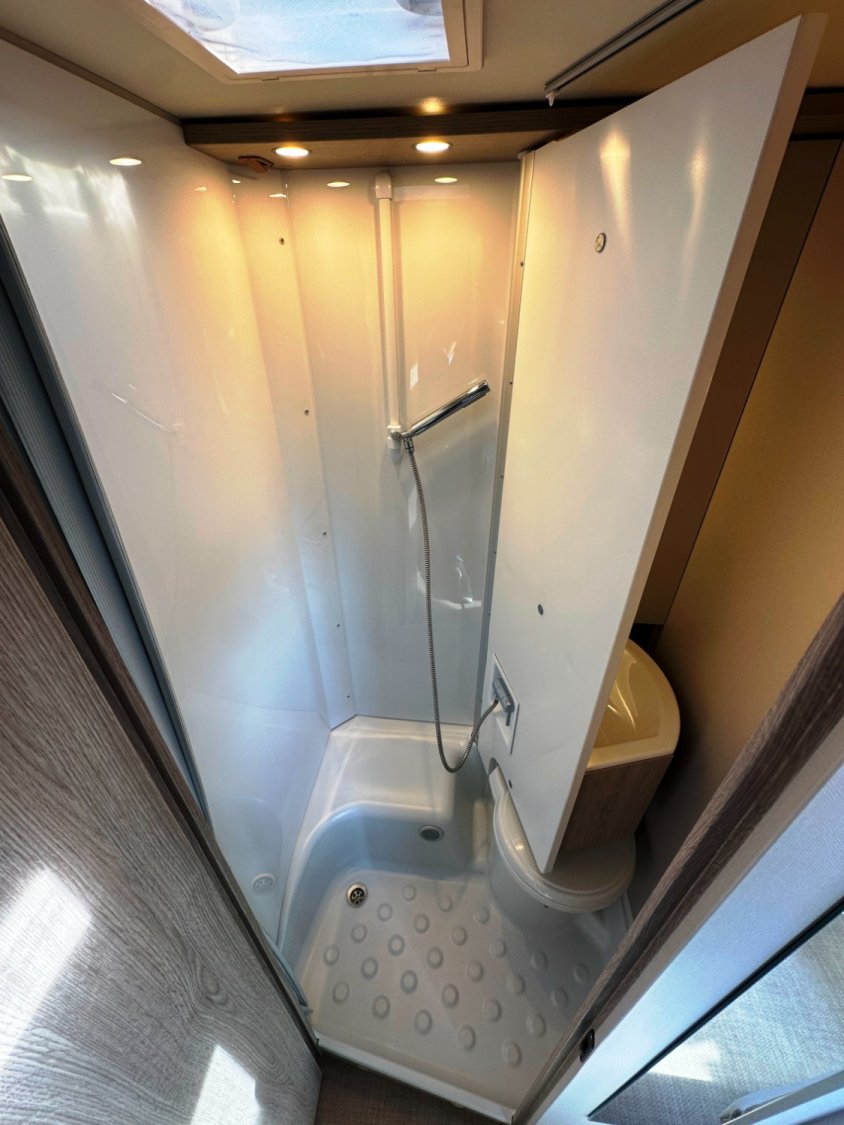 Profilé Bürstner, lits jumeaux sur soute (capacité plusieurs vélos), 3 couchages, salle de bain Vario convertible en vaste douche, cuisine spacieuse et tout équipée, vaste salon avant avec sièges pivotants et table centrale convertible en couchage d’appoint.