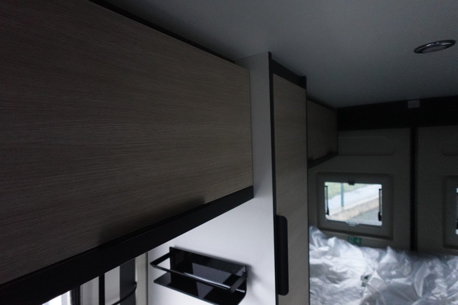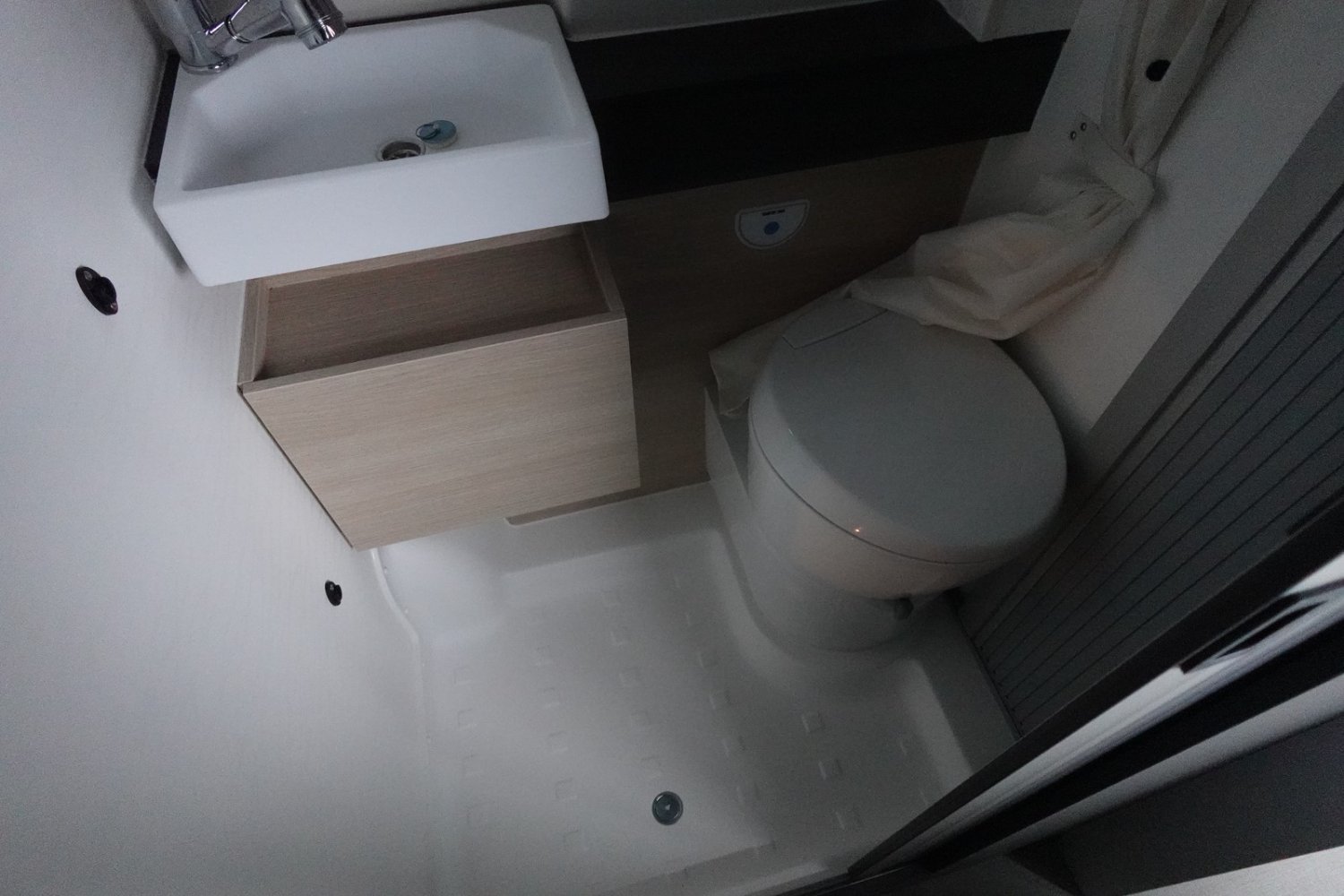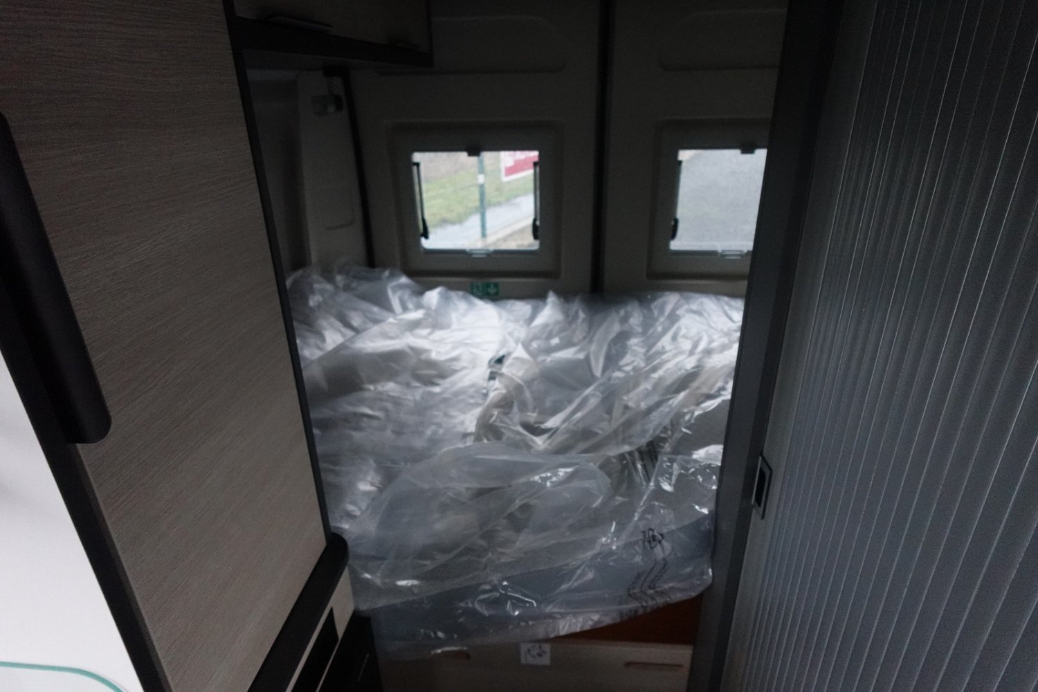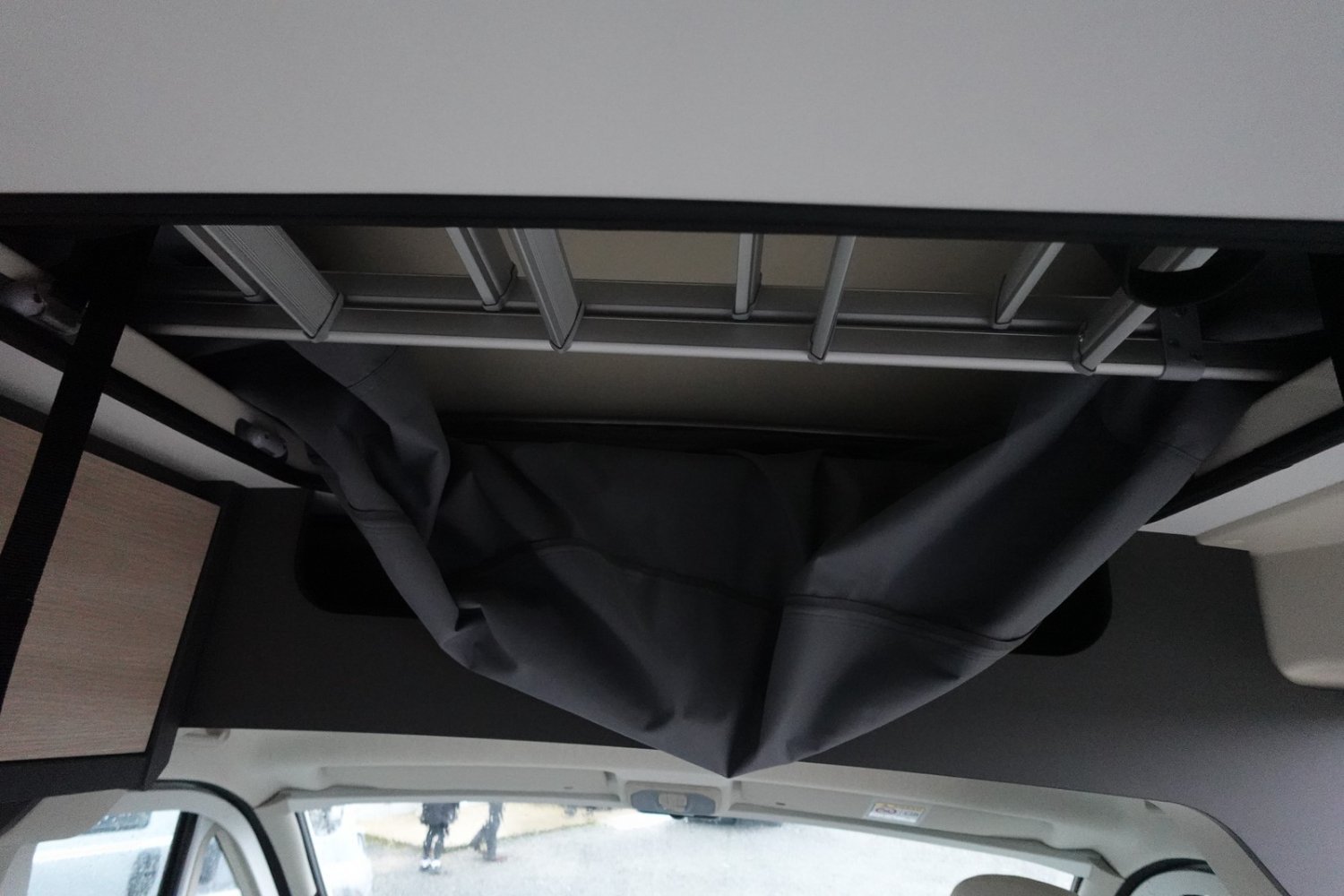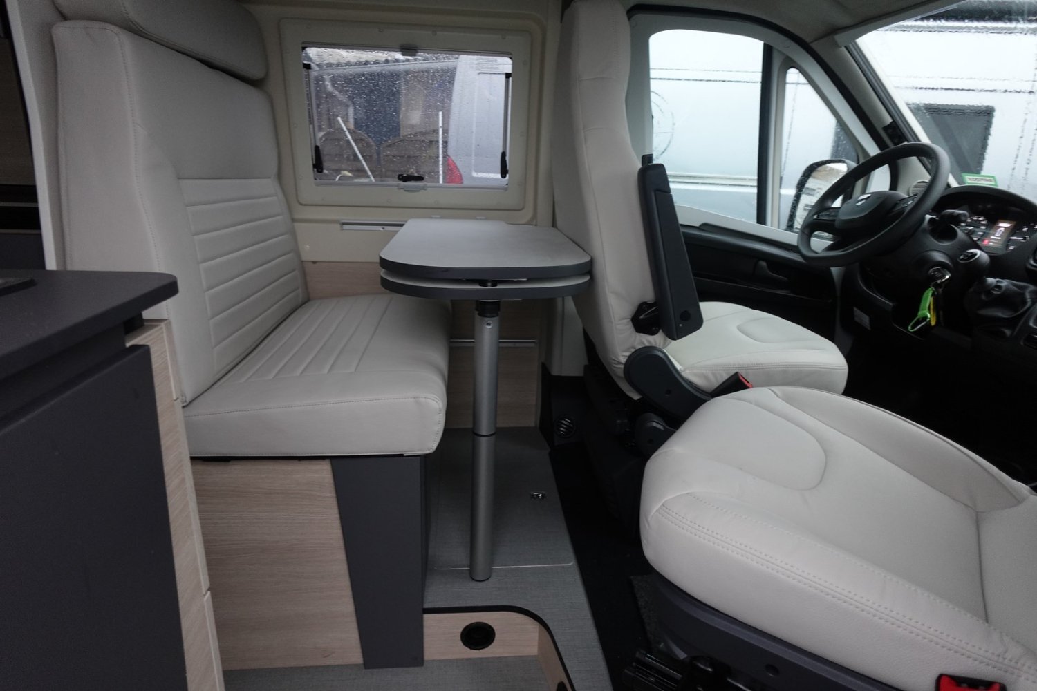 Fourgon aménagé comprenant un salon avant panoramique, un réfrigérateur, une salle d’eau avec douche et WC, un toit relevable avec couchage 2 places, une cuisine avec de nombreux rangements et un lit arrière transversal. Le tout en 5.41 m de long