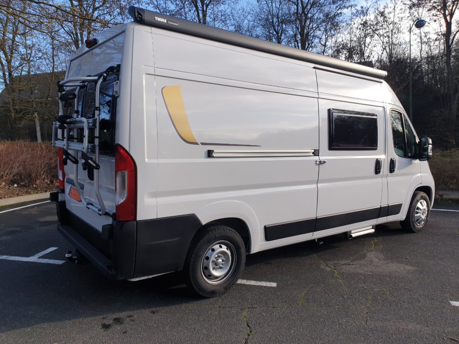 Le fourgon est en auto-consommation électrique avec son panneau solaire (auto-suffisant pour réfrigérateur et TV)