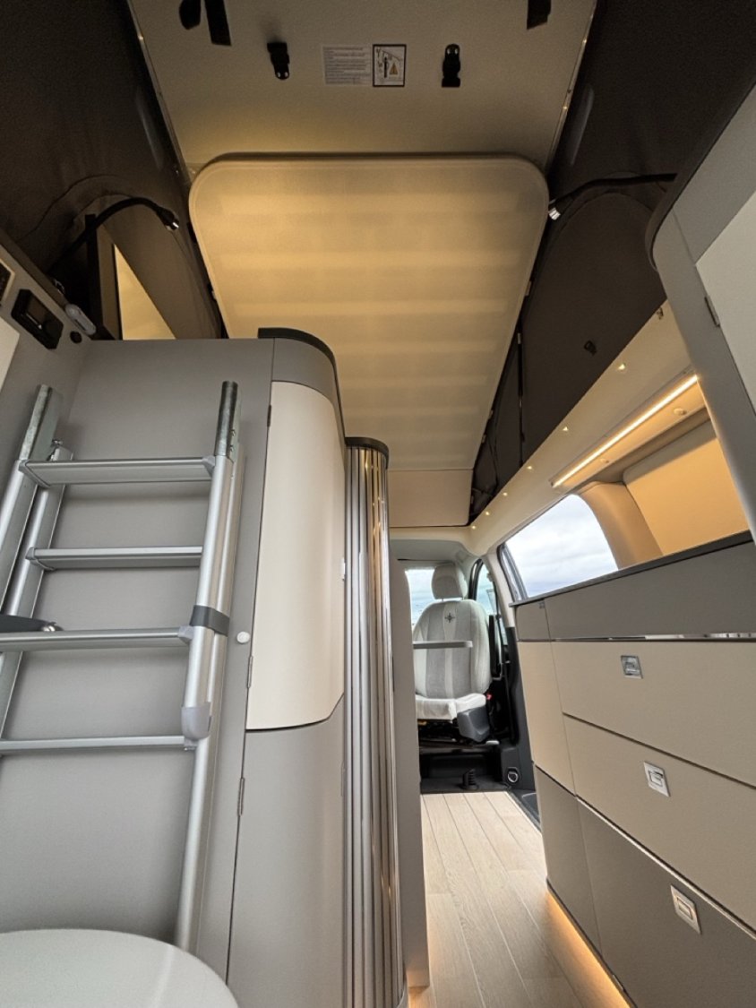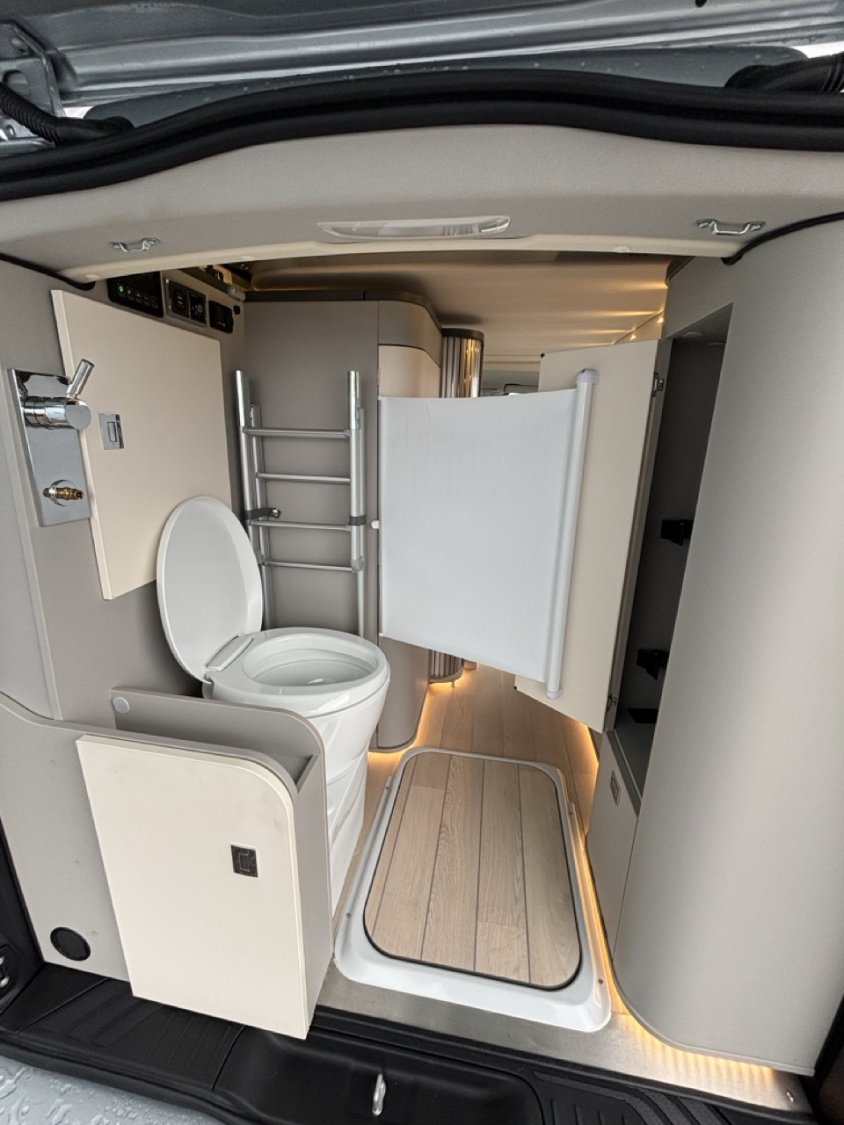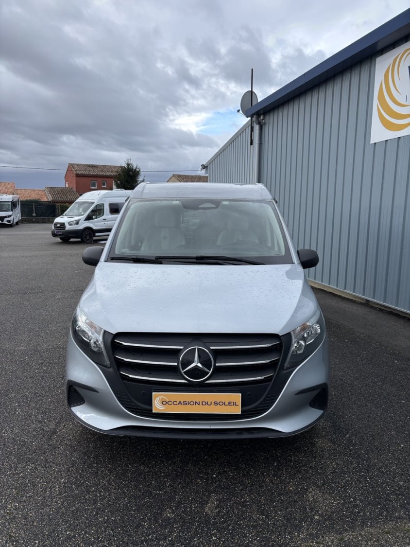 Bouton de démarrage Keyless, Climatisation cabine semi-automatique, Jantes acier enjoliveur 17", PACK DRIVE : Affichage pression des pneus, Assist. de limitation de vitesse intelligent lecture des panneaux, Avertisseur de franchissement de ligne actif, Caméra de recul, Détection somnolence, Freinage d'urgence assisté actif, Régulateur de vitesse, Système stabilisation pour vent latéral, Pare-choc av/arr ton carrosserie, Phares halogènes allumage automatique, Sièges cabines pivotants et réglables en hauteur avec soutien lombaire, Système Multimédia MBUX Auto-radio 5x haut-parleurs, Commande vocale "hey Mercedes", Ecran tactile 10,25" avec interface Bluetooth, port USB-C, Mercedes Remote Services Plus : fermeture centralisée, géolocalisation. Volant multifonctions + combiné instrument couleur, Système appel d'urgence. PACK JULES VERNE : Batterie cellule AGM 92Ah, Portes latérales coulissantes droite et gauche, Pré-disposition électrique attelage, Pré-disposition électrique panneau solaire, Rétroviseurs extérieurs dégivrants rabattables électriquement + détecteur angle mort, FINITION EXCLUSIVE : Boîte auto 9G-tronic, volant gainé cuir, grille calandre chromée, pack stationnement avec caméra de recul, peinture métallisée, vitres teintées latérales & arrière, jantes alliage 17' R1N, 4 MATIC, Pack intégration smartphone (compatible Androïd et Apple car play), Attelage amovible