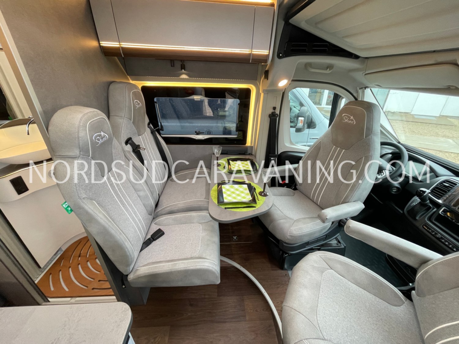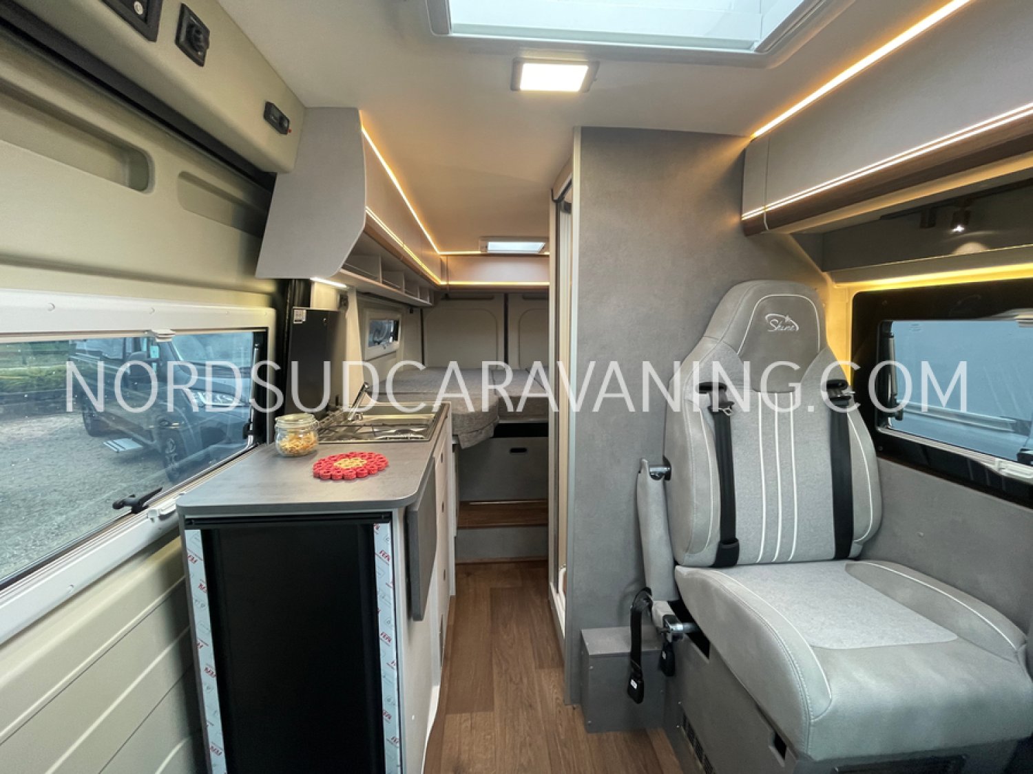 Long de 5.99 mètres, il offre à l’arrière une zone de nuit XXL avec lits jumeaux unifiables.