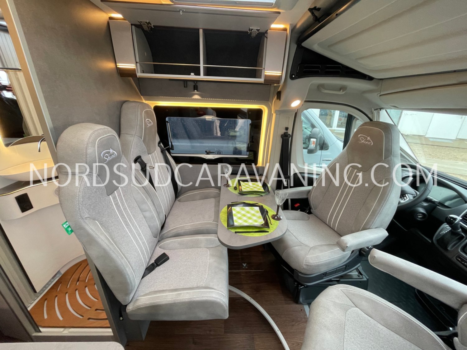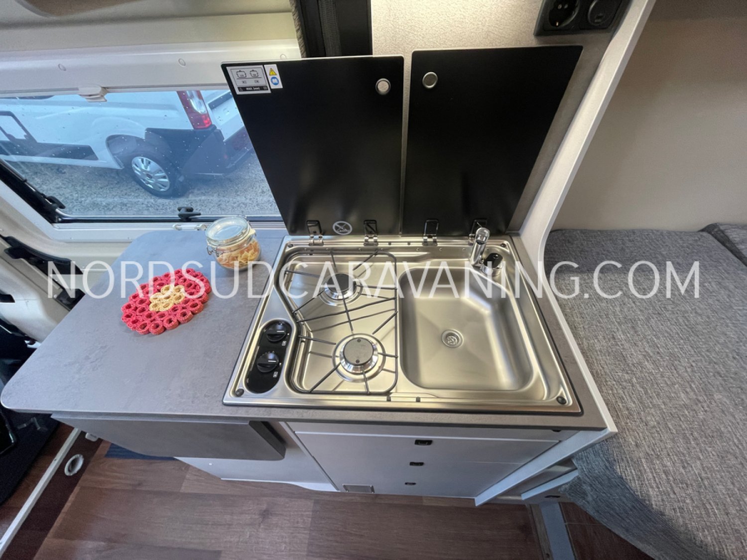Sa dinette est agréable et lumineuse pour une ambiance conviviale. Sa cuisine latérale, pratique et fonctionnelle est équipée d’un réchaud 2 feux, évier et plan de travail rabattable. En face, une jolie salle de bain avec WC, lavabo et une douche vario spacieuse. Sans oublier ses nombreux rangements astucieux !