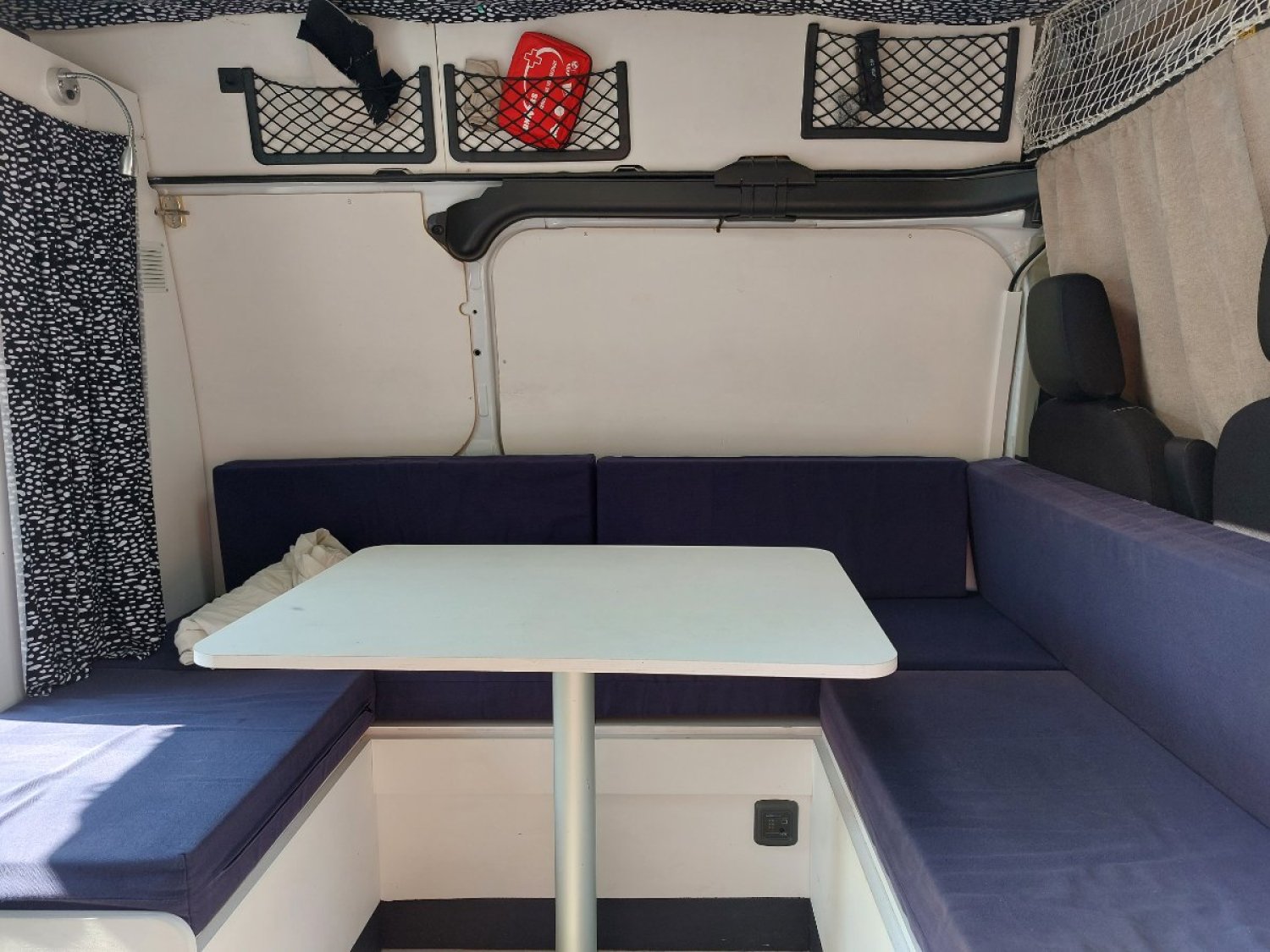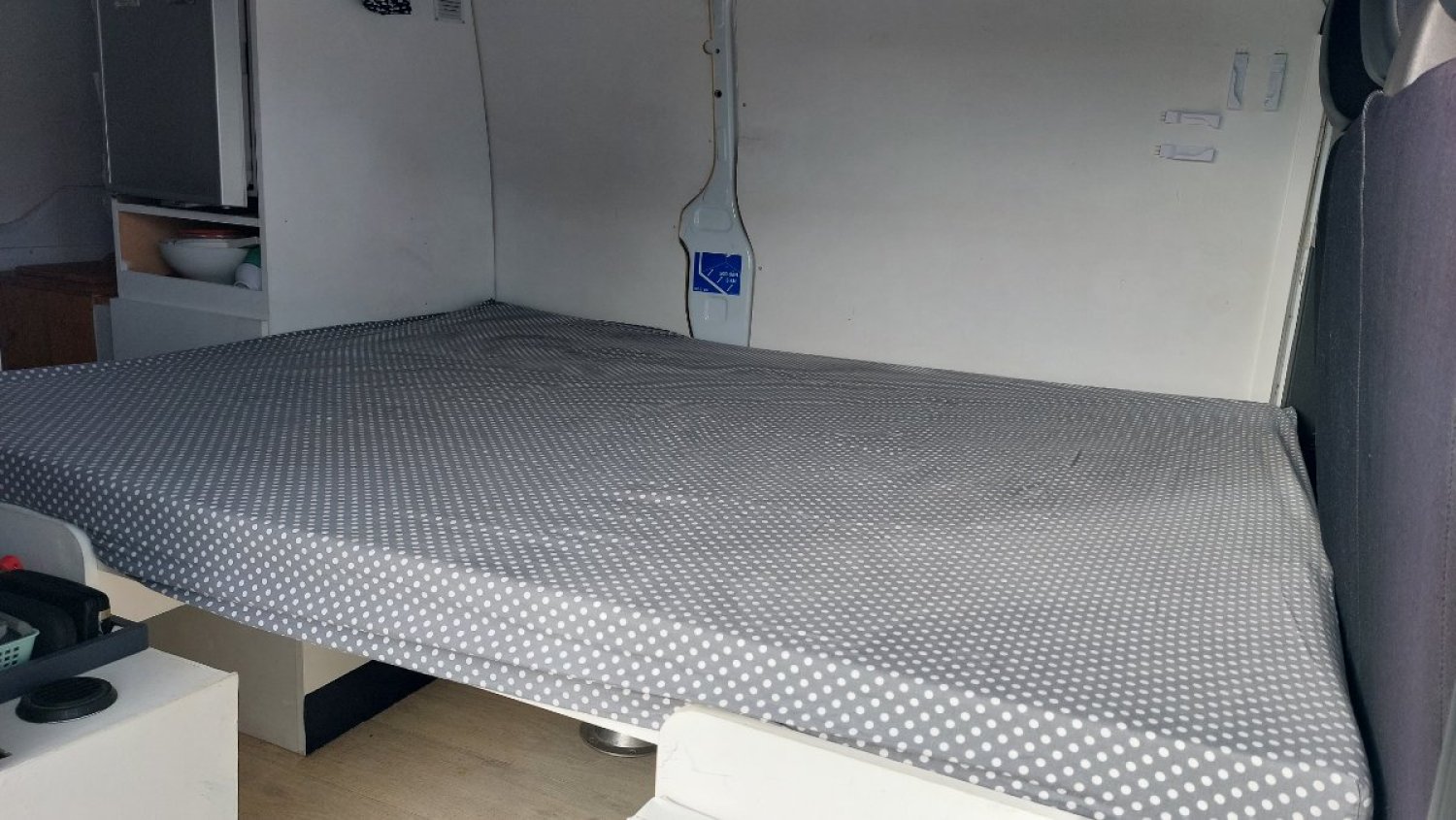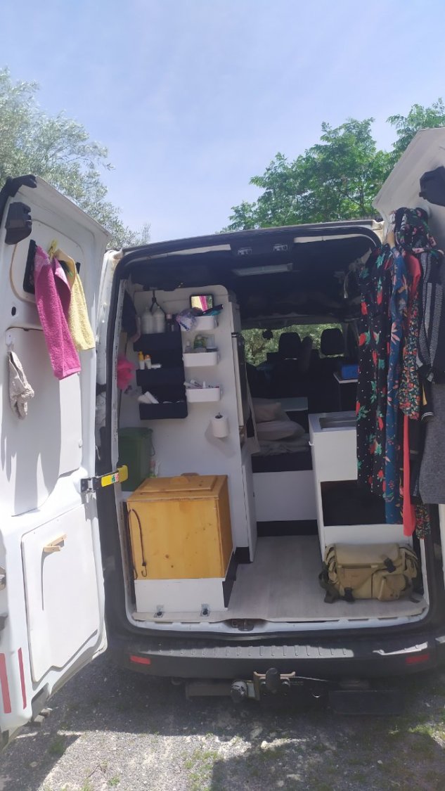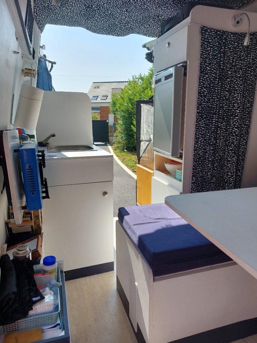 Les meubles ont été achetés chez un fabricant de kits pour fourgons et vans, Héode. Seule l'adaptation au véhicule a été réalisée par nos soins et tous les meubles sont amovibles (le contrôle technique ne pose aucun problème).