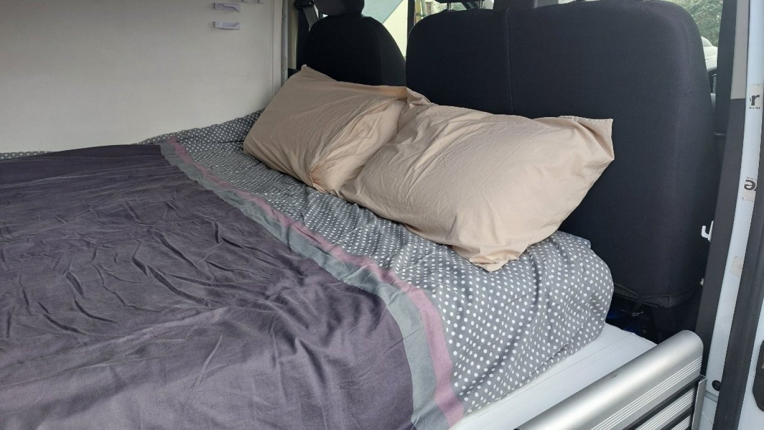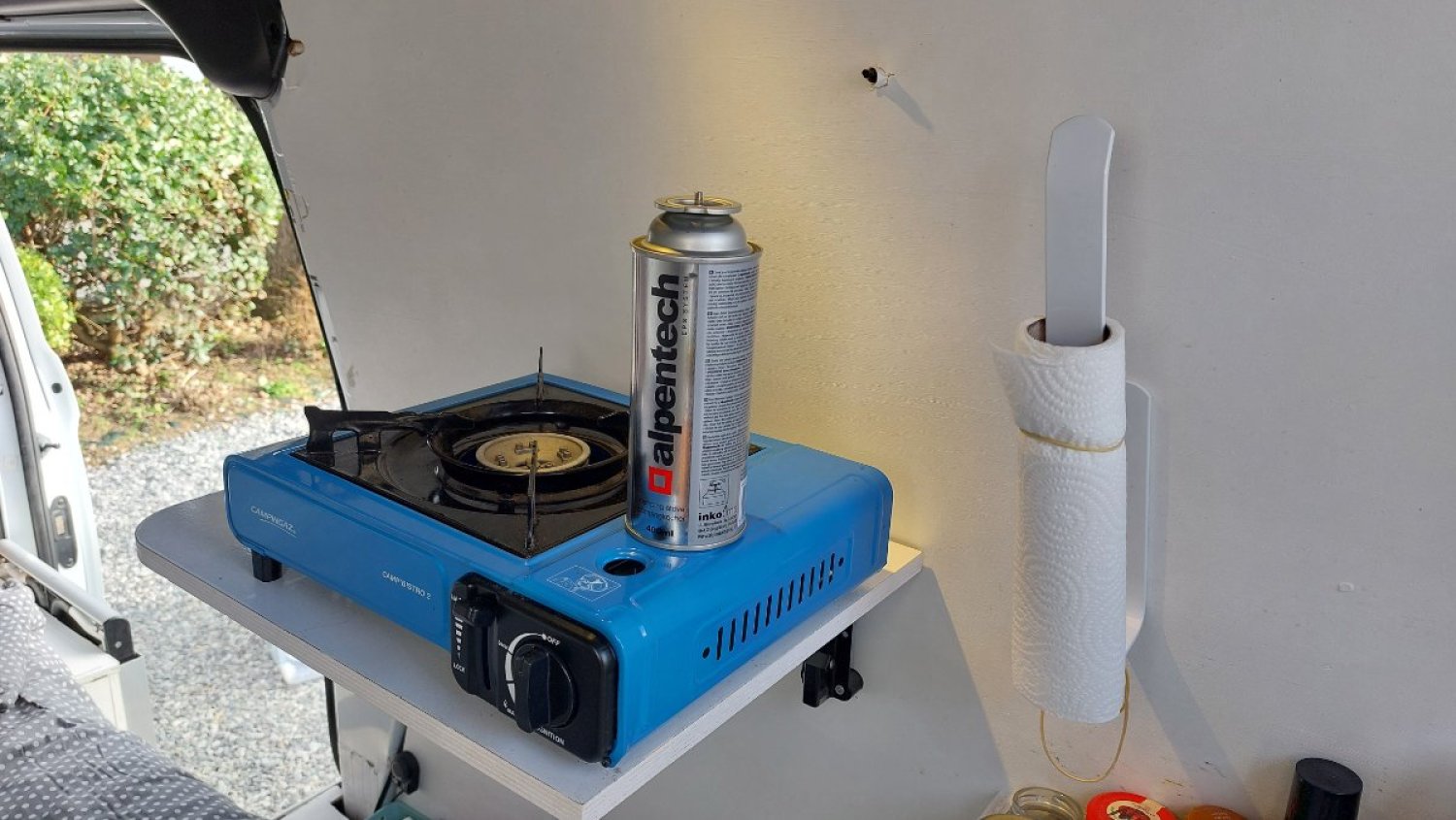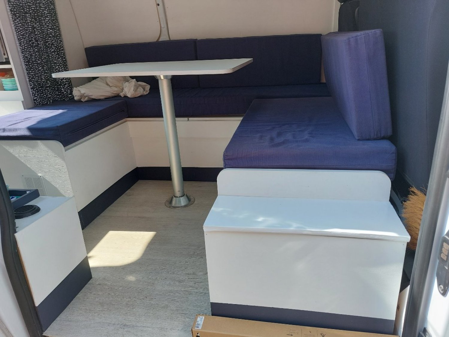 Les meubles ont été achetés chez un fabricant de kits pour fourgons et vans, Héode. Seule l'adaptation au véhicule a été réalisée par nos soins et tous les meubles sont amovibles (le contrôle technique ne pose aucun problème).