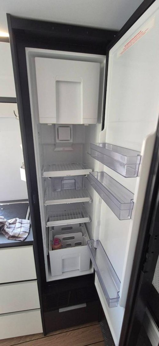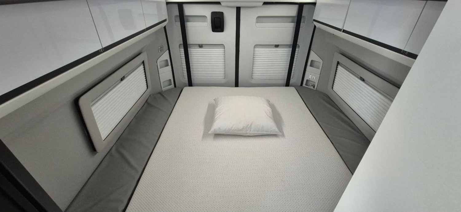 Le véhicule dispose d’un lit transversal arrière électrique pour deux adultes, réglable en hauteur, permettant de créer une grande soute en dessous pouvant accueillir plusieurs vélos ou une moto.