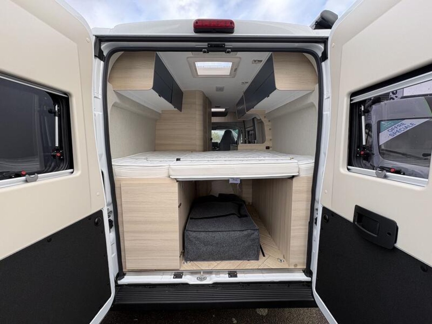 Pack Accessoires Van : Store extérieur - auvent, panneau solaire 200W, éclairage extérieur porte d'entrée, moustiquaire de porte, store intérieur cabine, compléments couchage dinette, enjoliveurs de baies arrières + 2 batteries cellule : 3780 €