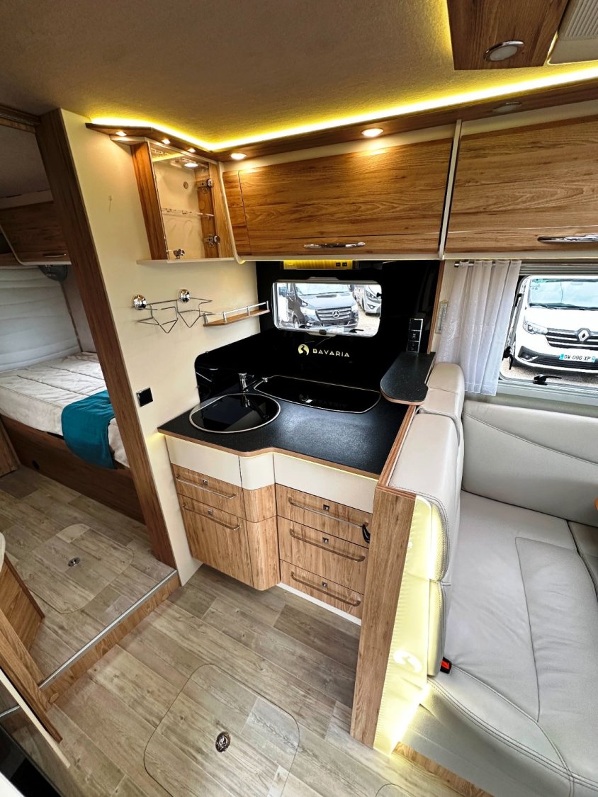 Intégral Bavaria, lits jumeaux, 4 couchages, salle de bain avec grande douche entièrement séparée, fermeture chambre arrière, cuisine spacieuse et toute équipée, vaste salon avant avec sièges pivotant et table centrale + lit pavillon en cabine pour deux adultes.