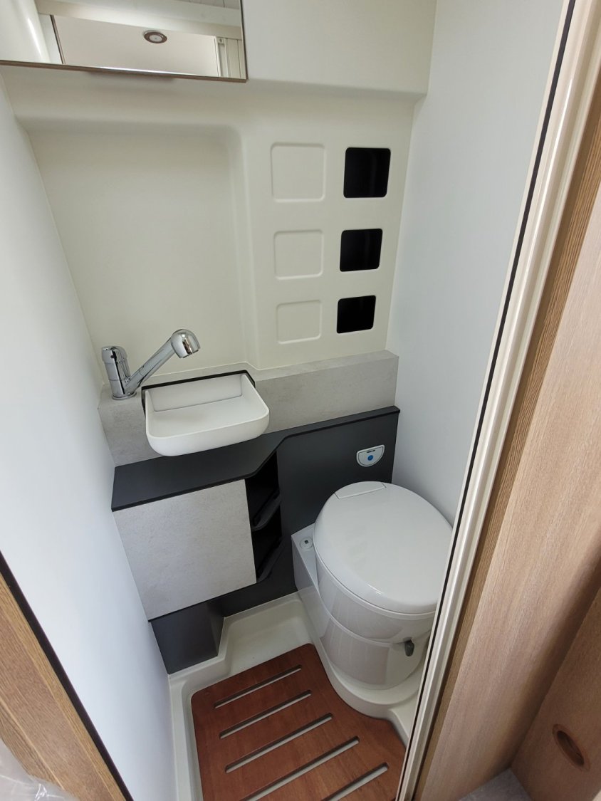 Cabinet de toilette avec porte coulissante, lavabo rabattable, et lanterneau. Ce cabinet de toilette est entièrement conçu en matériau de craignant pas les projections d’eau. Donc pas de rideau plastique inconfortable et de l’aisance pour la douche.