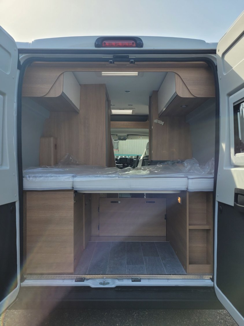 Lit arrière 2 places permanent et relevable + lit 1 place transformable à partir de la dinette.