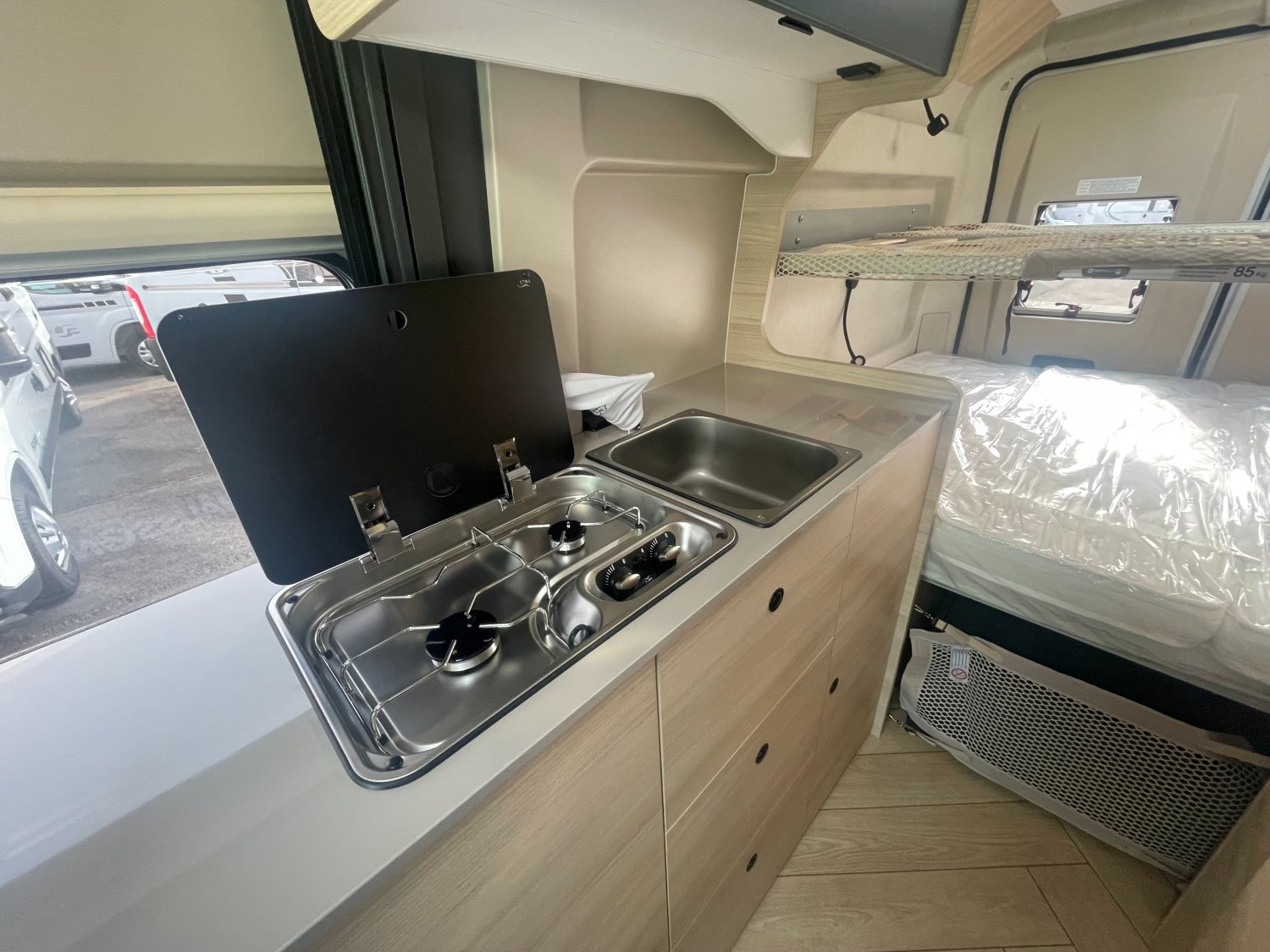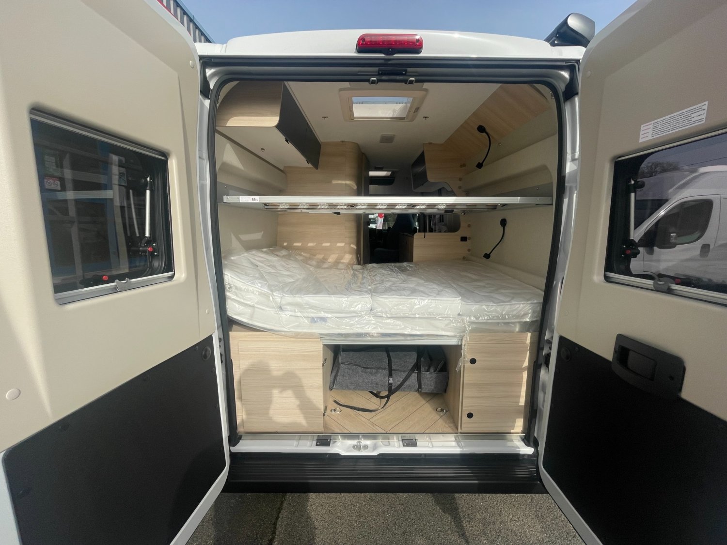 Marchepied électrique, Prises USB/USB-C, Pré-équipement TV, Lanterneau panoramique, Rétroviseurs électriques dégivrants, Fenêtres double-vitrage avec combiné stores moustiquaire, Régulateur / limiteur de vitesse, Baies arrière ouvrantes, Jantes acier avec enjoliveurs 15'' gris, Climatisation manuelle de cabine, Extension table dinette