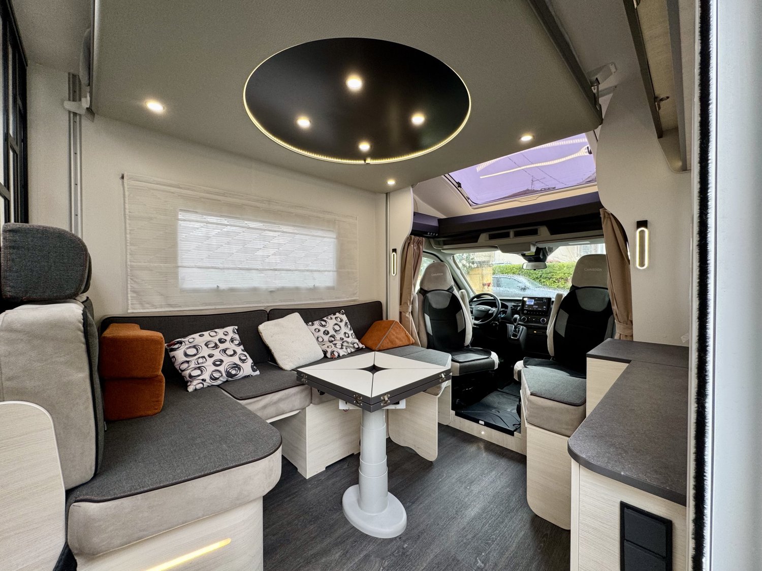 Le Chausson 660 Titanium Édition est équipé d’un lit pavillon électrique de 160 cm de large, situé au-dessus du salon. Ce système ingénieux permet de profiter d’un vrai couchage confortable pour deux personnes, tout en conservant un grand espace de vie pendant la journée.
