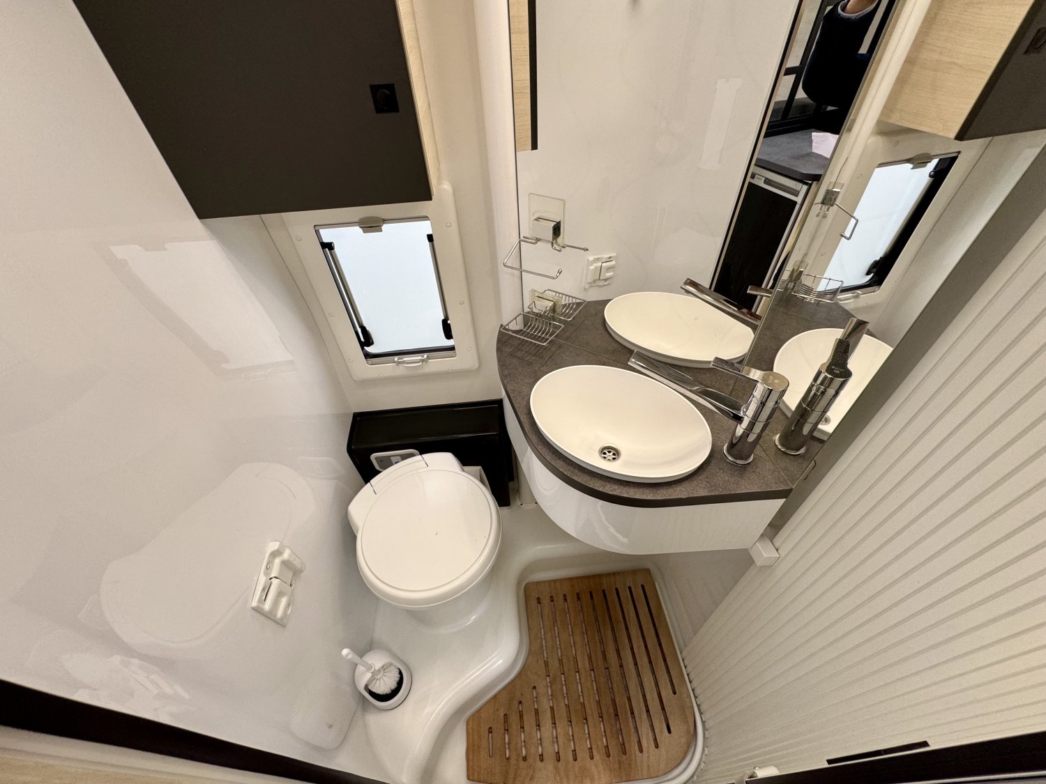 Le camping-car propose également une salle d’eau fonctionnelle avec une paroie amovible permettant de profiter d’un véritable espace toilette confortable lors de vos déplacements ainsi que d’une vrai douche.