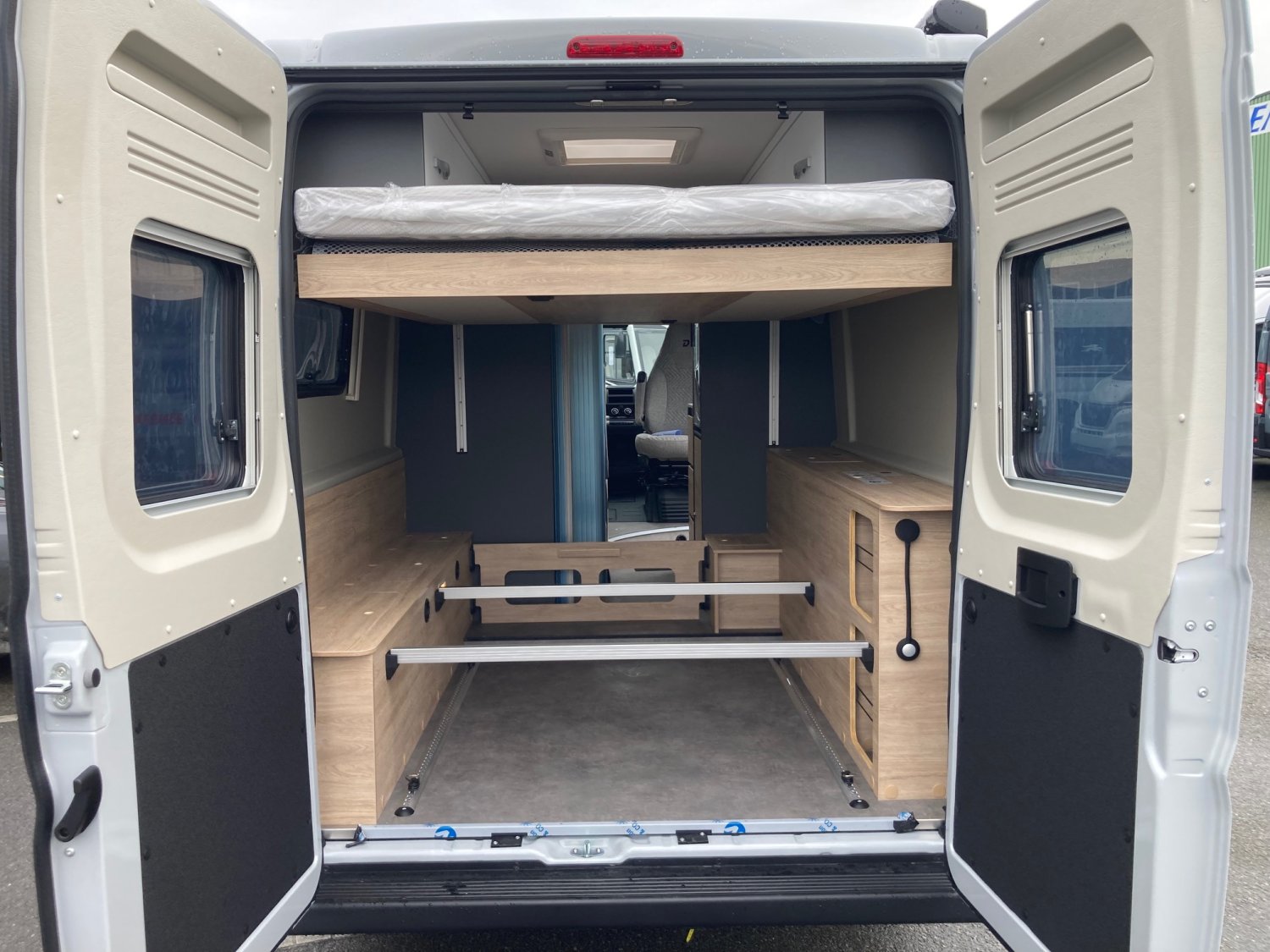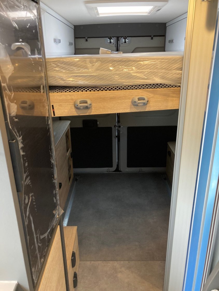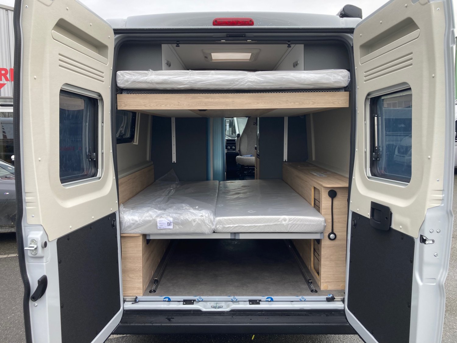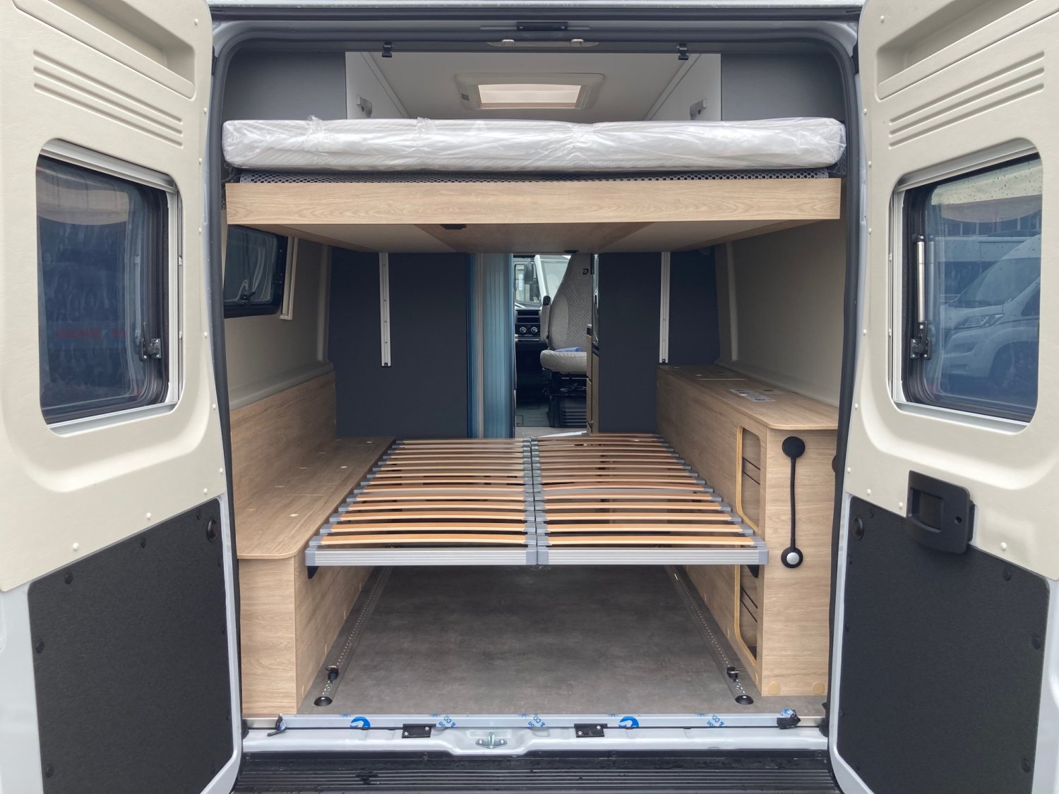 Fourgon 6m40 avec douche centrale + lits jumeaux + lit supplémentaire arrière
