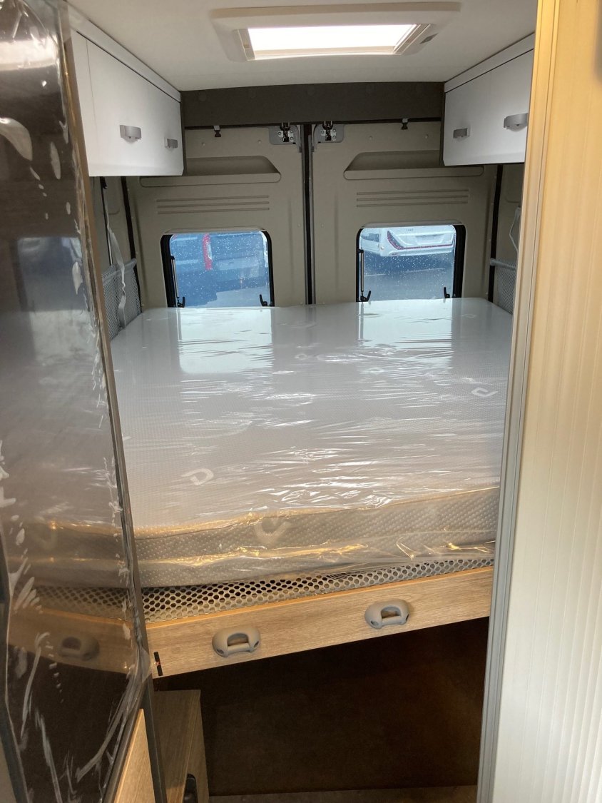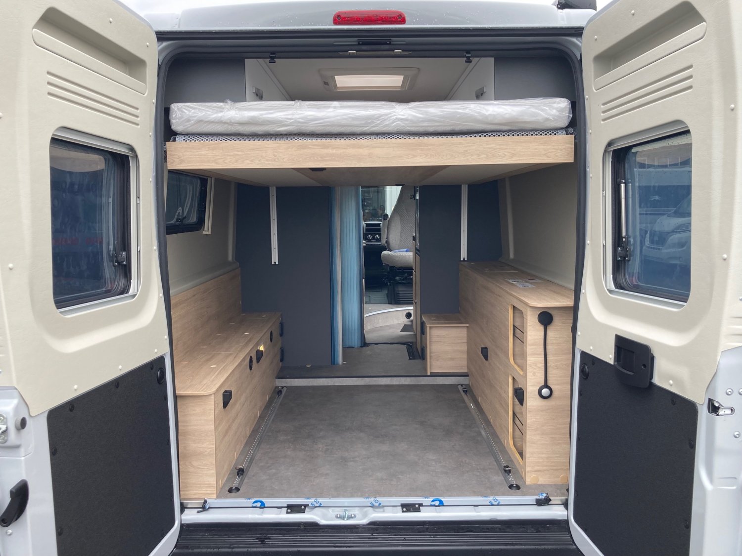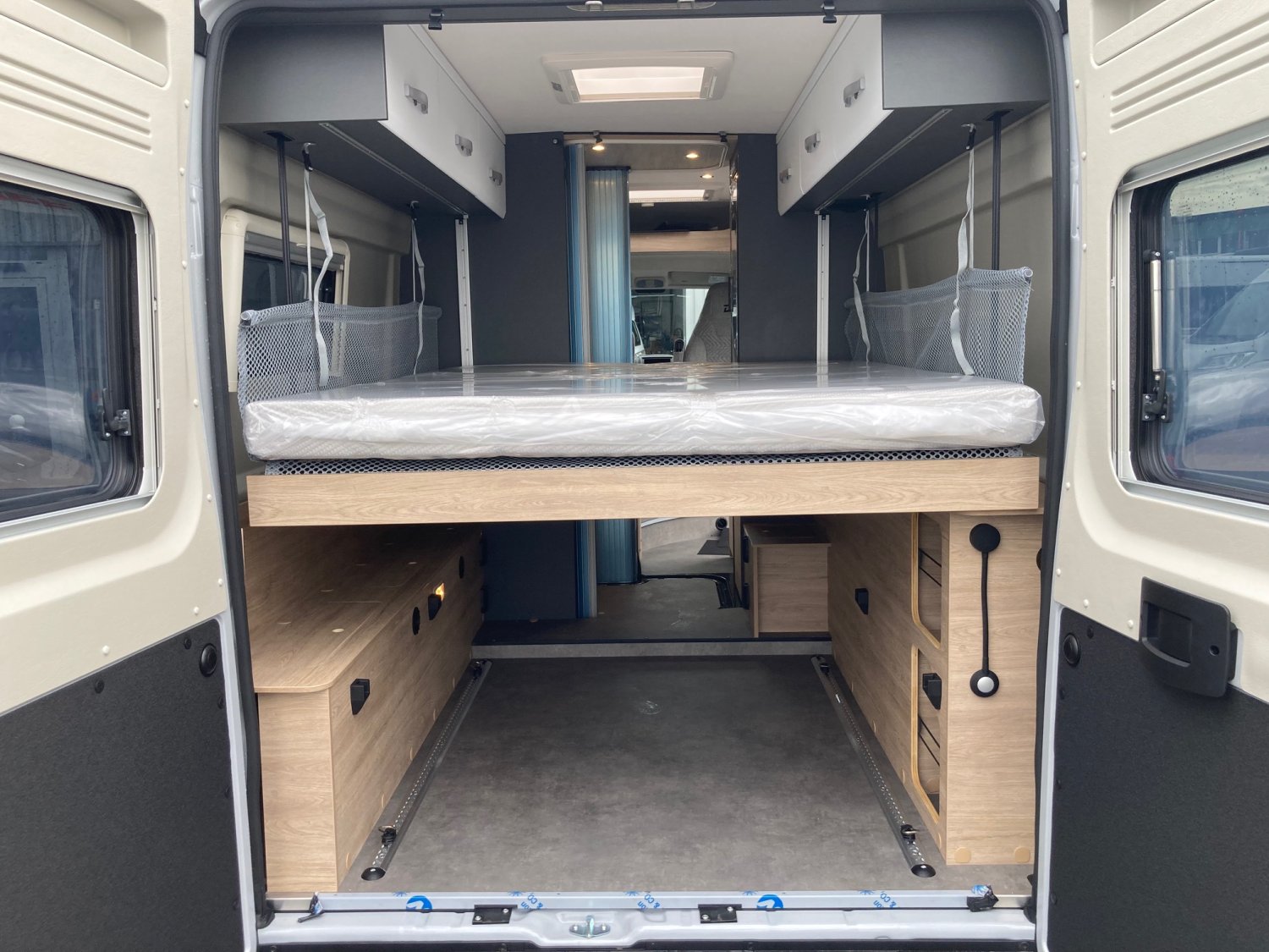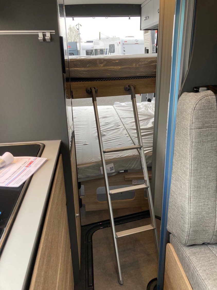 Fourgon 6m40 avec douche centrale + lits jumeaux + lit supplémentaire arrière
