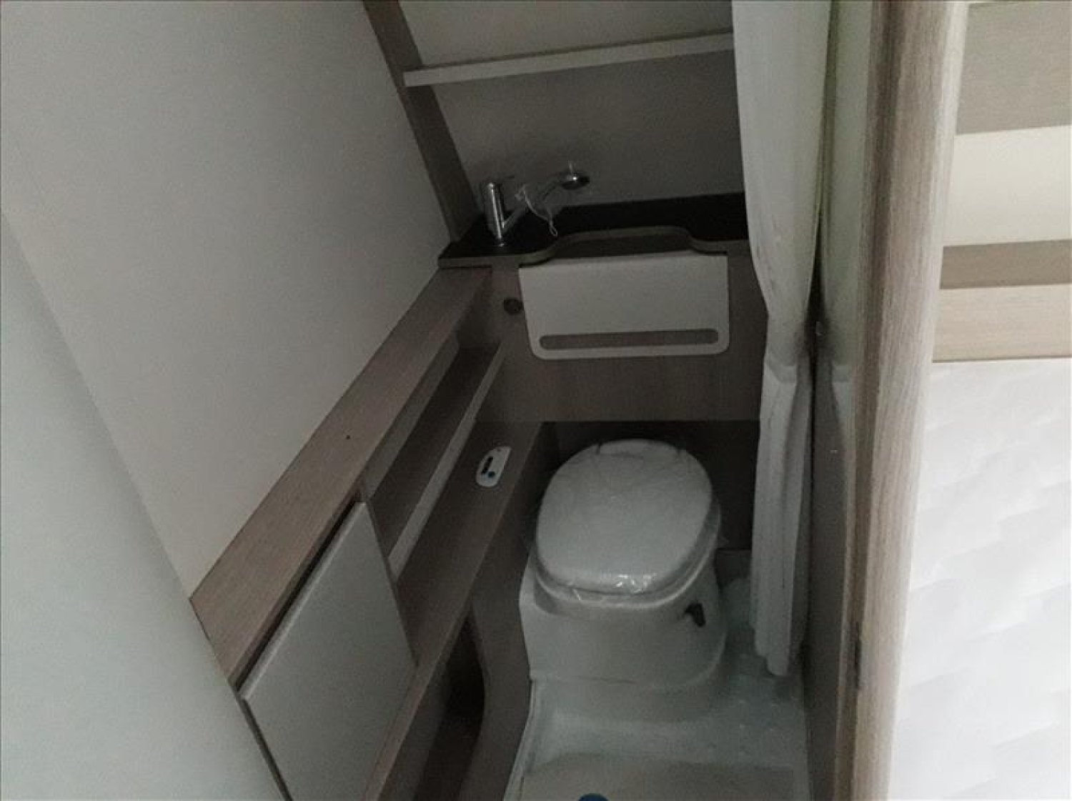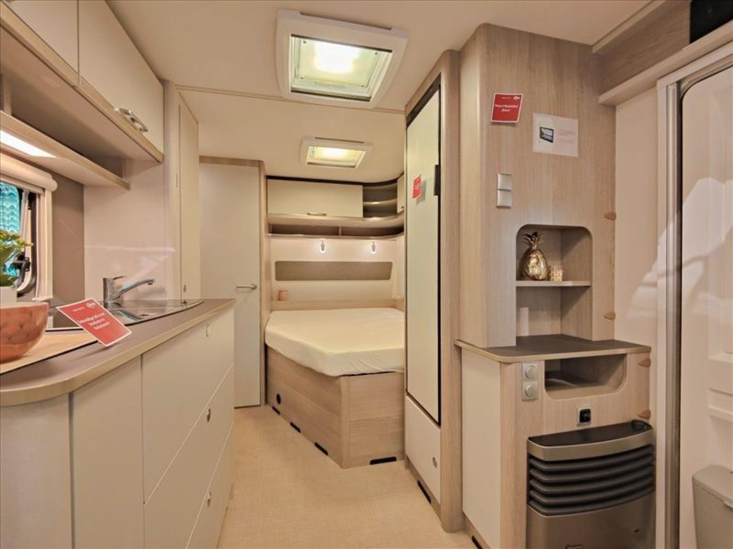 Support de roue de secours dans le coffre à gaz, Eclairage LED 12v / 230 V, Poubelle intégrée à la porte d'entrée, Stabilisteur, Tiroir de cuisine à rappel automatique, Transformateur 350 VA, Vérins de stabilisation, WC cassette, Évier, cuisinière à gaz 3 feux avec allumage électrique, Chauffage S 3004, Détecteur de fumée, Baie double vitrage ouvrantes teintées avec store, Chassis en acier galvanisé ultra-léger, Flexible de douche, Eclairage d'auvent à LED, Prises électriques 230V, Isolation du passage de roue, Porte d'entrée monobloc