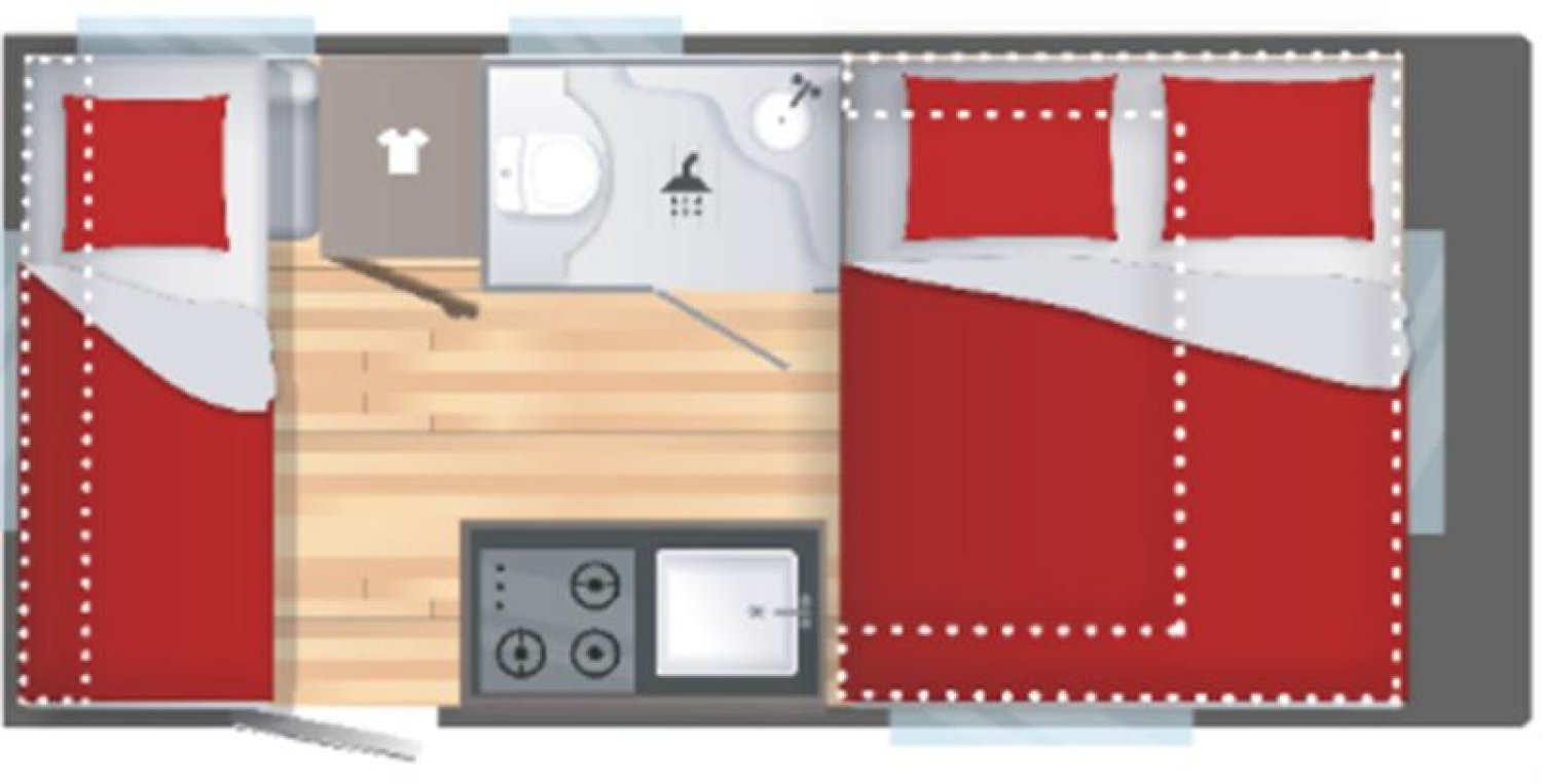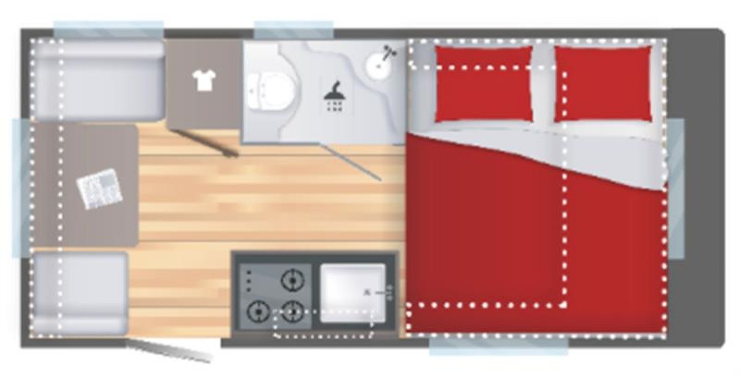Pack shower, Toit polyester, Réchaud 3 feux inox, Réfrigérateur trimixte (12V 230V GAZ) 85L, Solant rehausse, Sommier à lattes avec compas de maintien, Bac à douche, Baie arrière/avant, Baies ouvrantes double vitrage, Châssis et timons galvanisés, Compartiment bouteille à gaz, WC à cassette, Store combi occultant + moustiquaire, Suspension roues indépendantes avec amortisseurs, Parois latérales polyester, Transformateur 230/12V avec disjoncteur, Pré-équipement TV: prises antenne et 230V, Prises 230V x5, Eclaireur d'auvent LED, Cuve inox, Dînette arrière transformable en couchage 190x675, Eclairage intérieur LED, Jantes Aluminium, Lavabo d'angle, Levage du toit assisté par vérin à gaz, Spots de lecture LED prise USB, Lit avant permanent 149 x187, Freinage par inertie recul automatique, Meuble de rangement sous lavabo, Pack safety, Face avant polyester