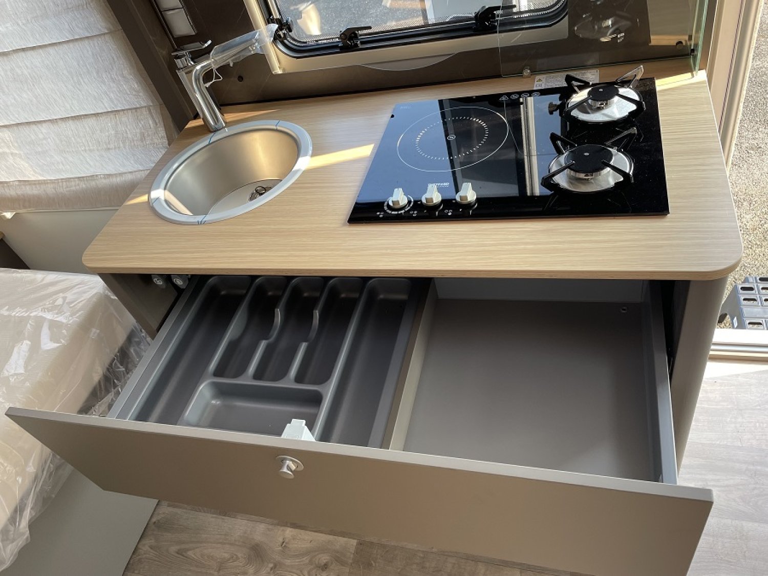 Caravane haut de gamme du constructeur allemand avec lit central.