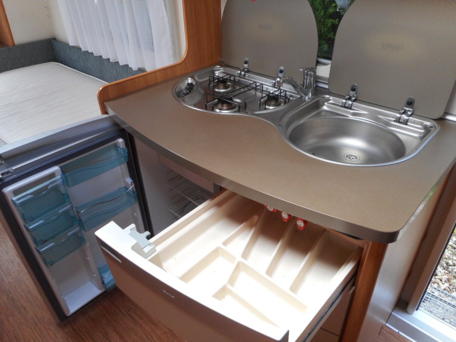 Cuisine avec 3 feux gaz, évier inox eau chaude et froide